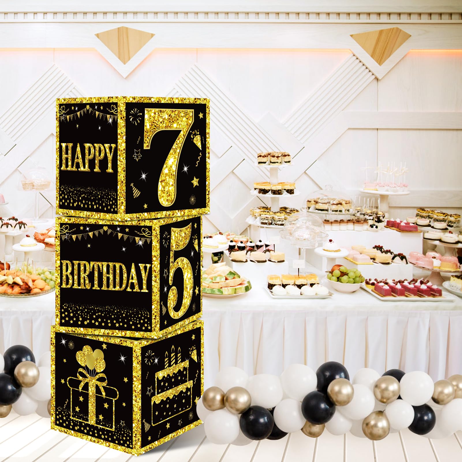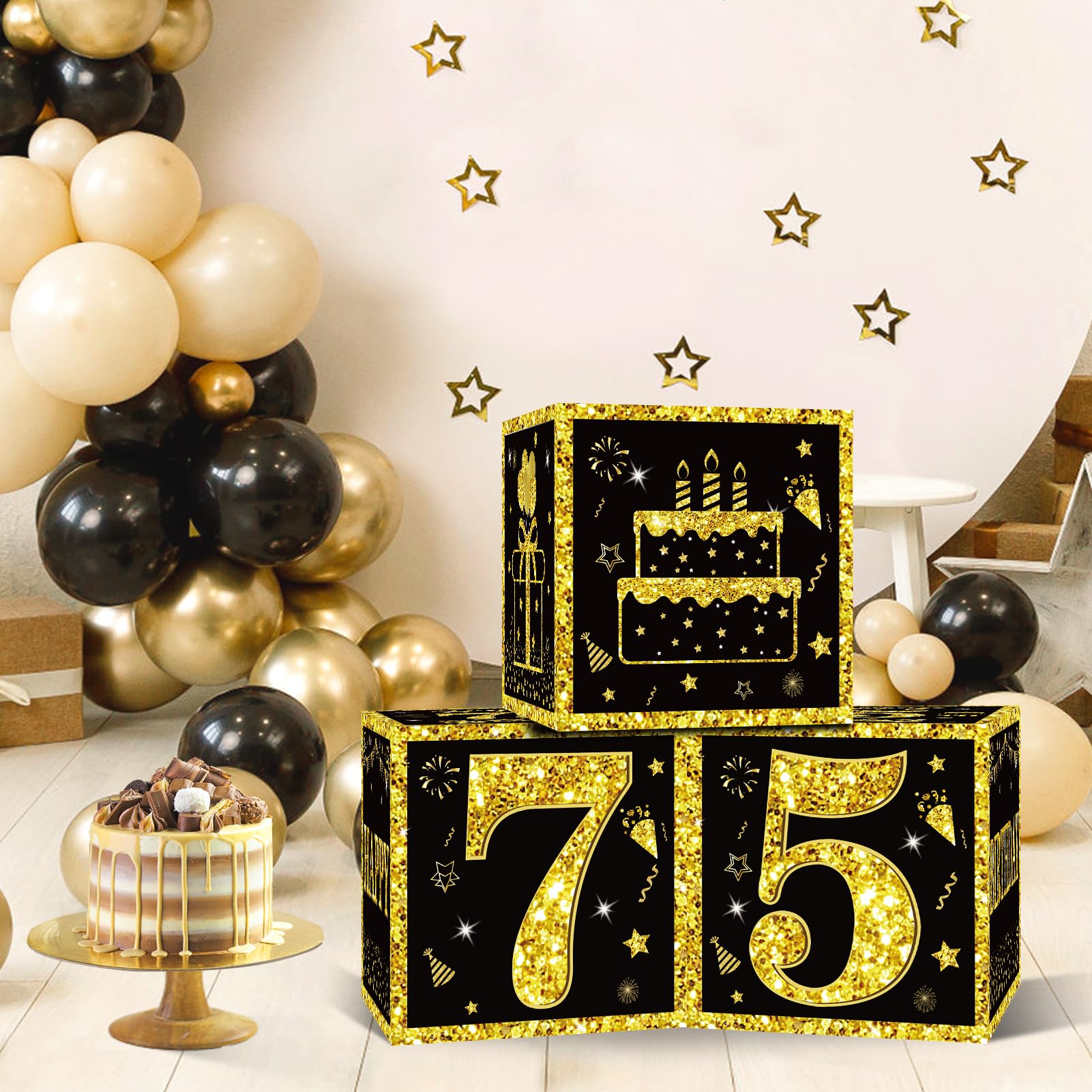 [You Will Receive] -3pcs black gold 75th birthday balloon boxes decorations, the size of each box is 10.62×10.62×10.62inch. This set of great 75th birthday party display decorations. (Note: This set of decorations does not include balloons).