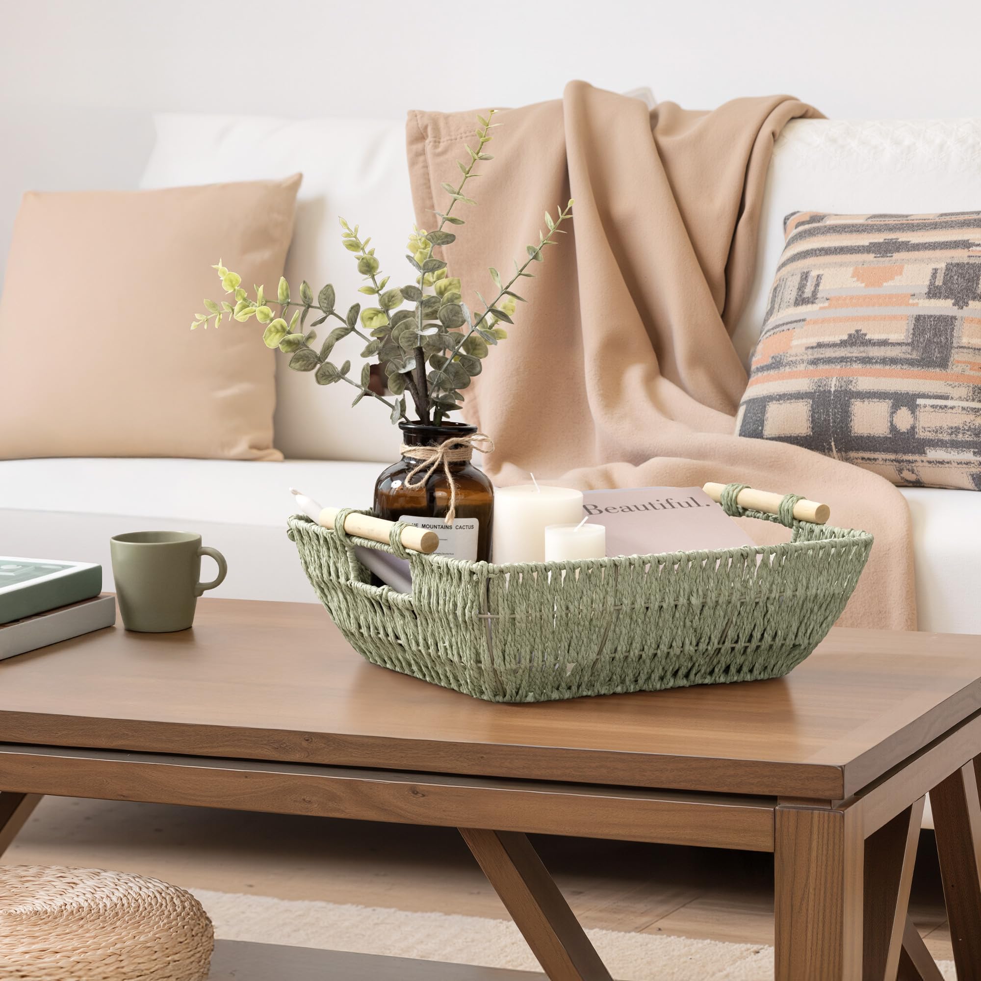 Decorative Baskets: With its minimalist design, this woven basket adds warmth and style to any space. Ideal for the living room, bathroom, or bedroom, it keeps your items organized while enhancing your home’s aesthetic.