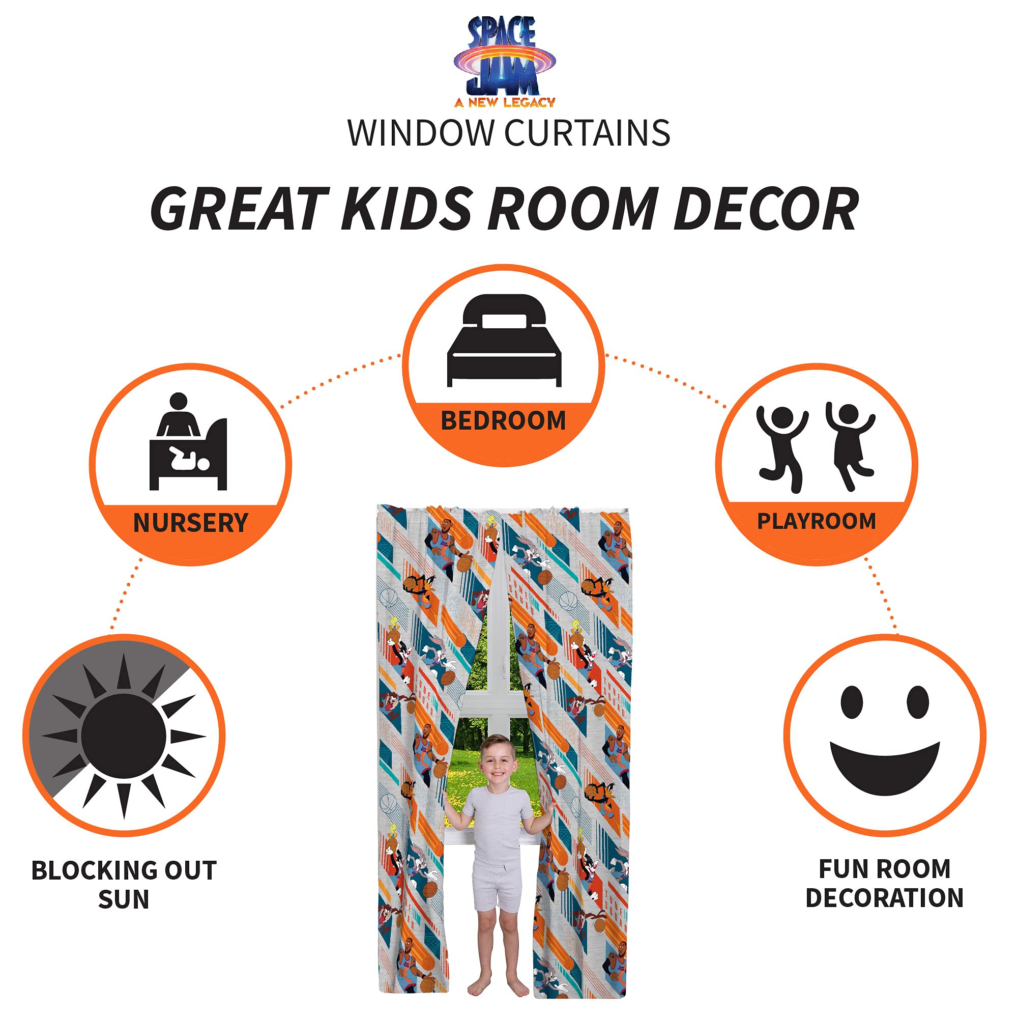 FUN ROOM DECORATION: A cool and colorful choice to brighten up a child’s bedroom, nursery or playroom, these kids’ curtains feature action-packed Space Jam 2 imagery your little Looney Tunes fan will love. The vibrant blue, orange and grey drapes add privacy and sporty style to the room of any young basketball fan.