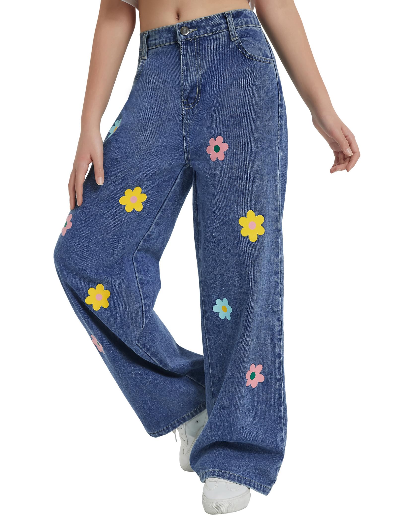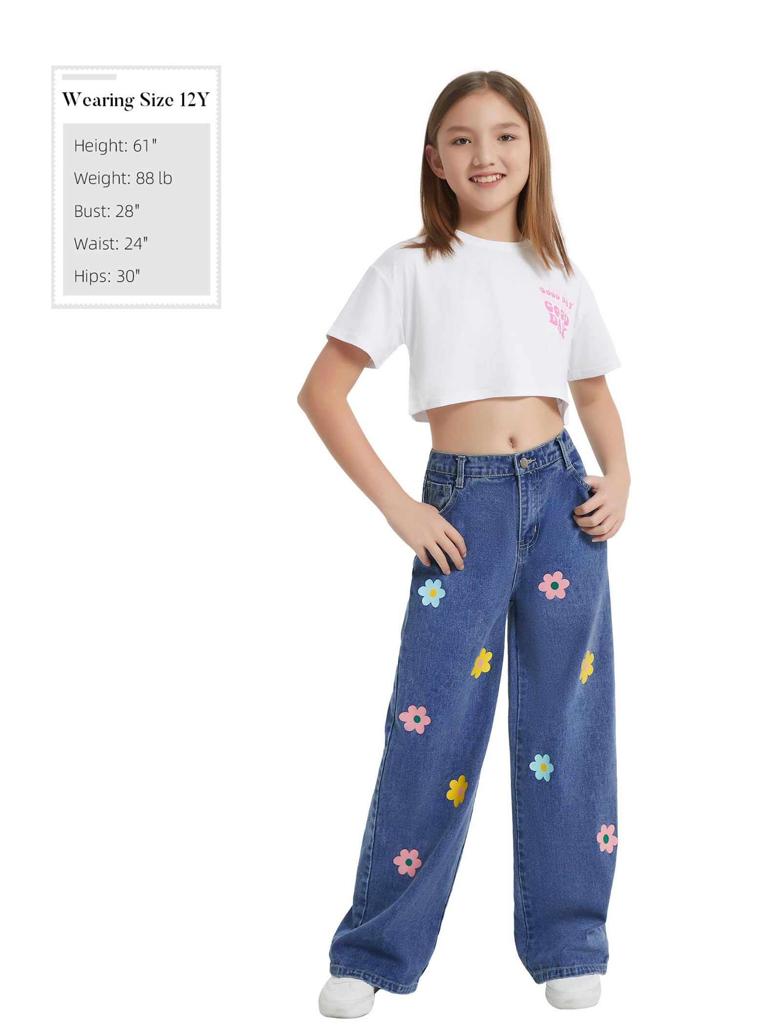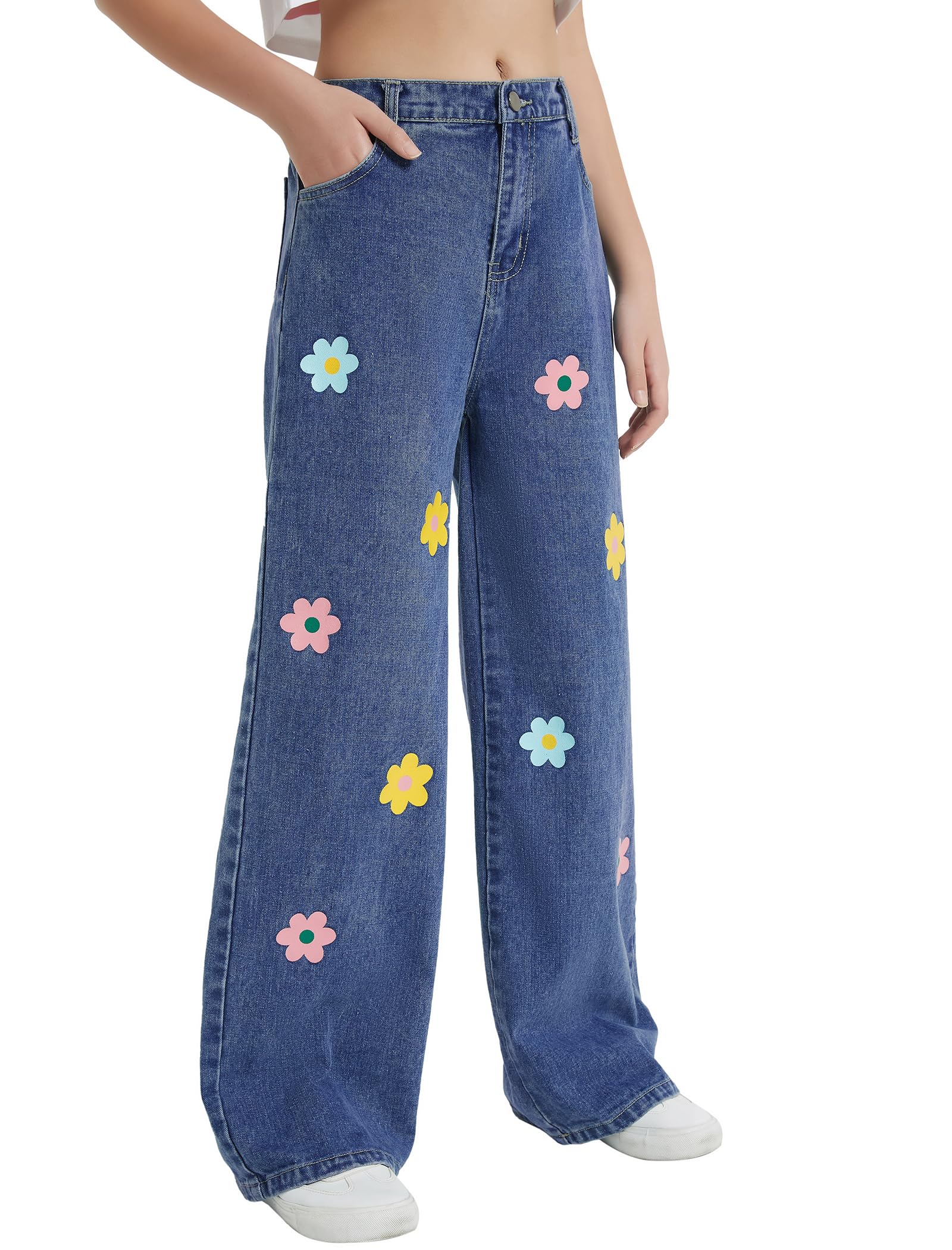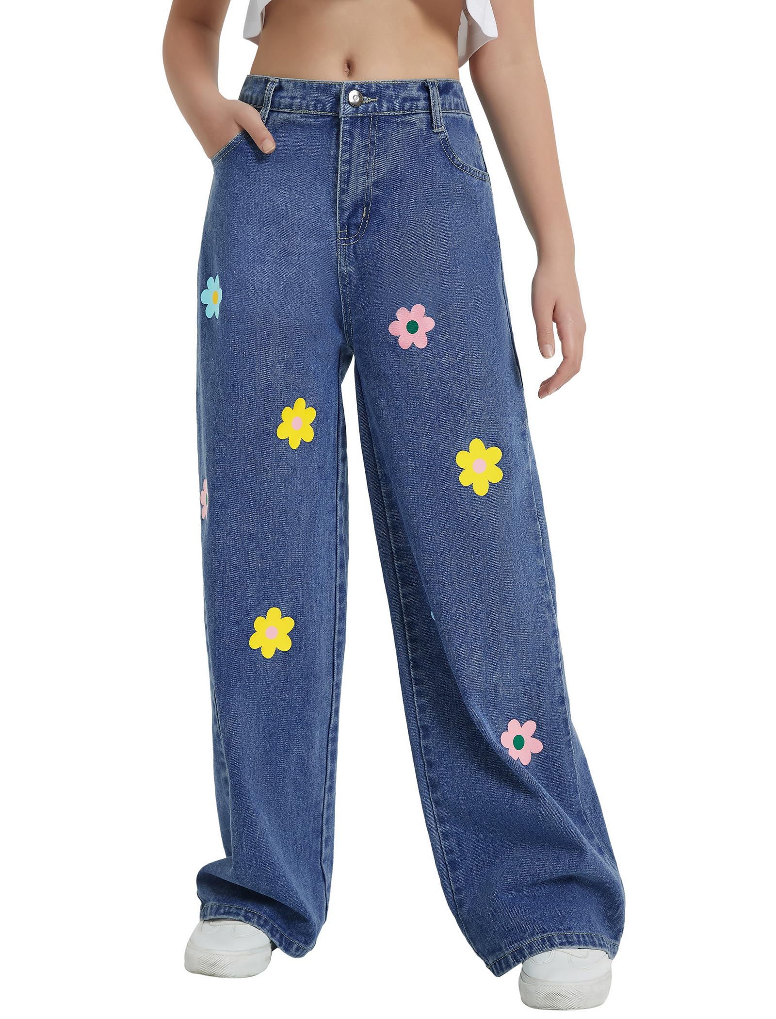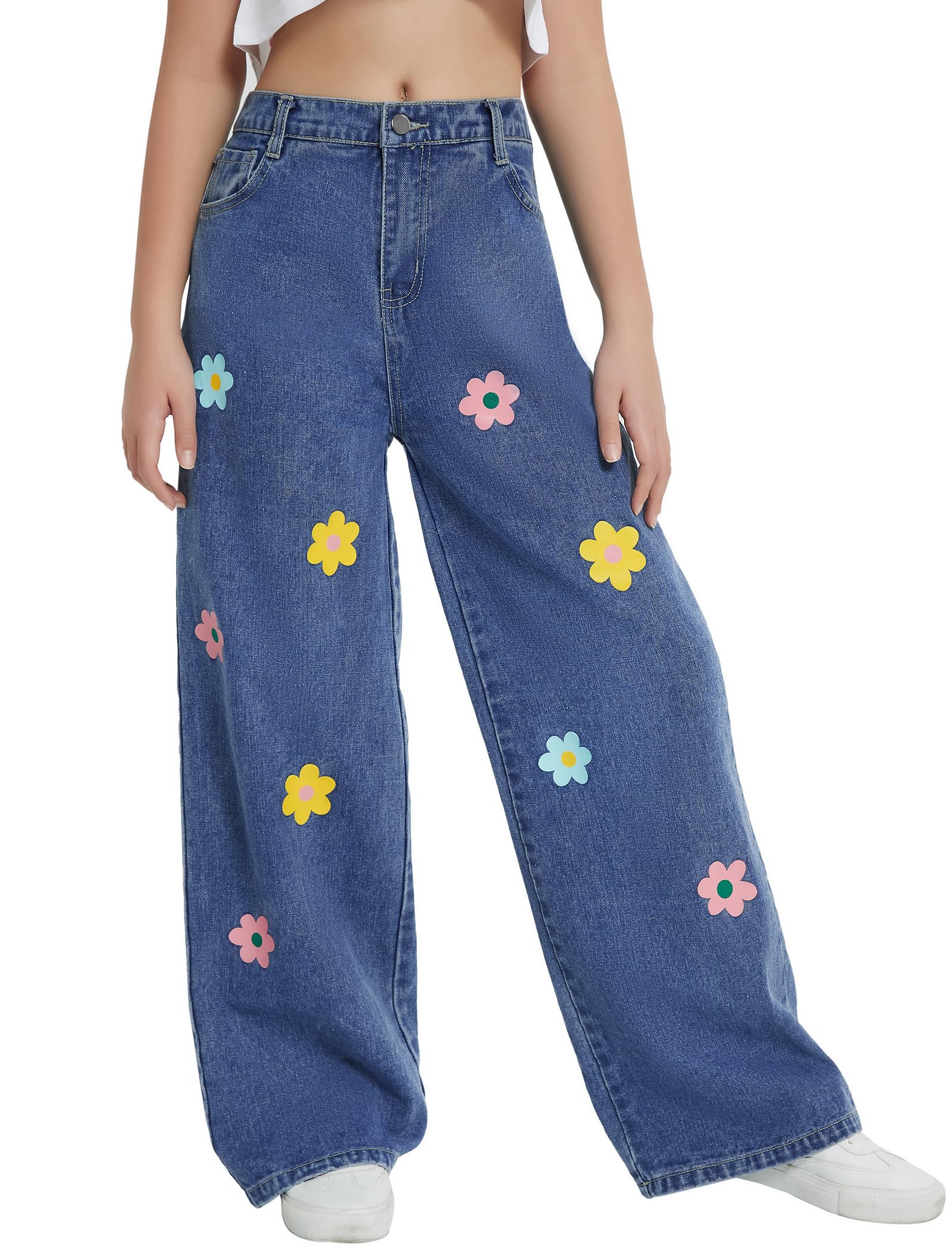 Floral Printed Jeans: Girl's wide leg pants have a fluid silhouette and an elasticized waist. The high waisted relaxed fit allows girls of all shapes and sizes, and the ankle length accentuates the curves of the legs