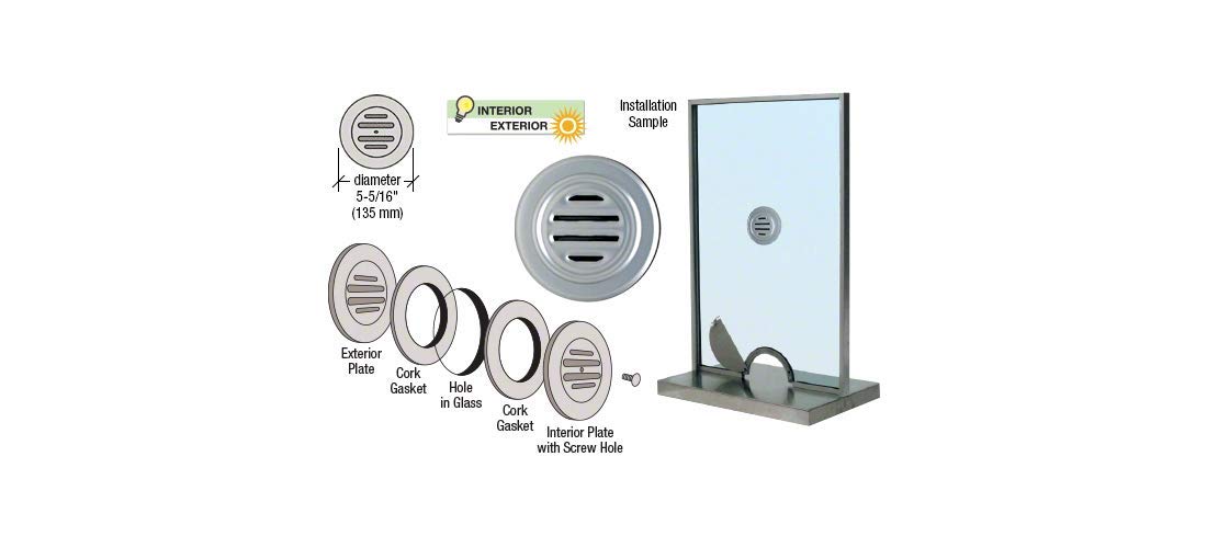 C.R. LAURENCE 834A CRL Satin Anodized Aluminum 5-5/16" No-Draft Speak-Thru. CRL No-Draft Speak-Thrus are designed to allow audible transmission of voice requests at ticket windows, box offices and more. They prevent tampering from the outside, and stop drafts to the interior. The 834 Series is made of aluminum. Each unit is individually boxed with gaskets and mounting screws for installation on glass up to 1/4 inch (6 millimeter) thick. For thicker glass up to 3-3/4 inch (95 millimeters), you can use the optional four inch (102 millimeter) screws Cat. No. 8324. CRL No-Draft Speak-Thrus require a minimum hole diameter of 2-1/4 inch (57 millimeter), and will cover holes up to 4-1/4 inch (108 millimeter). Recommended hole diameter is 3-1/2 inch (89 millimeter)..