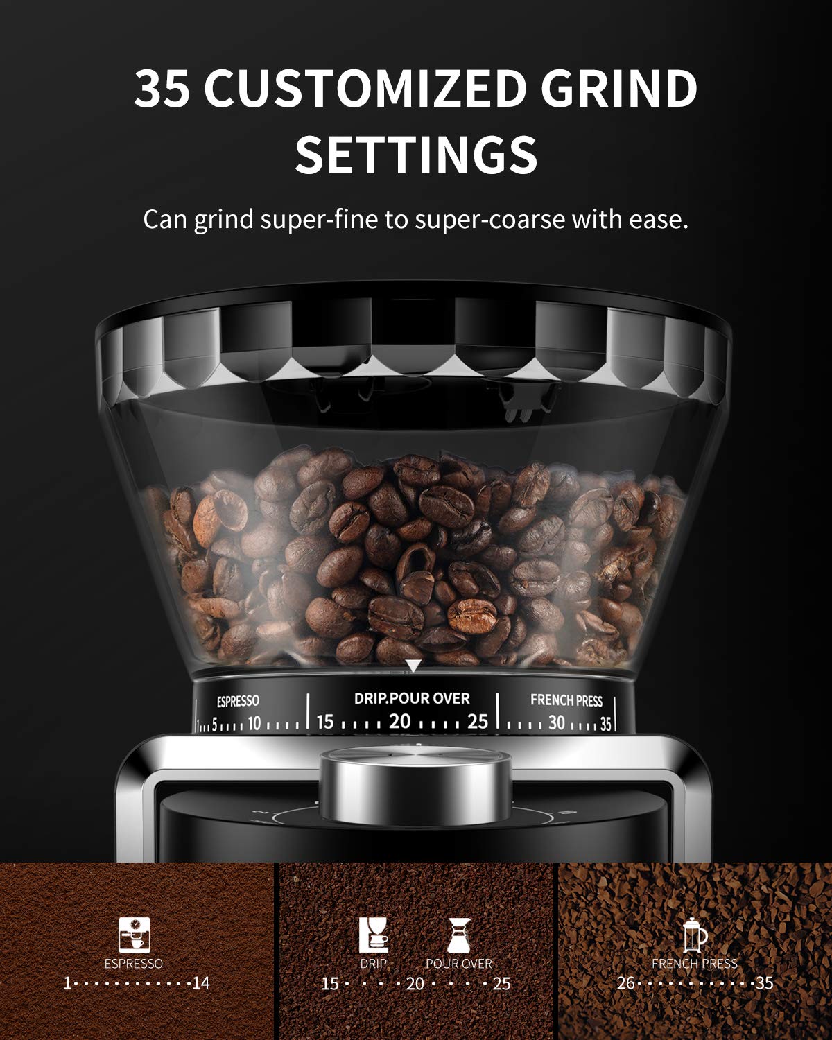 35 Precision Grinding: Adjustable burr grinder with multiple grind size settings from fine to coarse, perfect for various brewing methods including espresso, drip, and French press