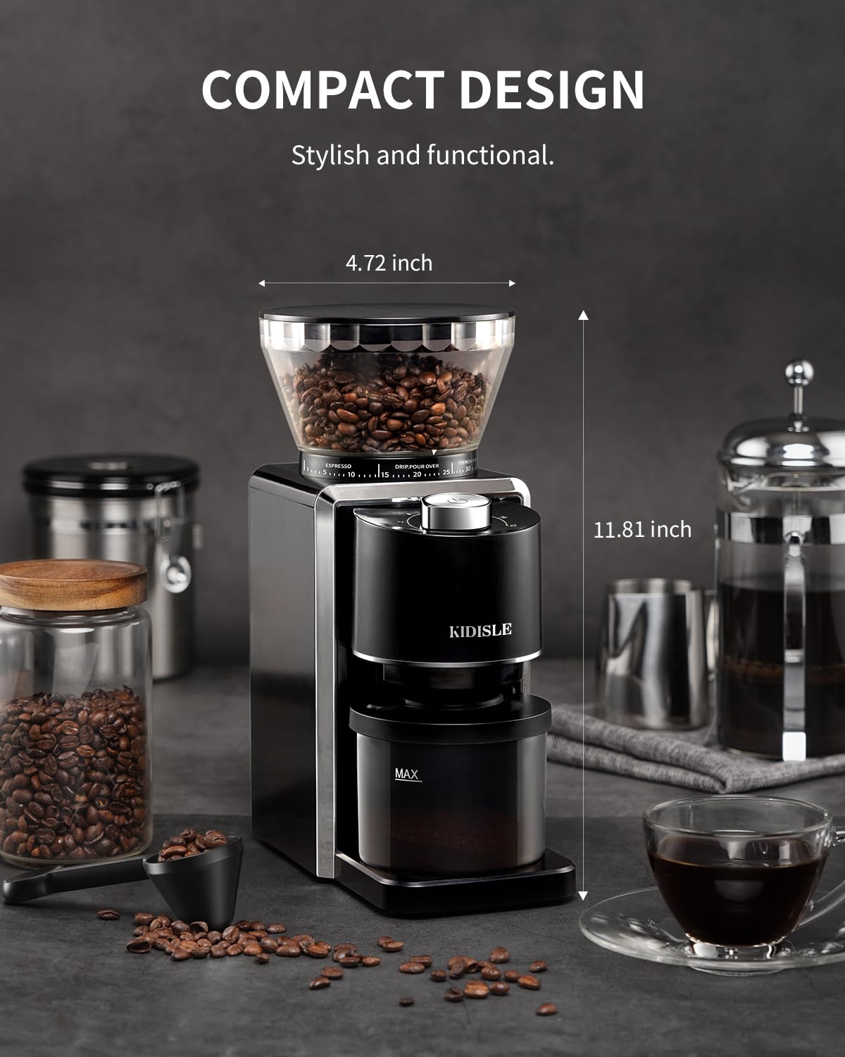 Capacity & Design: Large transparent bean hopper and ground coffee container lets you easily monitor the grinding process and coffee levels