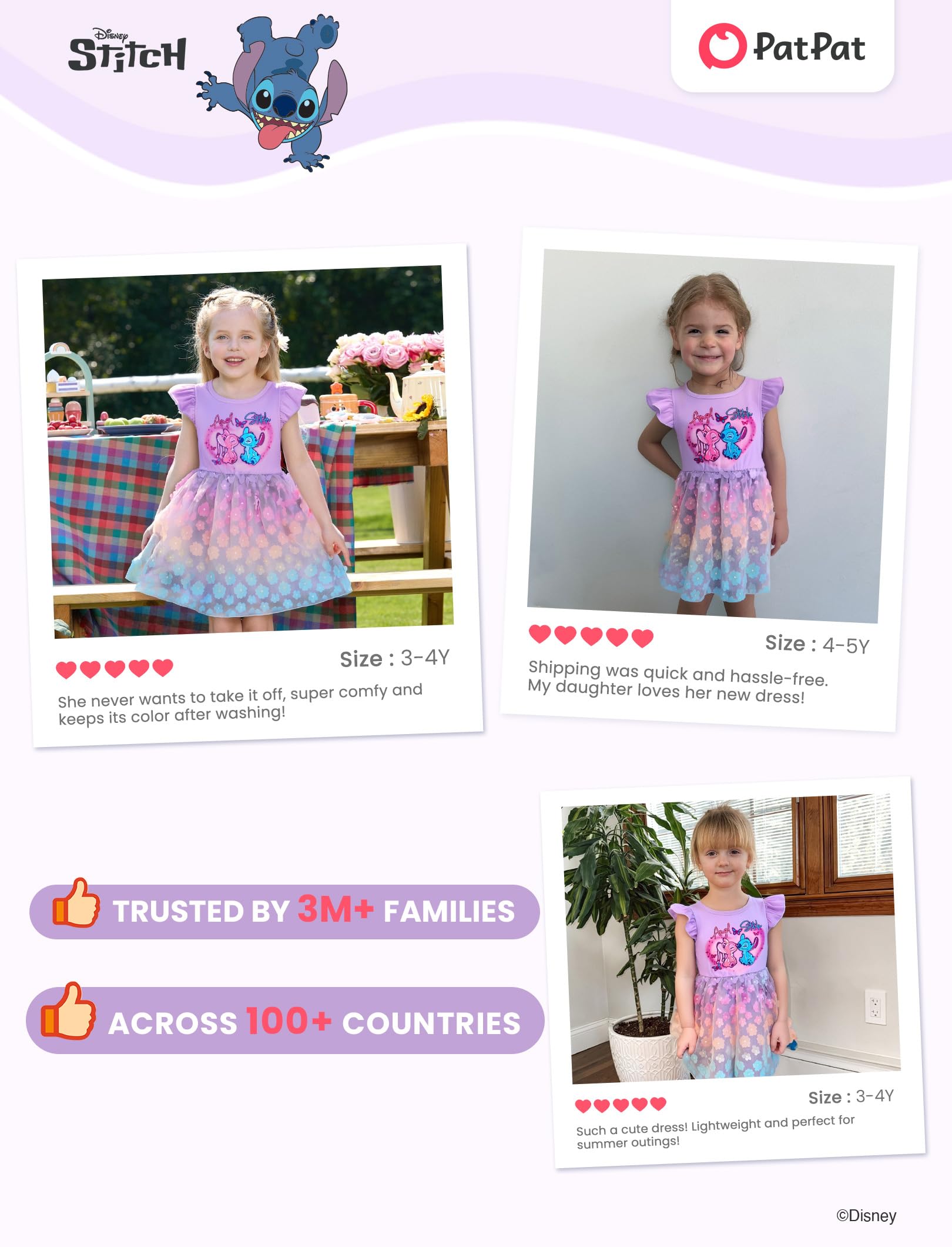 Charming & Unique Designs: This flutter-sleeve dress features a loose fit for comfort and practicality. The design showcases Stitch and Angel from Lilo & Stitch on a soft lavender background, paired with a pastel gradient tulle skirt adorned with 3D floral appliquΓ©s. With its fit-and-flare silhouette and breathable fabric, it ensures all-day comfort and a dreamy, playful look for little girls