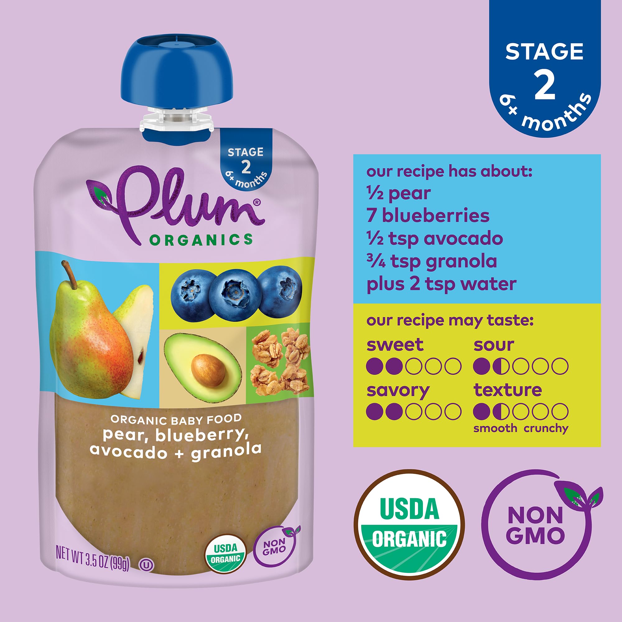 Baby Food for your Little Foodie. Plum Organics Stage 2 (6+ months) organic baby food pouches are made with blends of fruits, veggies, and ingredients that are perfect for exposing your little foodie to unique flavors, textures, and colors. Our Pear, Blueberry, Avocado, and Granola blend is made with non-GMO, organic ingredients for organic baby food that your baby will love. Plum Organics pouches are naturally preserved, unsalted, unsweetened, and kosher parve. And since our baby food pouches are convenient, portable, and resealable, you can customize portion sizes, whether you're at home or you need a simple snack on the go.