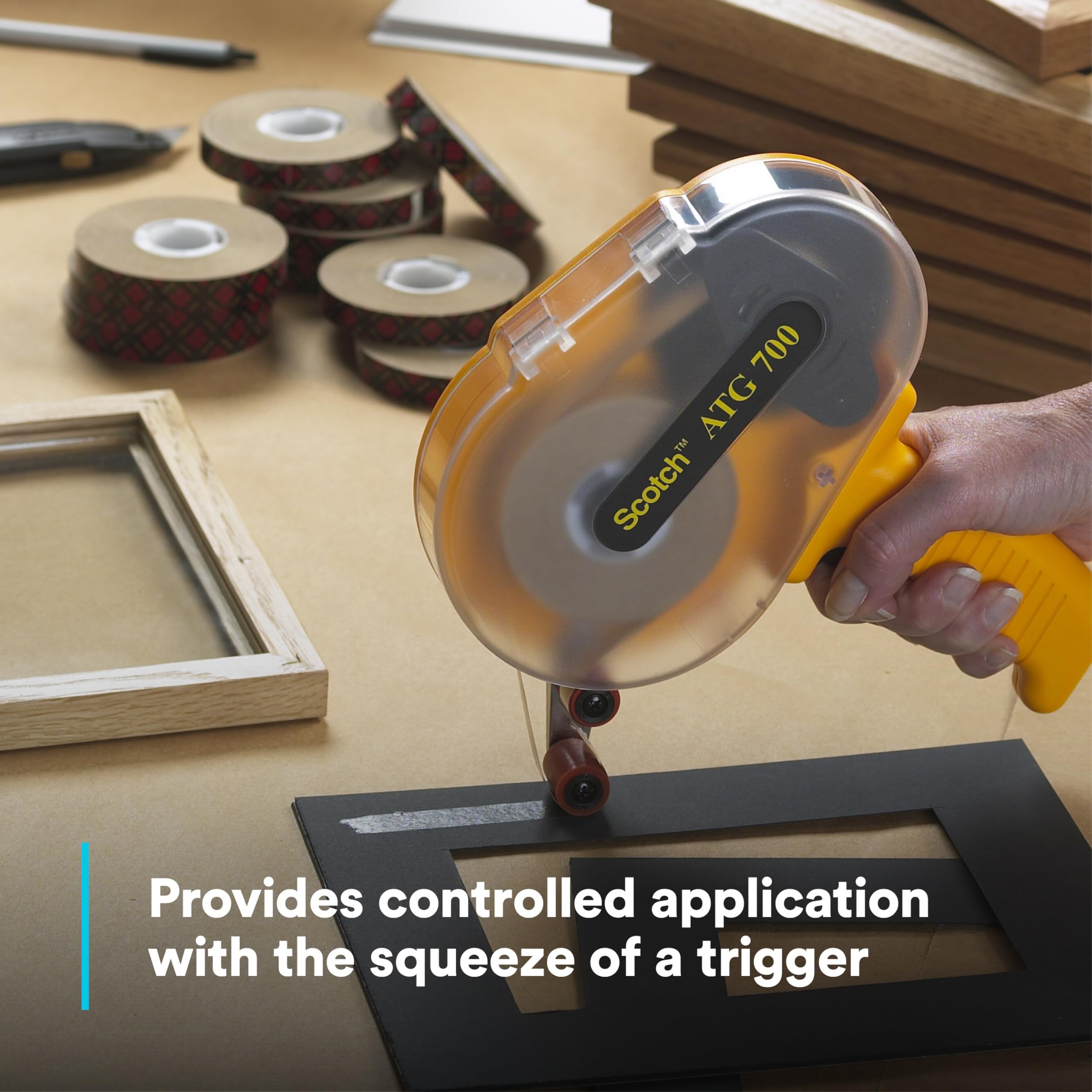 Product Description Provides Consistent Thickness with No Oozing, Glue Lines or Overspray Our Scotch ATG Adhesive Applicators offer a lightweight, portable, one-hand solution for applying adhesive transfer tape to metal, plastic, foam, paper and more. No preparation is necessary, and the applicators do not produce fumes, vapors or strong odors. Additionally, they provide consistent thickness with no mess from oozing, glue lines or aerosol-adhesive overspray. During use, the adhesive transfer tapeβs liner removes automatically and rewinds into the applicator. The adhesive system allows you to only use the necessary amount of tape, while providing an option for exchanging to new or previously used rolls of adhesives with different performance attributes. This applicator allows the use of 3/4" and 1/2" width rolls. The adapter enables the use of 1/2 inch (12mm) wide transfer tape when used with the ATG 700 Applicator. Transparent cases provide easy visual verification of the amount of tape inside while covered gears minimize applicator jams. Scotch ATG Adhesive Applicators are ideal for use on small and medium assembly jobs as well as light and heavy duty industrial applications. Recommended Applications: Trim and molding attachment; Point of purchase and specialty packaging; Signage and graphics attachment; Appliance and automotive interior assembly; Commercial print assembly; Matting and picture framing; Fabric, foam and gasket attachment. Understanding the Scotch ATG System - Scotch ATG system has proven to be the go-to adhesive solution since the early 1970s. For light and heavy industrial applications, Scotch ATG Adhesive Applicators are known to be convenient, reliable, versatile tools capable of attaching a wide range of materials. As a portable, hand-held solution, our ATG Adhesive Applicators apply adhesive to any shape or form, instantly bonding large and small surfaces. With Scotch ATG Applicators, a touch of the finger triggers a quick, controlled application of Scotch ATG Transfer Tape at the same time as the liner rewinds into the applicator. There is no mess and no cleanup. 3M advanced acrylic adhesive bonds on contact and is formulated with a choice of properties including high temperature resistance, acid free, general purpose and high initial adhesion. The Scotch ATG Adhesive Transfer Tape System is a cost effective and more productive replacement to many double-sided tapes, tape applicators, as well as adhesive dots, staples and liquid adhesives. This applicator allows the ATG tape liner to rewind into the applicator as the adhesive is applied for hassle-free operation that eliminates messes and clean-up. From the Manufacturer Yellow adhesive applicator for use with Scotch(R) ATG Tape 1/2 inch or 3/4 inch wide rolls. Covered gears minimizes applicator jams. Transparent cover shows remaining tape. Holds up to 60 yd (55m) of Scotch(R) ATG Tapes.