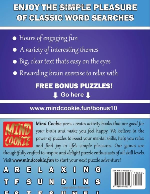 🌈 Enjoy the Timeless Fun of a Classic Word Search! Put your feet up, grab a pen, and enjoy hours of fun with this BIG large-print word search collection. Inside you’ll discover over 100 engaging puzzles with themes drawn from history, art, nature, science, and popular culture—along with lighthearted topics that celebrate everyday joys, from favorite foods and music to the beauty of a sunrise. Why You'll Love It: • 🔴 100+ Puzzles for endless entertainment • 🟠Full-Page Format—one puzzle per page • 🟡 Large-Print Letters for easy reading • 🟢 Fun, Family-Friendly Themes everyone can enjoy • 🔵 Complete with Solutions in the back of the book • 🟣 A Thoughtful Gift for parents, friends, ESL learners, or homeschoolers Designed for relaxation and ease of use, this book is perfect for quiet evenings at home, homeschool enrichment, or as a handy travel companion wherever you go.