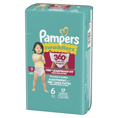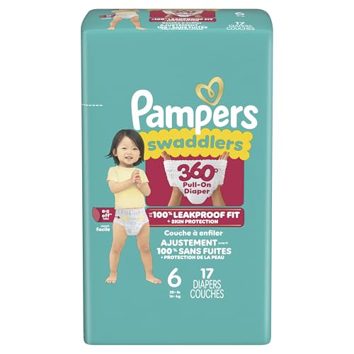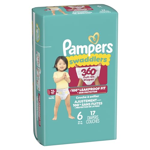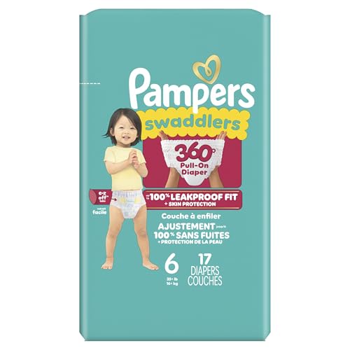 The Pampers Swaddlers 360° comfy, dry protection you know and love just got updated—with E-Z Off tabs for even easier changes. Featuring ultrasoft absorbent layers and Dual-Leak Guard Barriers that help protect where leaks happen most, these diapers provide up to 100% leakproof skin protection for your little one! From the #1 Pediatrician Recommended Brand*, Pampers Swaddlers 360° are designed to support your toddler’s movement from crawling age to standing age with a 360-degree stretchy waistband. The new EZ-off tabs make changes stress-free and mess-free—whether your little one is lying down or standing up—just tab off, wrap up, and pull on a fresh diaper pant. Swaddlers 360° toddler diapers offer trusted protection you can count on: they’re hypoallergenic, dermatologically tested, and free of parabens and latex. Plus, Dual LeakGuard Barriers and a blowout barrier help prevent up to 100% of leaks—even blowouts! To find your baby’s ideal Comfy Dry Fit, just measure by weight and reference our available baby diaper sizes: • Size 3 diapers (16–28 lbs.) • Size 4 diapers (22–37 lbs.) • Size 5 diapers (27+ lbs.) • Size 6 diapers (35+ lbs.) • Size 7 diapers (41+ lbs.) Pair Pampers Swaddlers 360° with Pampers Sensitive Baby Wipes to help make changes quick, easy, and gentle on your baby’s skin. *Based on 2021 survey of U.S. and Canadian pediatriciansSwaddlers 360° pull on diapers offer our best skin protection for your baby! The waistband stretches comfortably around your baby's waist and adapts to their every move for a soft and comfy fit — no tape needed.