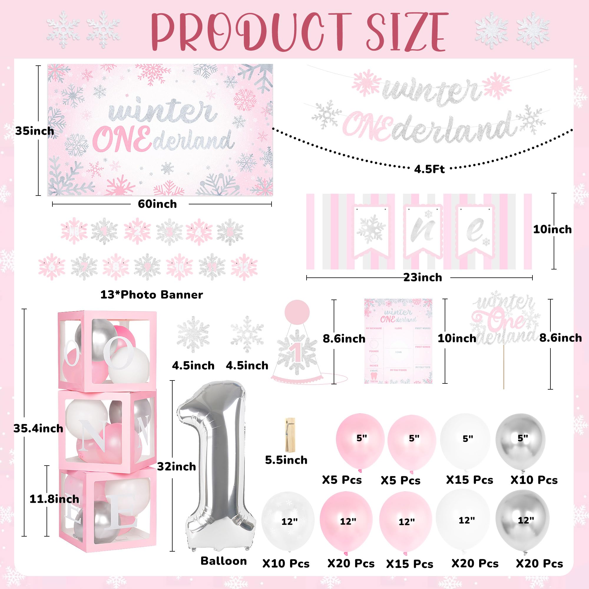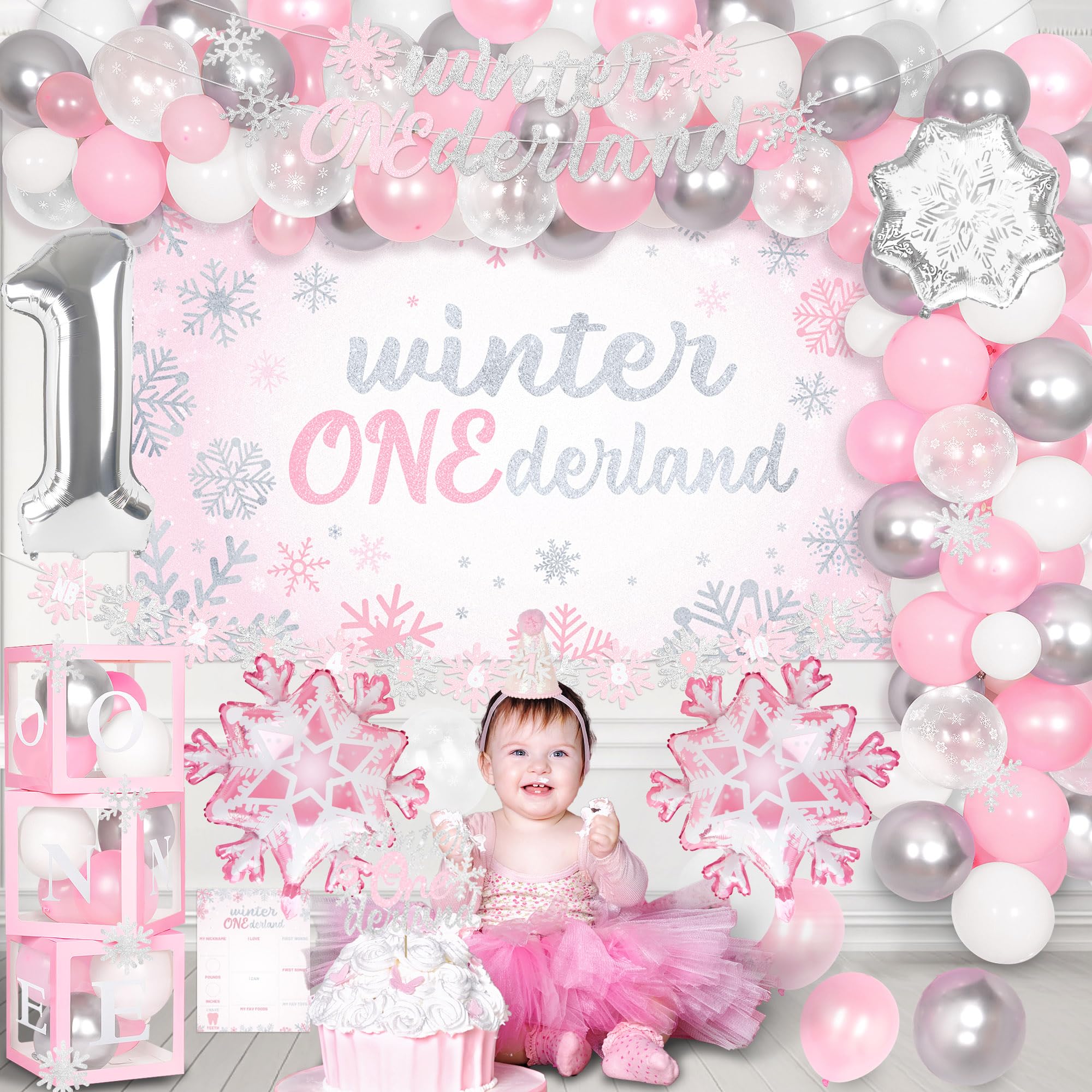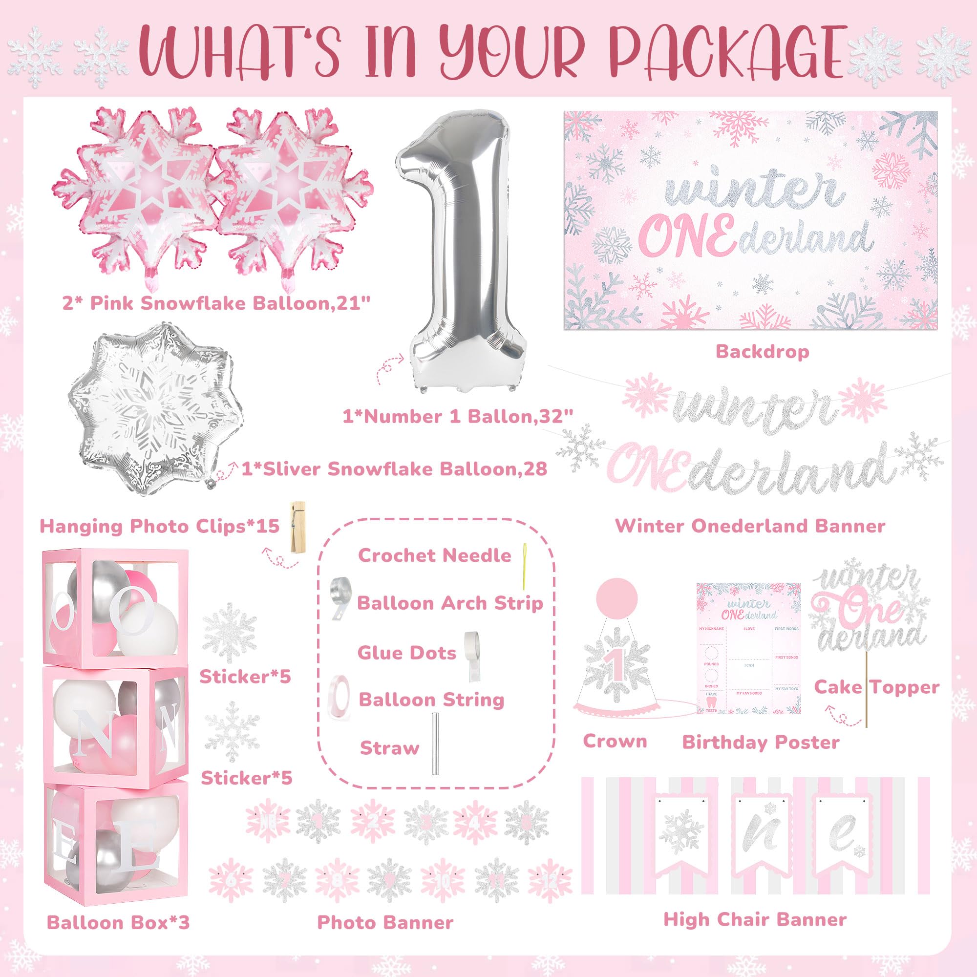 All in Winter Onederland First Birthday Party: You will get a complete set of winter onederland first birthday party supplies, including 120* latex balloons, 1* number "1" foil balloon, 2* pink snowflakes foil balloons, 1* sliver snowflakes balloons, 1* 1st winter onederland birthday backdrop, 3* balloon boxes (with “one” letters), 1* newborn to 12 months photo banner, 1* high chair banner, 1* birthday crown, 1* cake topper, 1* birthday Milestone Poster, 1* Birthday Banner, organize unforgettable 1st winter onederland birthday party for your girl
