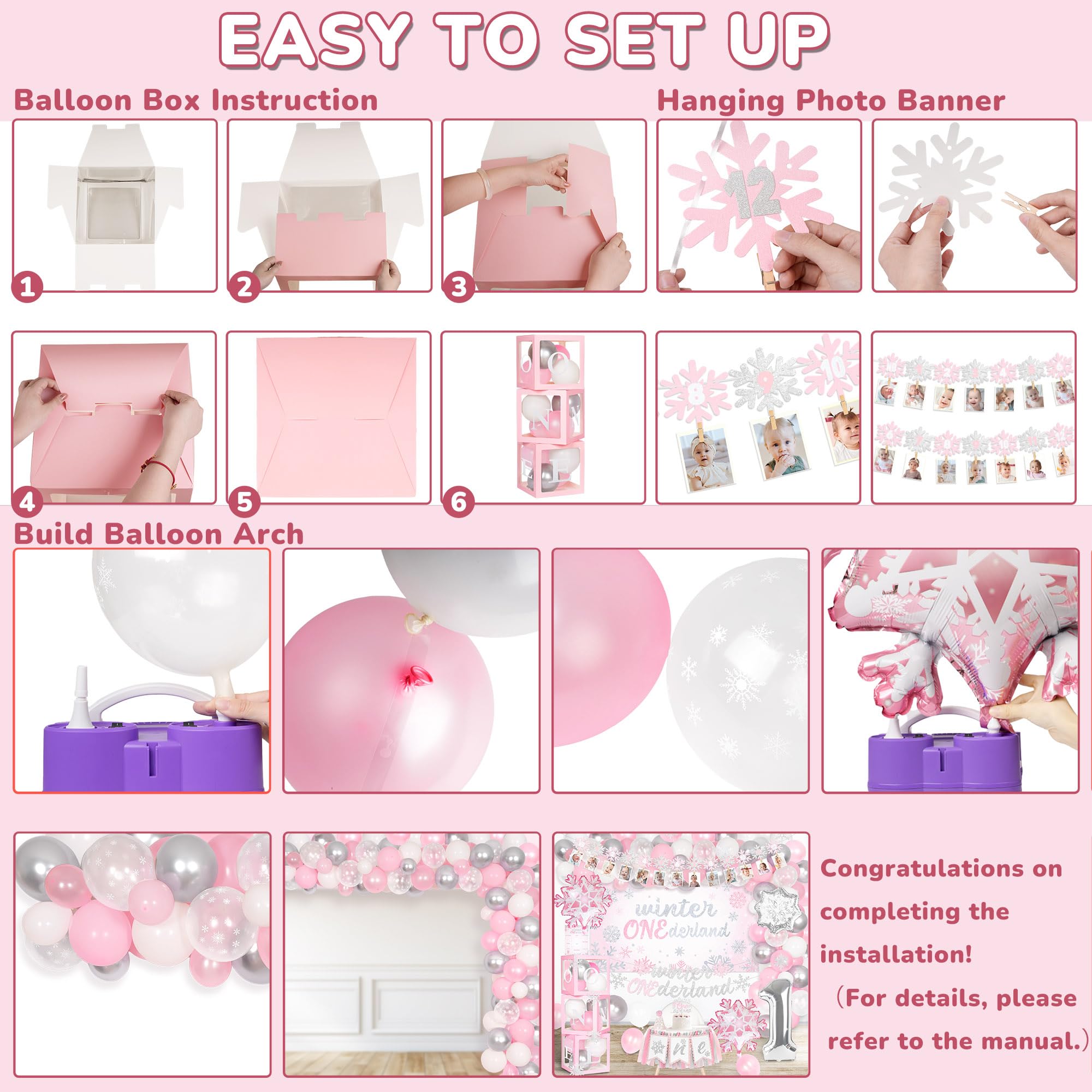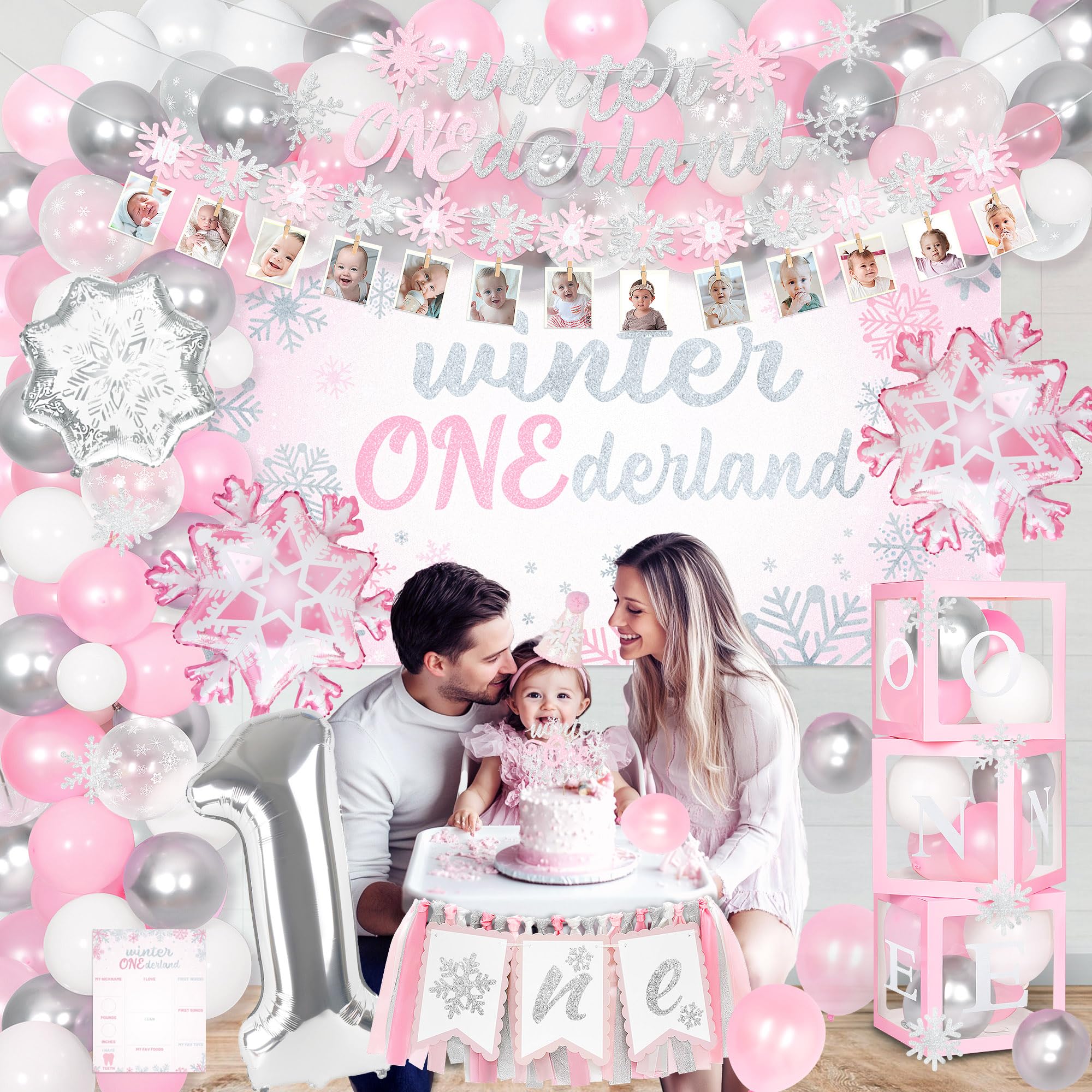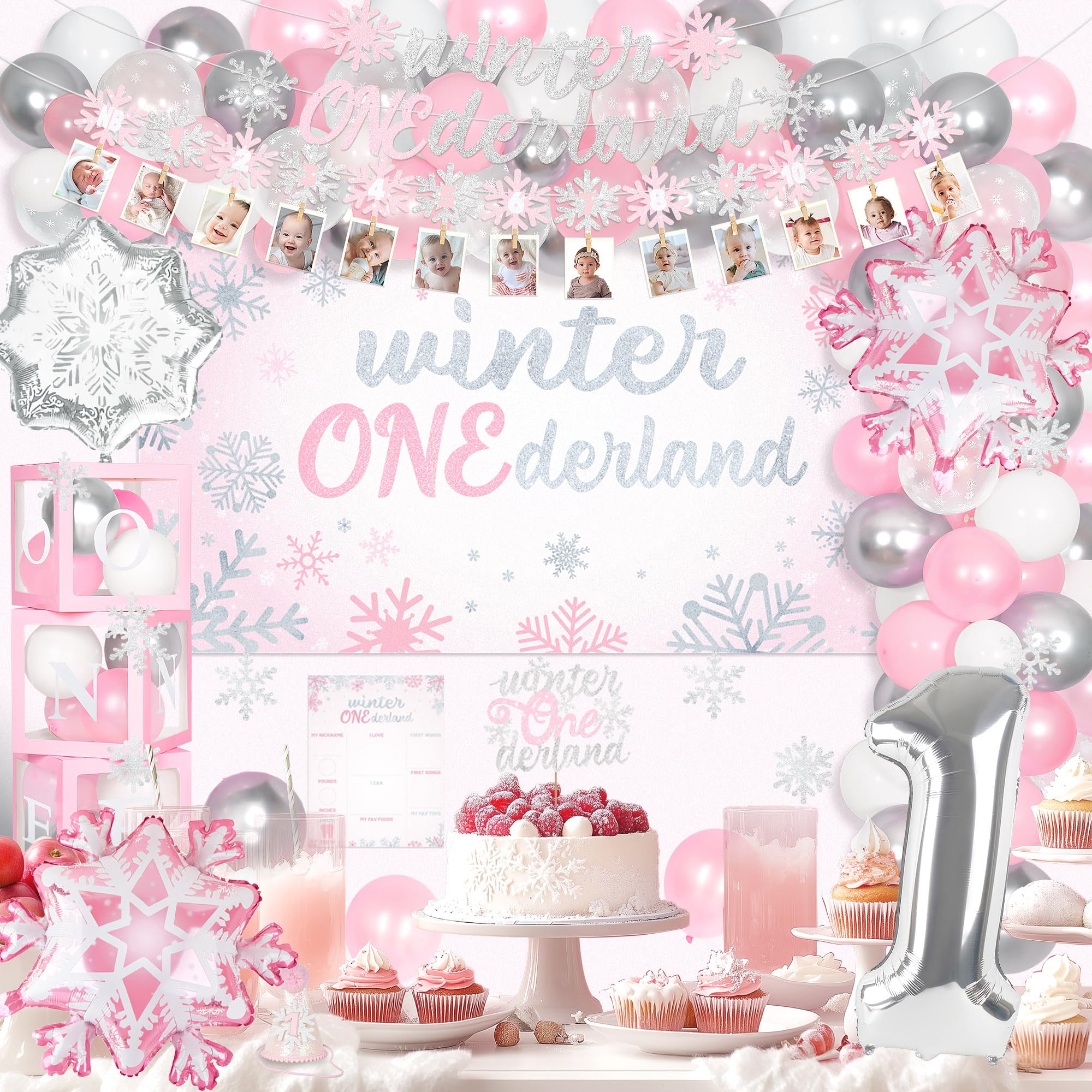 All in Winter Onederland First Birthday Party: You will get a complete set of winter onederland first birthday party supplies, including 120* latex balloons, 1* number "1" foil balloon, 2* pink snowflakes foil balloons, 1* sliver snowflakes balloons, 1* 1st winter onederland birthday backdrop, 3* balloon boxes (with “one” letters), 1* newborn to 12 months photo banner, 1* high chair banner, 1* birthday crown, 1* cake topper, 1* birthday Milestone Poster, 1* Birthday Banner, organize unforgettable 1st winter onederland birthday party for your girl