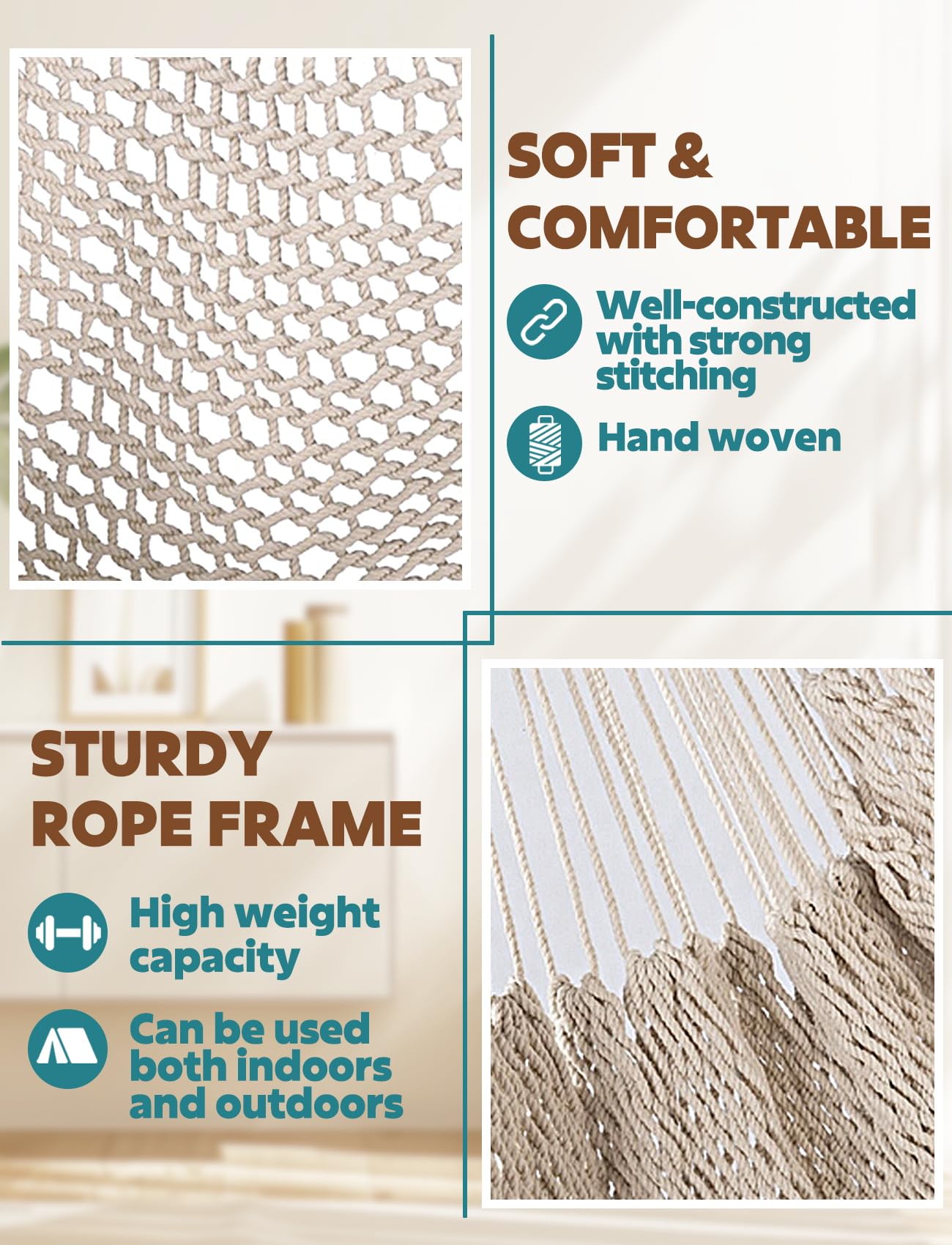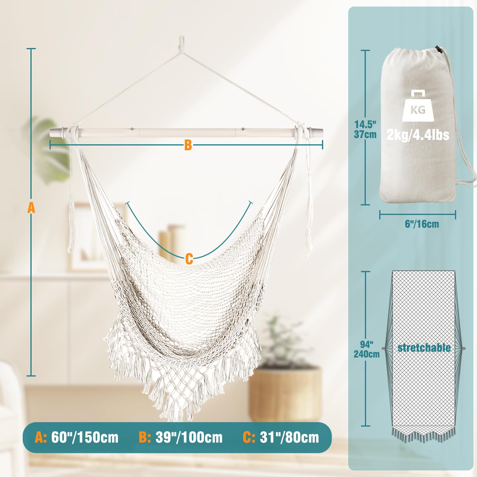 Design:Handcrafted from comfy and durable cotton ropes of the entire chair promise enjoyment and that is well-constructed with strong stitching and a sturdy frame to ensure safety and comfort.100 cm(3 1/3 ft) length wide spreader bar provides ample shoulder room.Extra long built in footrest to really stretch out .The mesh lets the cool breeze blow your body, breathable and cool.Anti-slip poles provide a stable and secure seating experience, preventing from slipping or sliding off the chair.
