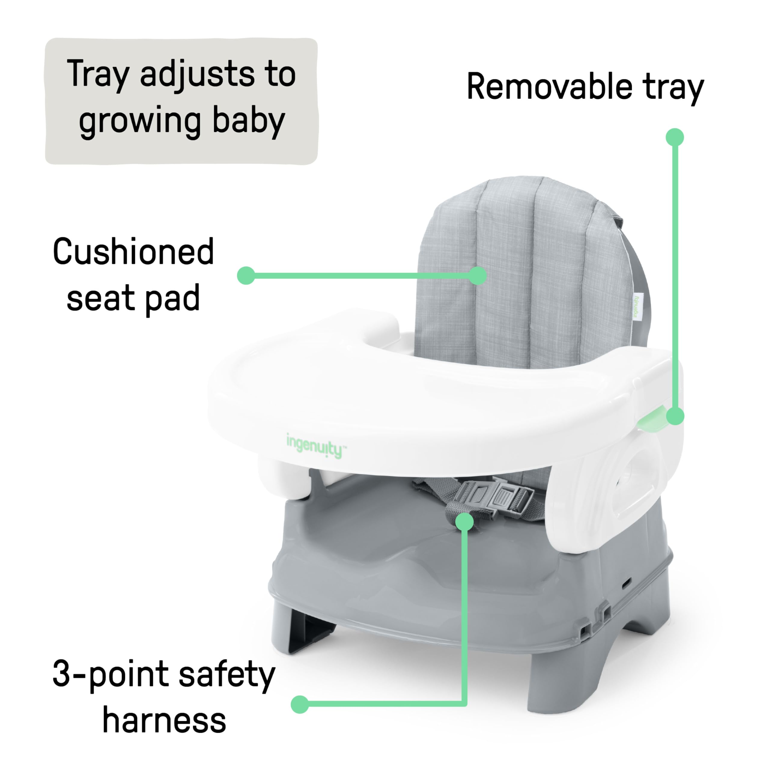 From grandma's house to your favorite restaurant to weekend trips, the Ingenuity Deluxe Comfort Folding Booster gives your little one a consistent, convenient, and comfortable seat at the table. This booster offers adjustable height positions, allowing it to grow with baby from 6 months all the way to 3 years old. The cushioned seat pad and adjustable tray give your little one comfort and support during mealtime or playtime. This booster also fits perfectly to most dining chairs and has a 3-point harness to keep your child secure. The seat pad and tray are both easy to remove and wipe clean. Straps can be removed and are machine washable. Wherever you go, your little one will be proud to call this seat their very own.