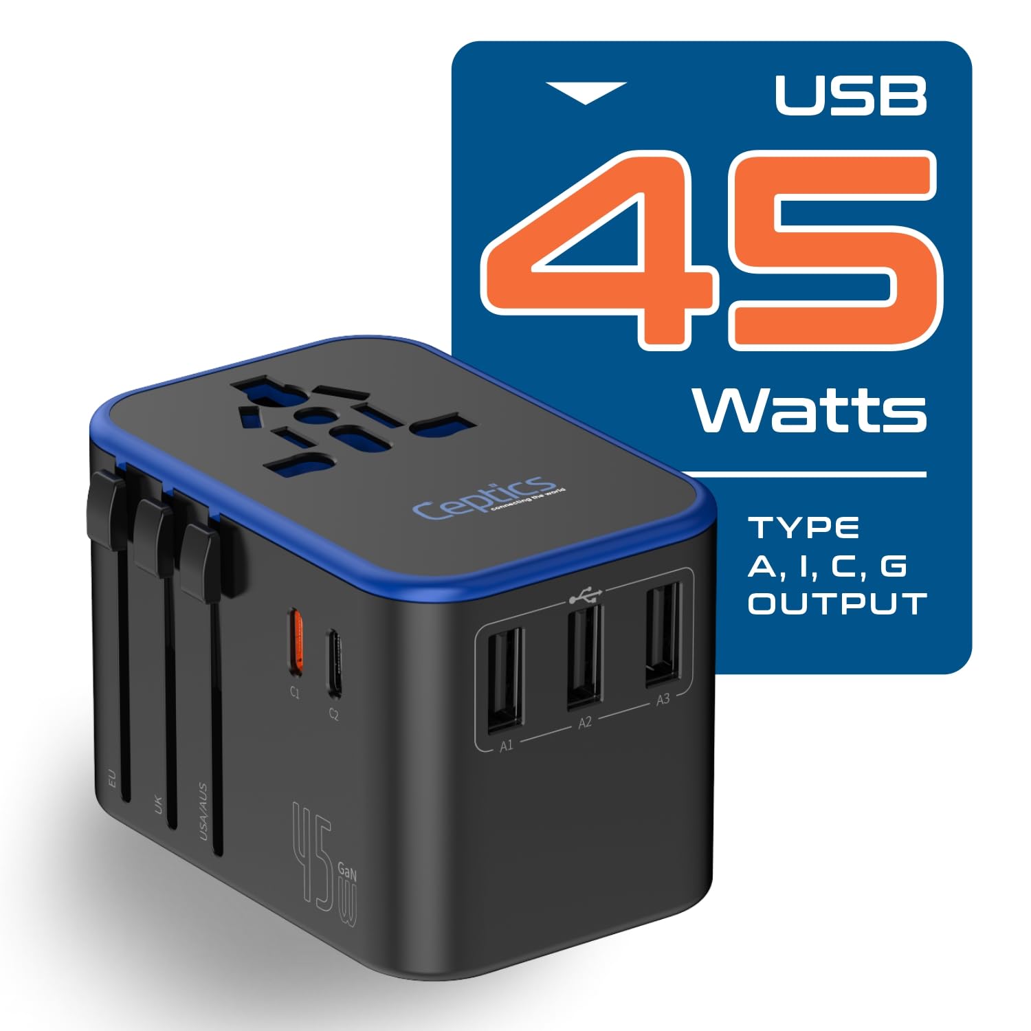 [Power 5 devices at once] Equipped with 1 universal input 3x USB-A (2 4a) & 2x USB-C (1 W/ power delivery & quick Charge 3 0) - Perfect for travel - 45W perfect for charging Fast use with cell phones iPhones max tablets iPads laptops & other devices anywhere in the world - few exceptions listed below