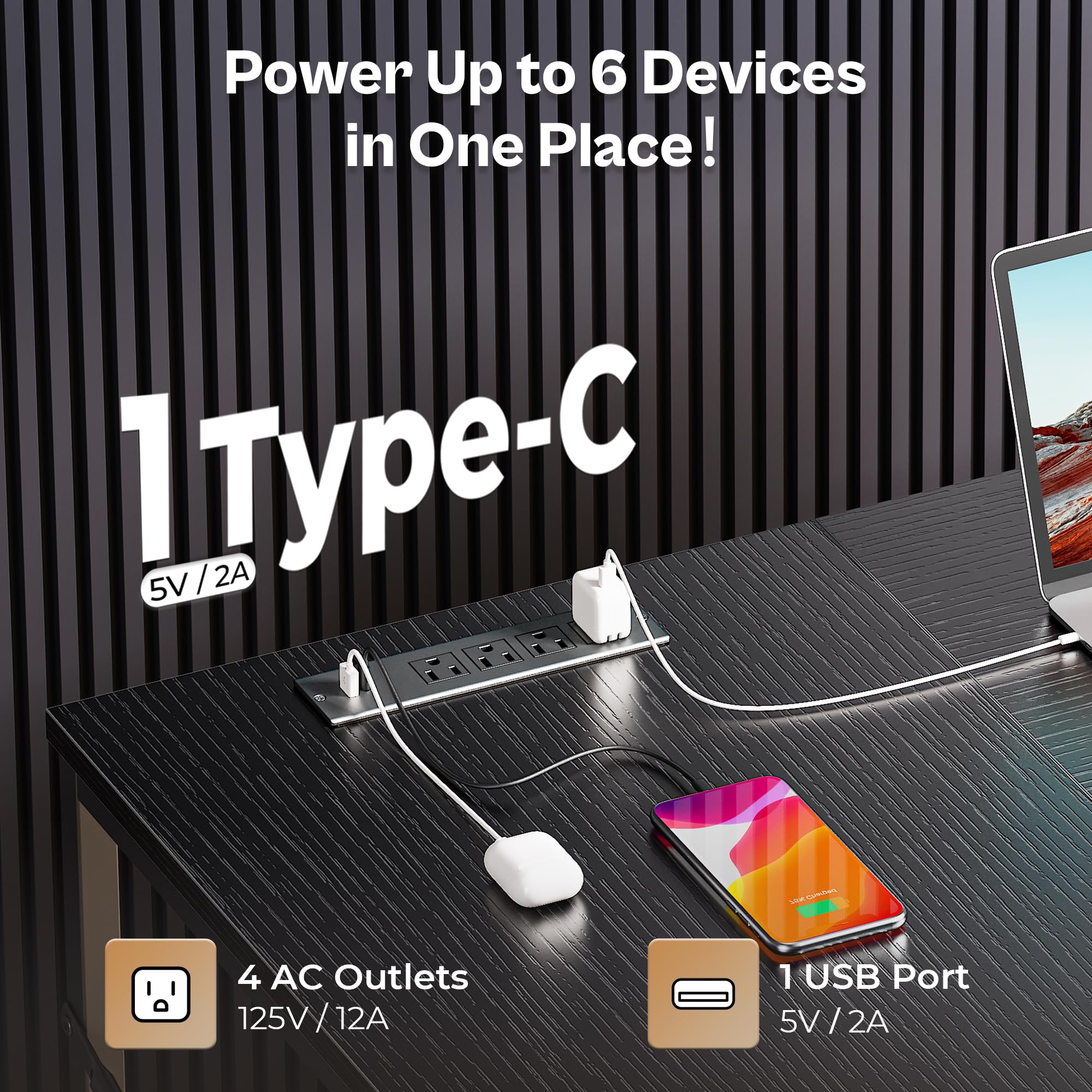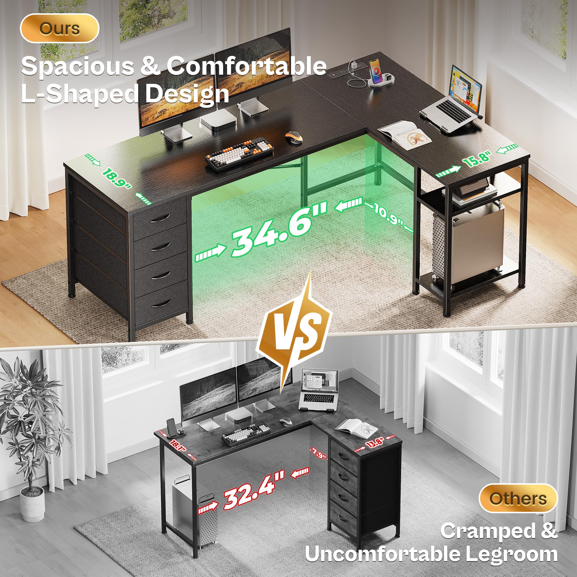【L Shaped Desk with Power Outlet】Built-in power outlet with 4 AC outlets, 1 USB port, and 1 USB-C port on the l shaped desk with drawers keeps your laptop, phone, tablet, desk lamp, and even a Bluetooth speaker all powered up, no more messy extension cords or crawling under the office desk