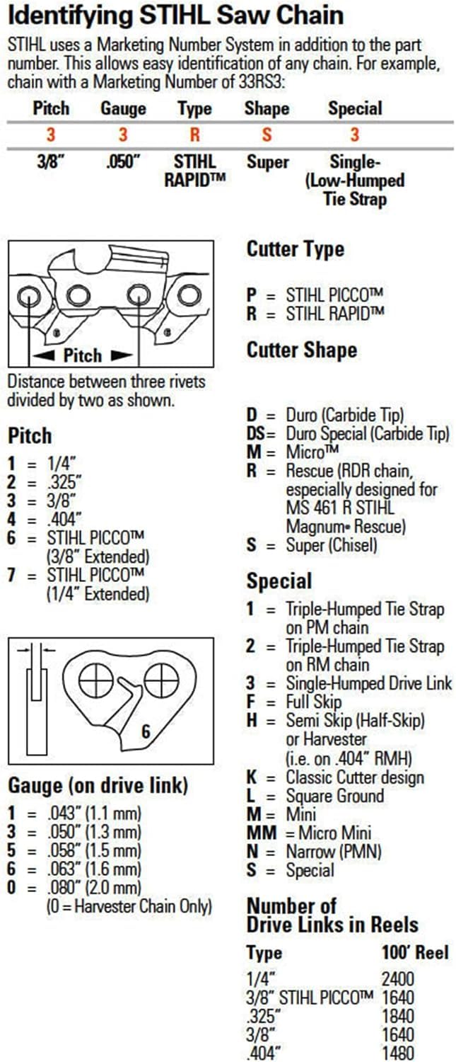 STIHL PICCO Micro Mini 3 saw chain is a low-kickback, narrow kerf, low-profile chain ideal for smaller chainsaws. It is very smooth-cutting and features lightweight cutters that allow more power to be available for cutting. This semi-chisel chain does not usually get dull as fast as full-chisel chain in normal use and is slightly easier to maintain and sharpen. It is specifically designed for corded electric-, battery- and gasoline-powered chainsaws or pole pruners with less than 1.5kW (2.0 bhp) of power output.