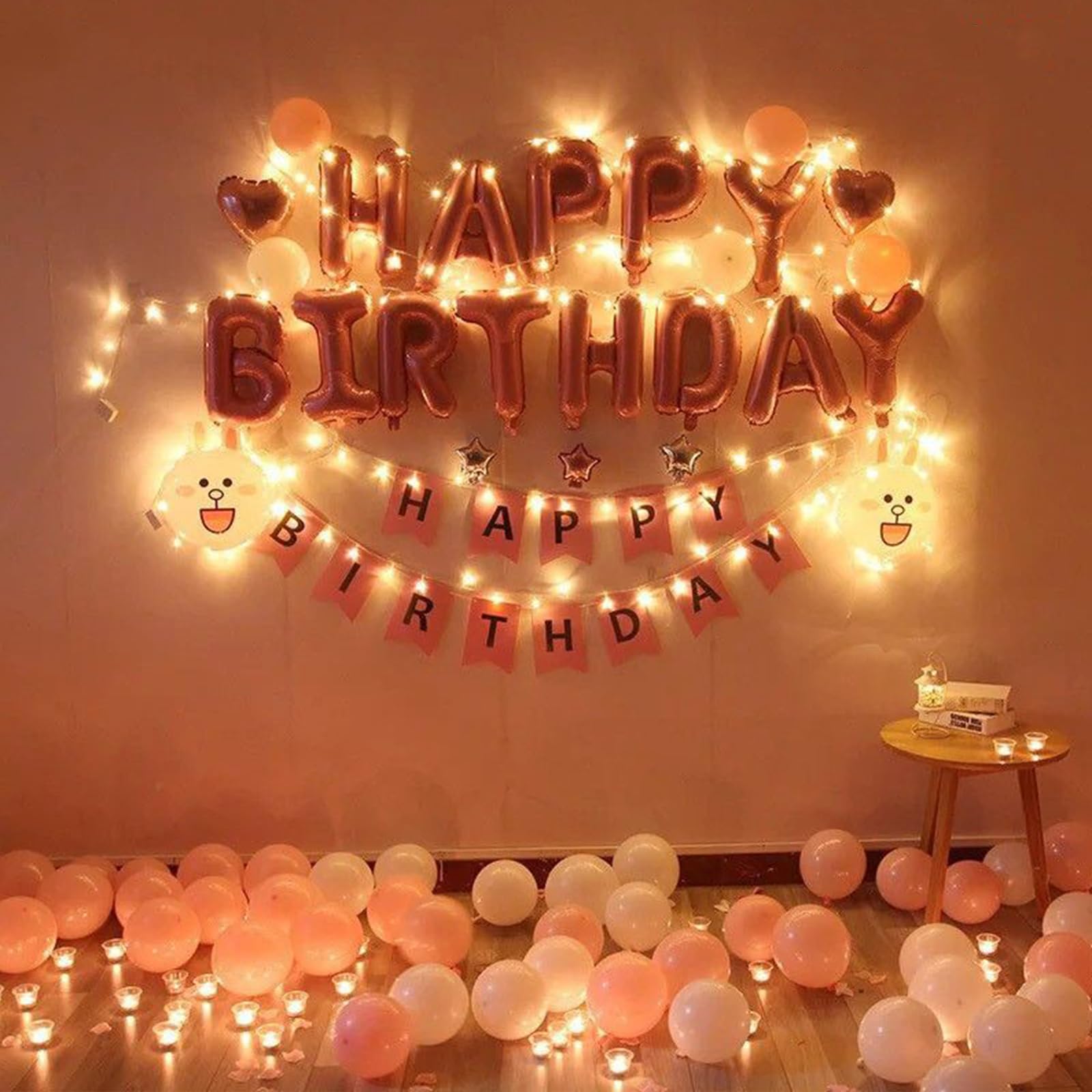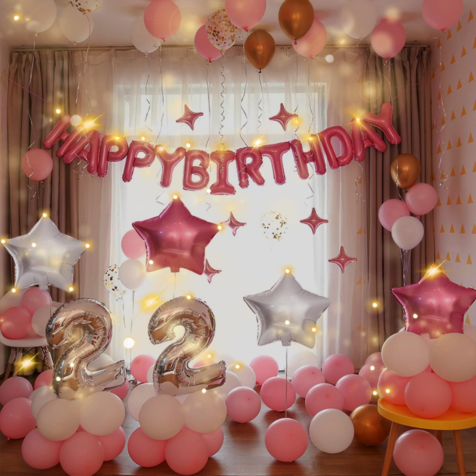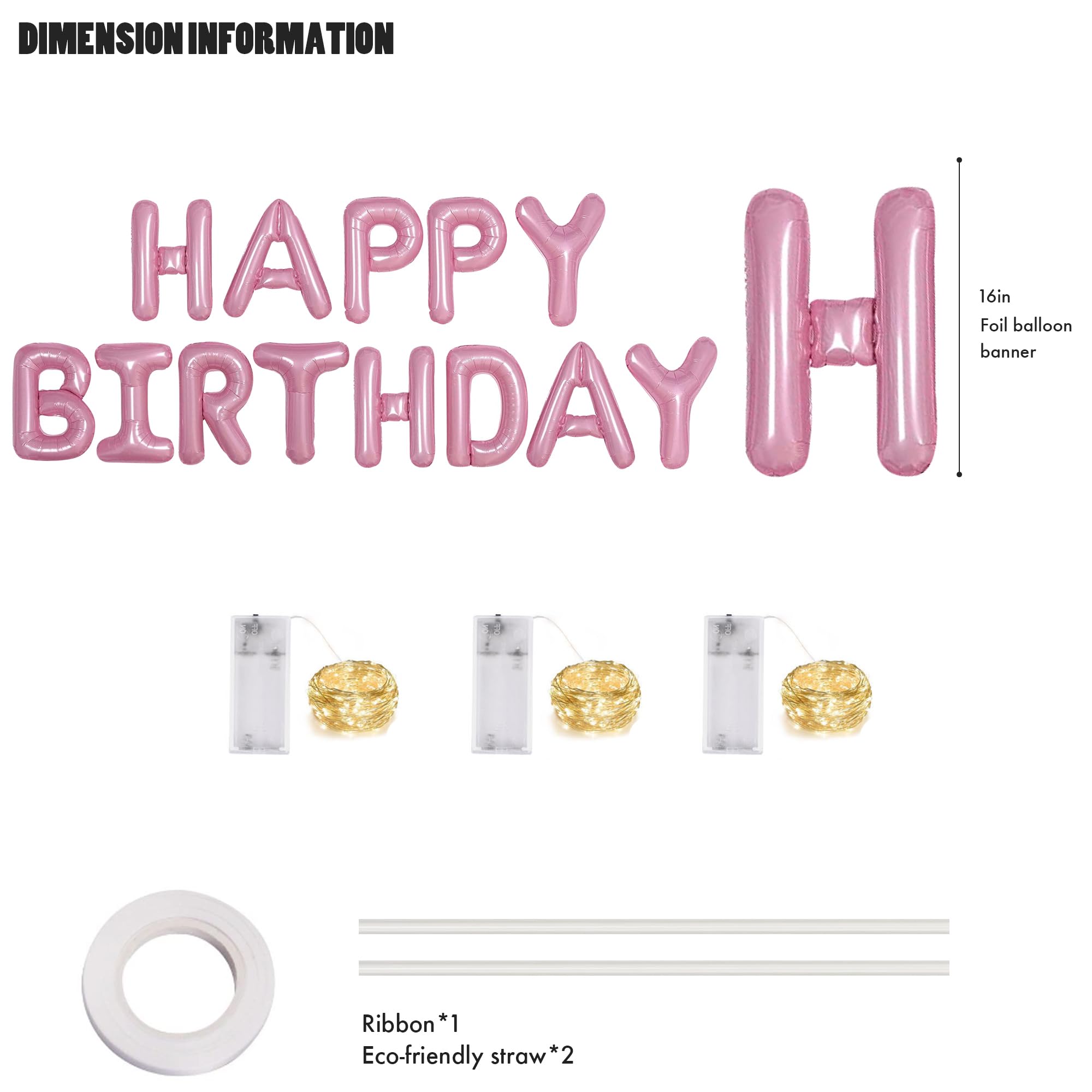 🎈 Package Included:16 inch Pink foil letter happy birthday balloons.Each package come with 13 pcs independent letter balloons which can be combined into "HAPPY BIRTHDAY",2 pcs straw,1 pcs ribbon and 3*Led Light String in 118"(Battery not included).