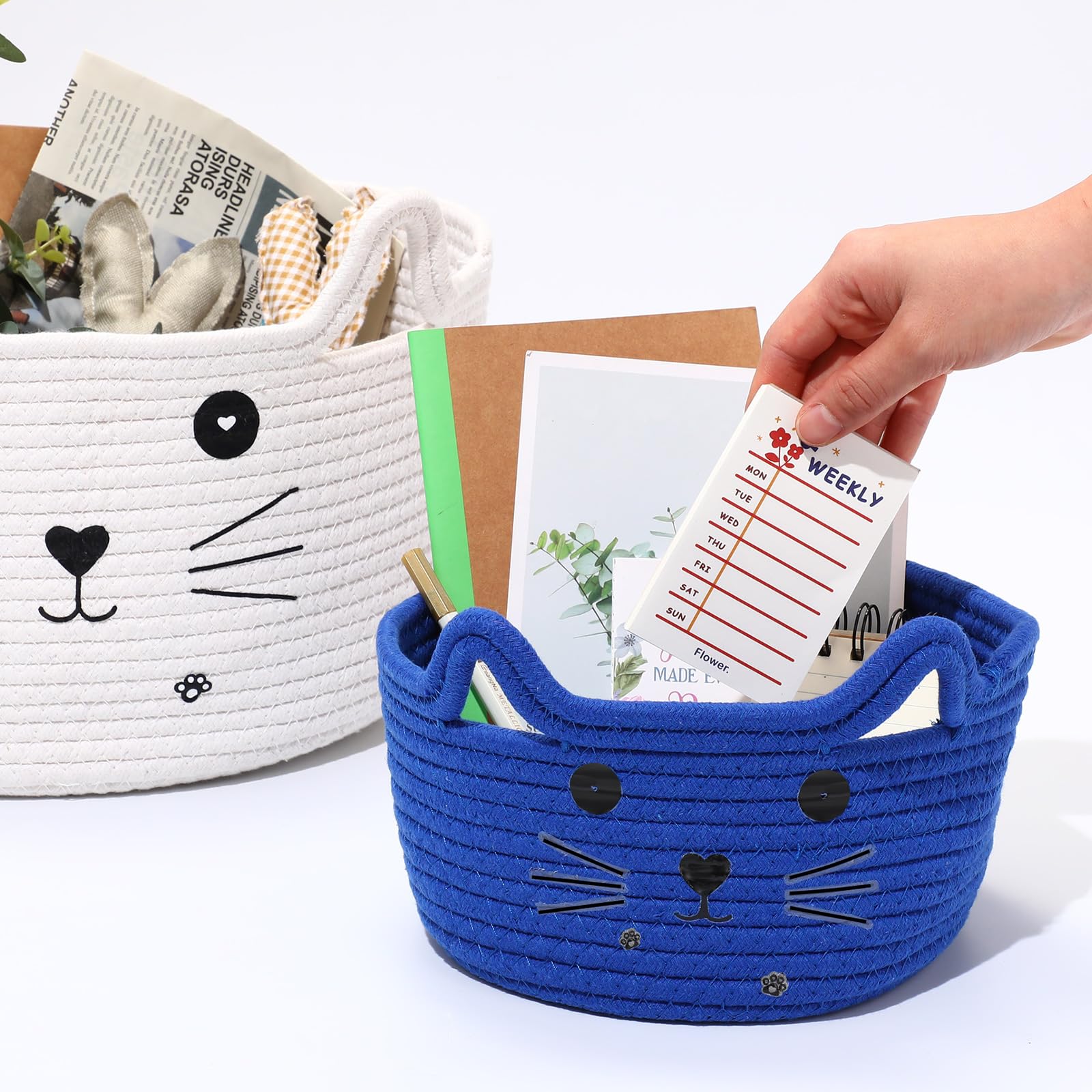 Widely Applied: the small woven basket with cute designs can be applied in your home bedrooms, restaurants, kitchens, living room, playroom, office, etc., and it can store cosmetics, stationery, dried flower decorations, snacks, cats or dog toys