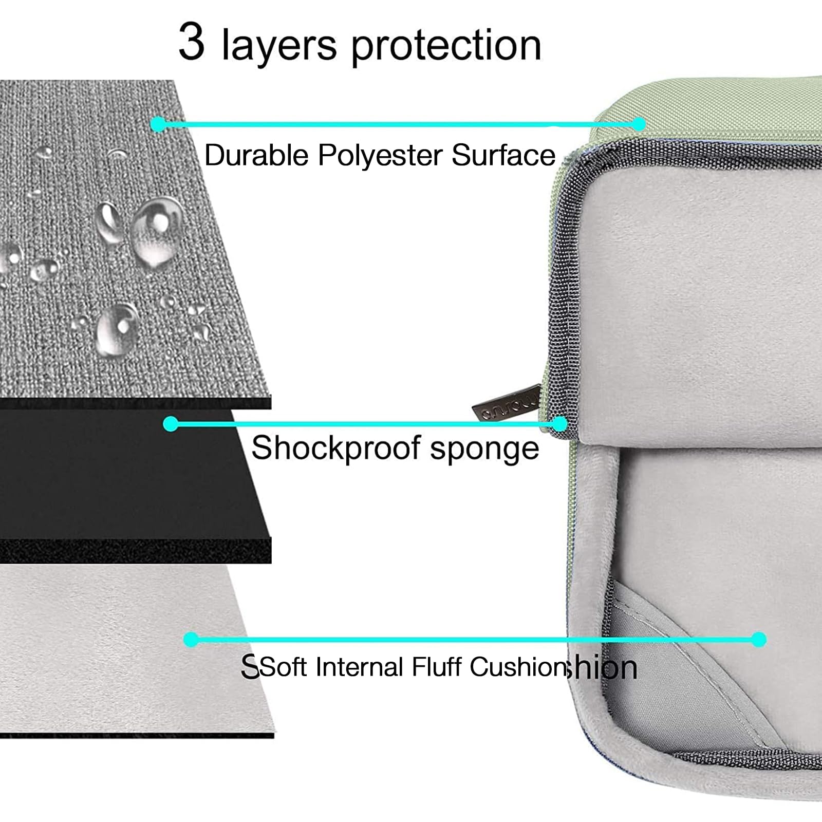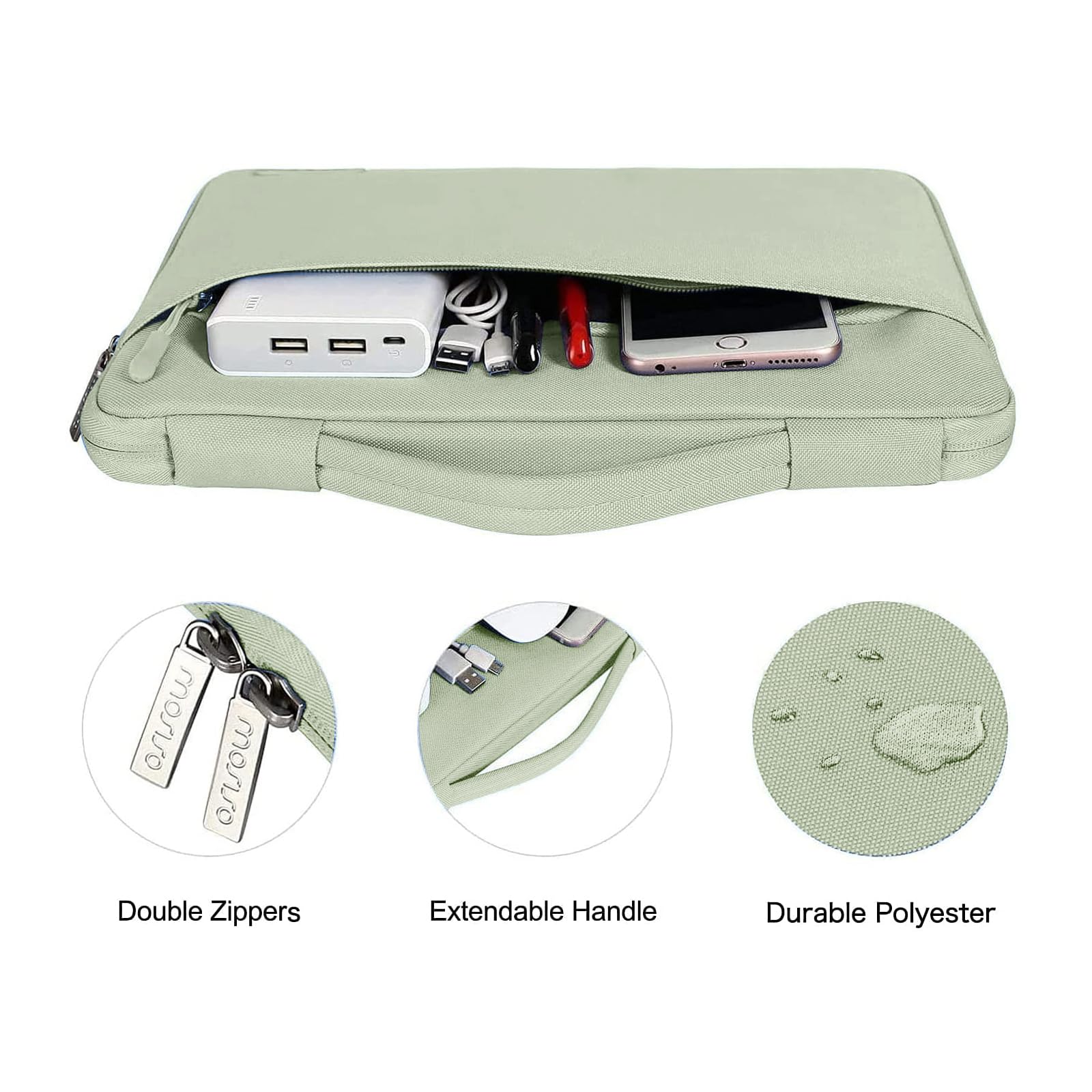 The 360 degree protective shockproof laptop sleeve with handle carrying bag internal dimension: 13.39 x 9.25 x 0.79 inches (L x W x H); external dimension: 13.98 x 9.84 x 0.79 inches (L x W x H). The front side pocket dimension: 11.61 x 9.25 inches (L x W). Made of polyester material, protect your laptop against accidental spills. Slim and lightweight, does not bulk your device up and can easily slide into your briefcase, backpack or other bag. Ideal for business, daily and travel.