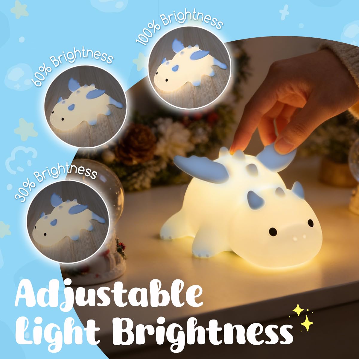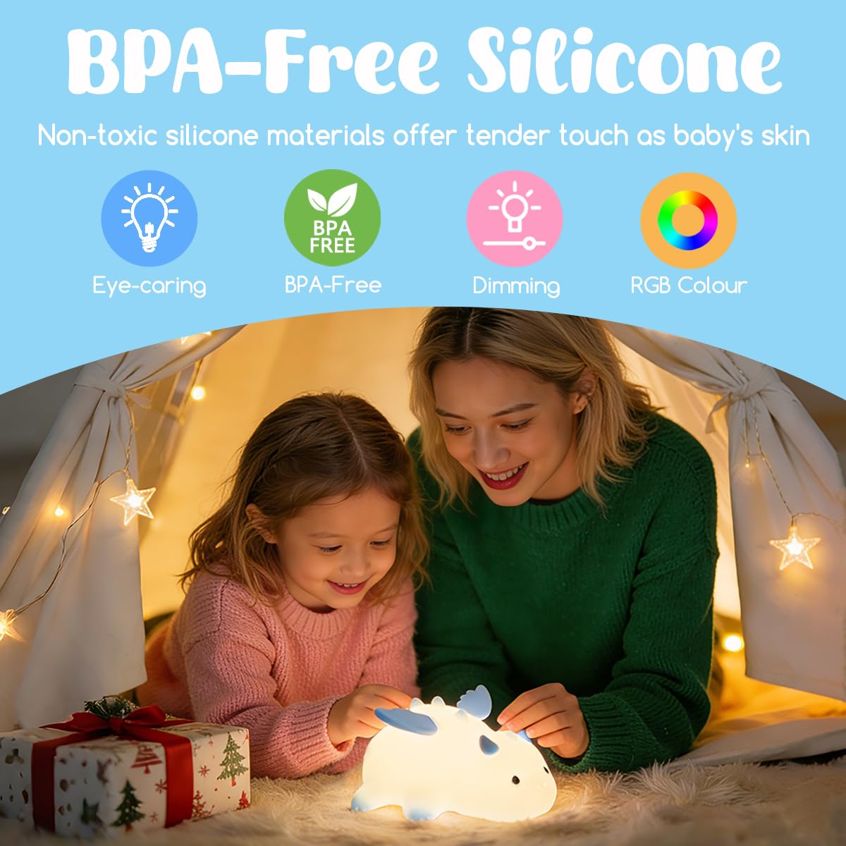 This BPA-free, food-grade silicone Dragon night light is 100% safe for babies, toddlers & kids—soft, comfortable touch makes it a huggable companion! USB rechargeable with 1200mAh battery: 2hrs charge for 20hrs use, plus timer function, perfect for travel. TAP! SQUISH! FUN! Gentle tap controls 7 rainbow hues (smooth transitions thrill kids) & 3 brightness levels—50% soft glow for nursery sleep, 100% for midnight feedings/diaper changes, eye-friendly all the way. Soothing light calms fussy babies, chases nightmares, guards little ones nightly. Symbolizing serenity & hope, this kawaii Dragon doubles as nursery/bedroom decor, ideal baby shower gift for daughters, granddaughters—grab this versatile present now!