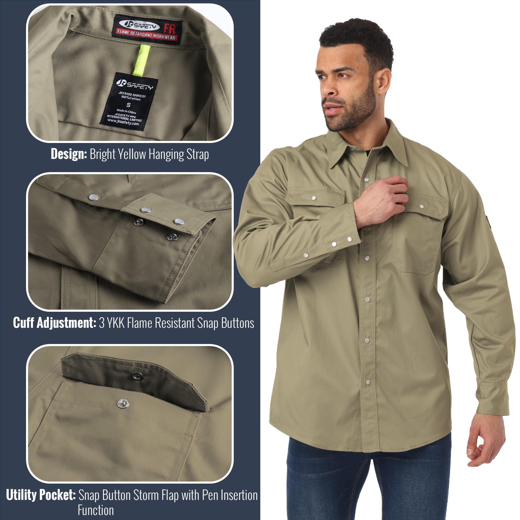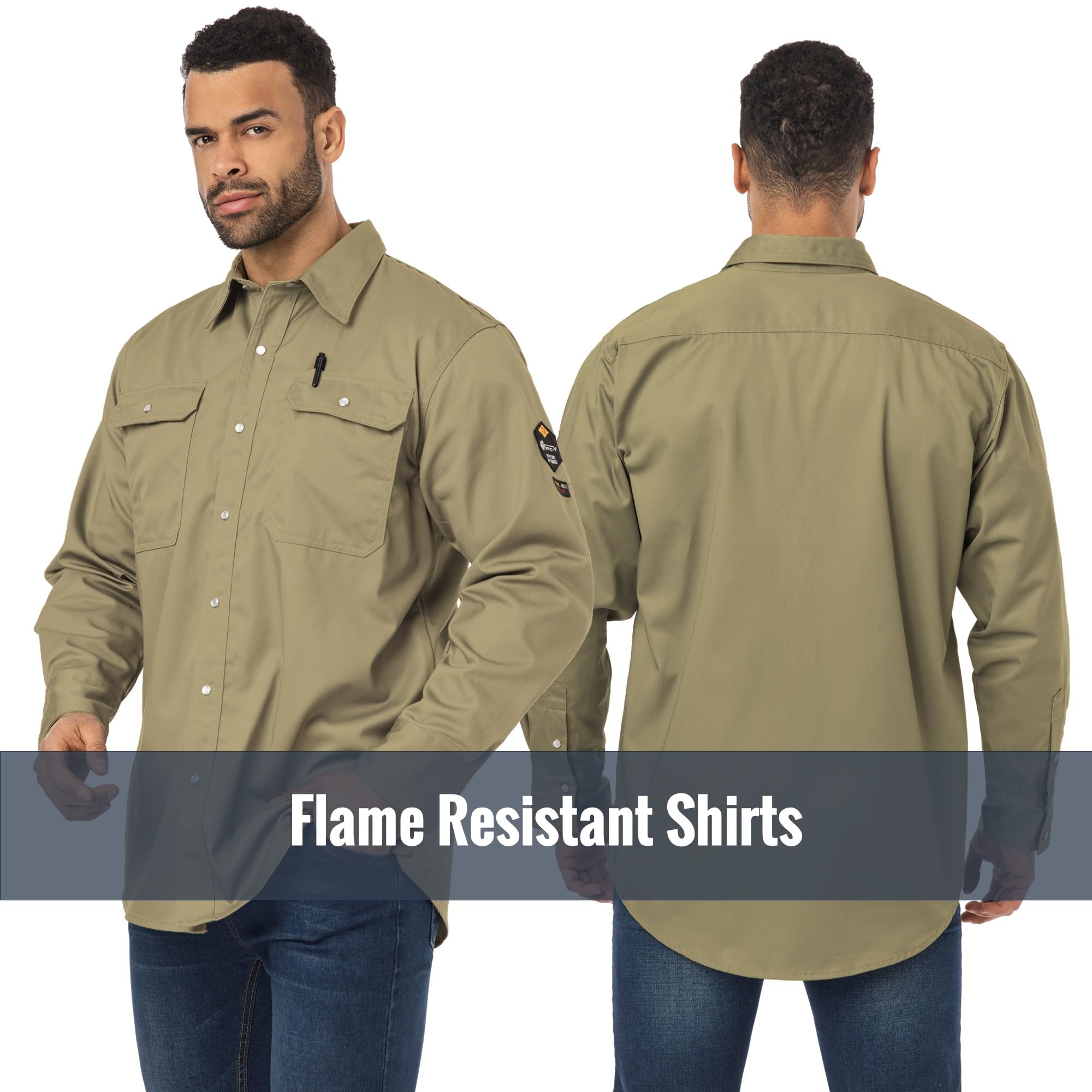 Flame Resistant Shirts: The JKSafety 7oz 100.00% cotton FR long sleeve shirts for men is crafted from durable FR fabric; The fr shirts resists fire without dripping or melting. The FR Clothing complies with an ARC Rating of CAT 2, certified by UL for reliable flame-resistant performance. They offer protection for men and women safety in high-risk environments exposed to sparks, flames and heat. Note: A small FR garment sample have been attached for inspection.