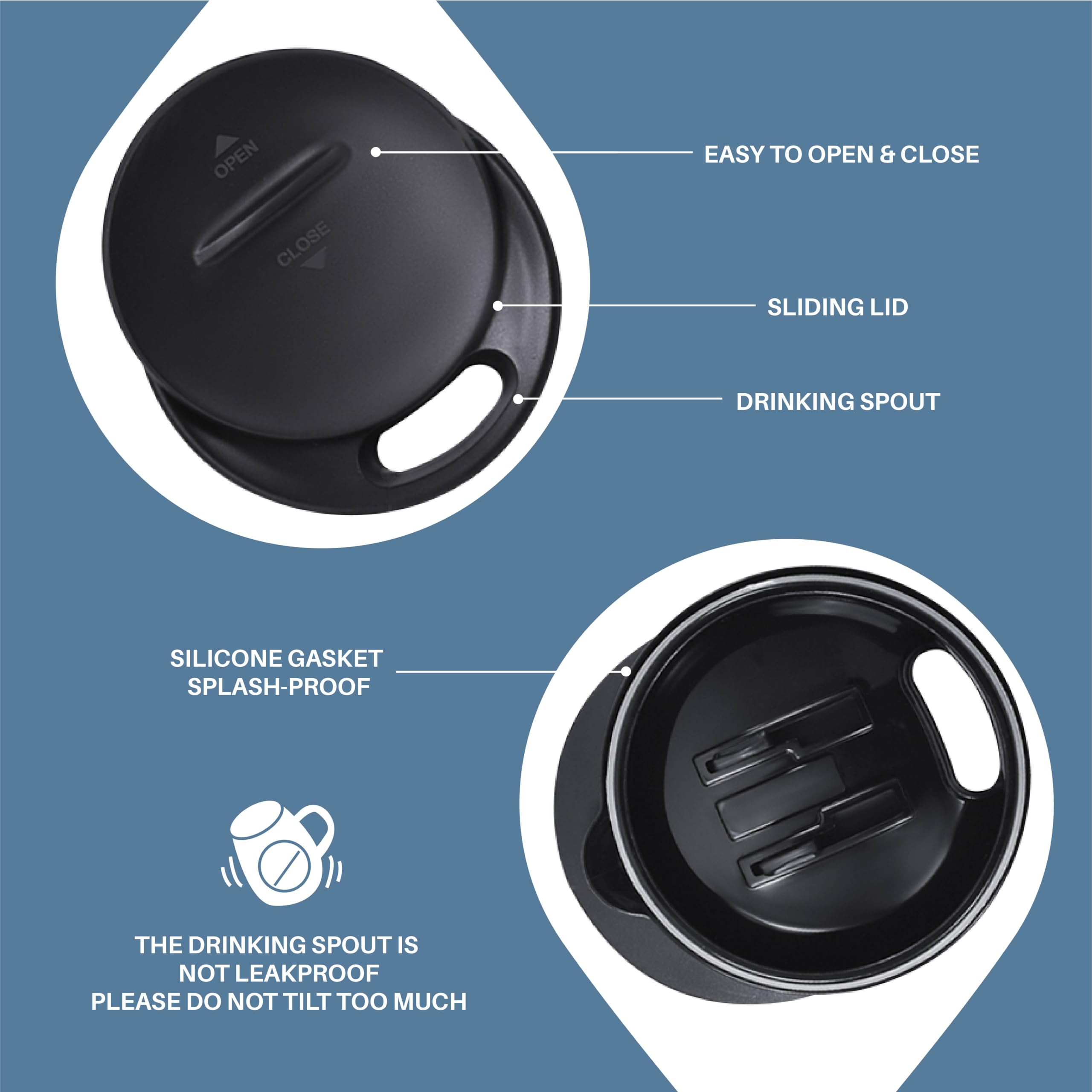 【PRESS-IN LID】- Silica gasket seals to achieve maximum spillproof capability. Drinking hole on the top, with a splash-proof sliding cover. Please note it is to keep drinks contained and prevent heat/cold from escaping. It is not leakproof.