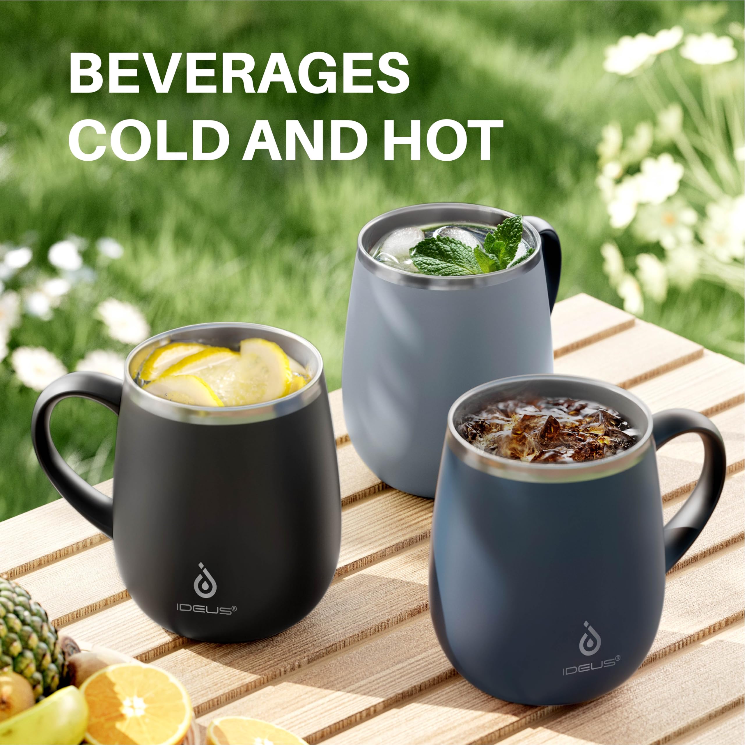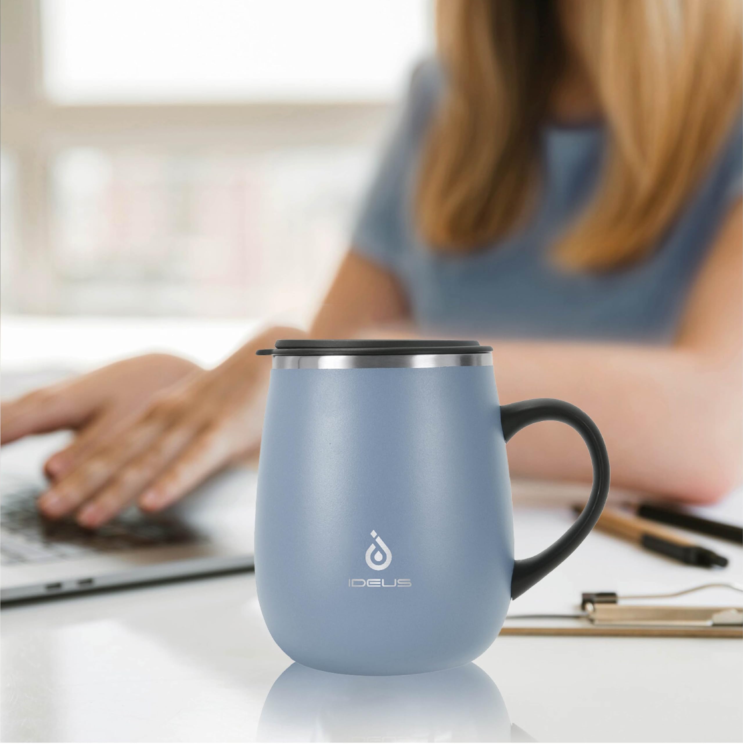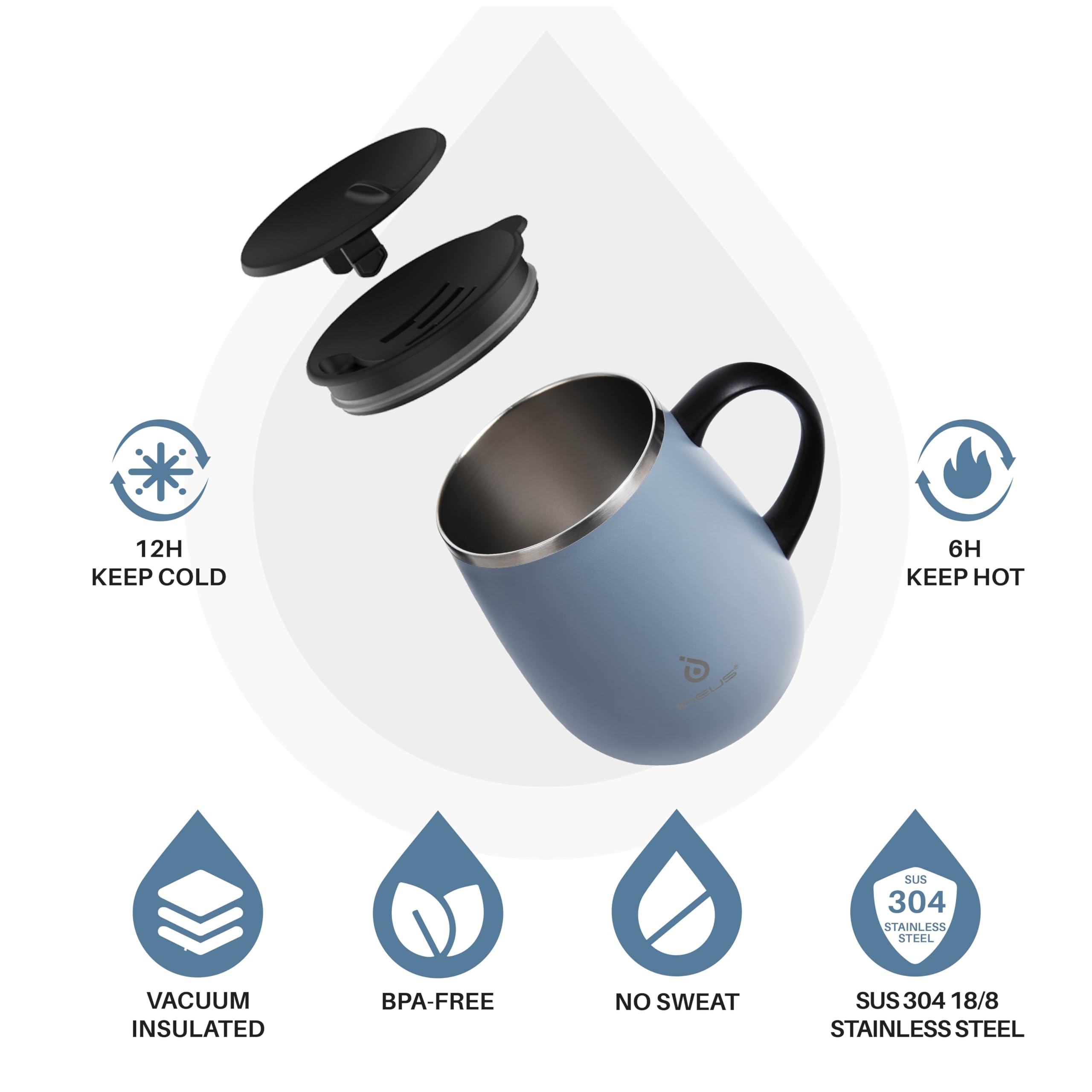 【VACUUM INSULATION】- IDEUS 16 oz coffee tumbler is made from 18/8 stainless steel. Advanced double-wall vacuum insulation technology can keep the temperature of beverages for up to 6 hours (hot) & 12 hours (cold).