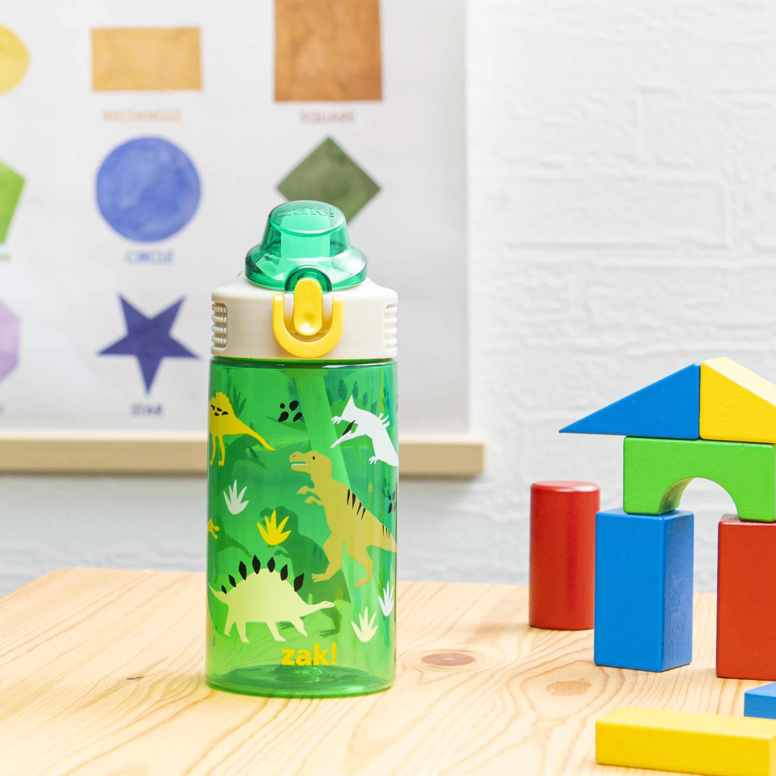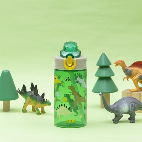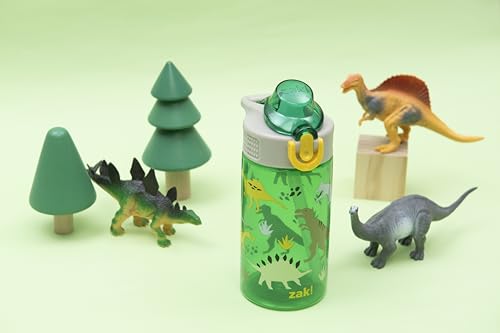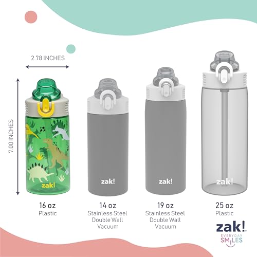 Let kids enjoy hydration with a fun water bottle by zak! designs! Easy to Clean: The silicone spout and straw can be removed from the lid, and the pieces are dishwasher safe for simple cleanup at the end of the day. Reusable and Durable Material: Reusable water bottles will last wash after wash—good news for you and the environment! The 16 oz water bottle is made of PP plastic, durable enough for kids to use every day and bring on any adventure. Leak-Proof Lid: The lid screws on securely and won't leak when the spout is closed, though water flows for easy drinking when the spout is open. The easy-open button has a flip-up lock to keep it from activating accidentally. On the Go: The water bottle has a built-in carrying loop on the lid for easy transportation, and with the spout cover to keep the spout clean and closed, it can be tossed into a bag for worry-free travel. Specifications: 16 oz capacity. Made of durable plastic. BPA-Free - zak! is committed to safety. Dishwasher safe, do not microwave. Length: 4.33-inch, Width: 2.78-inch, Height: 7-inch. Design: Dino.