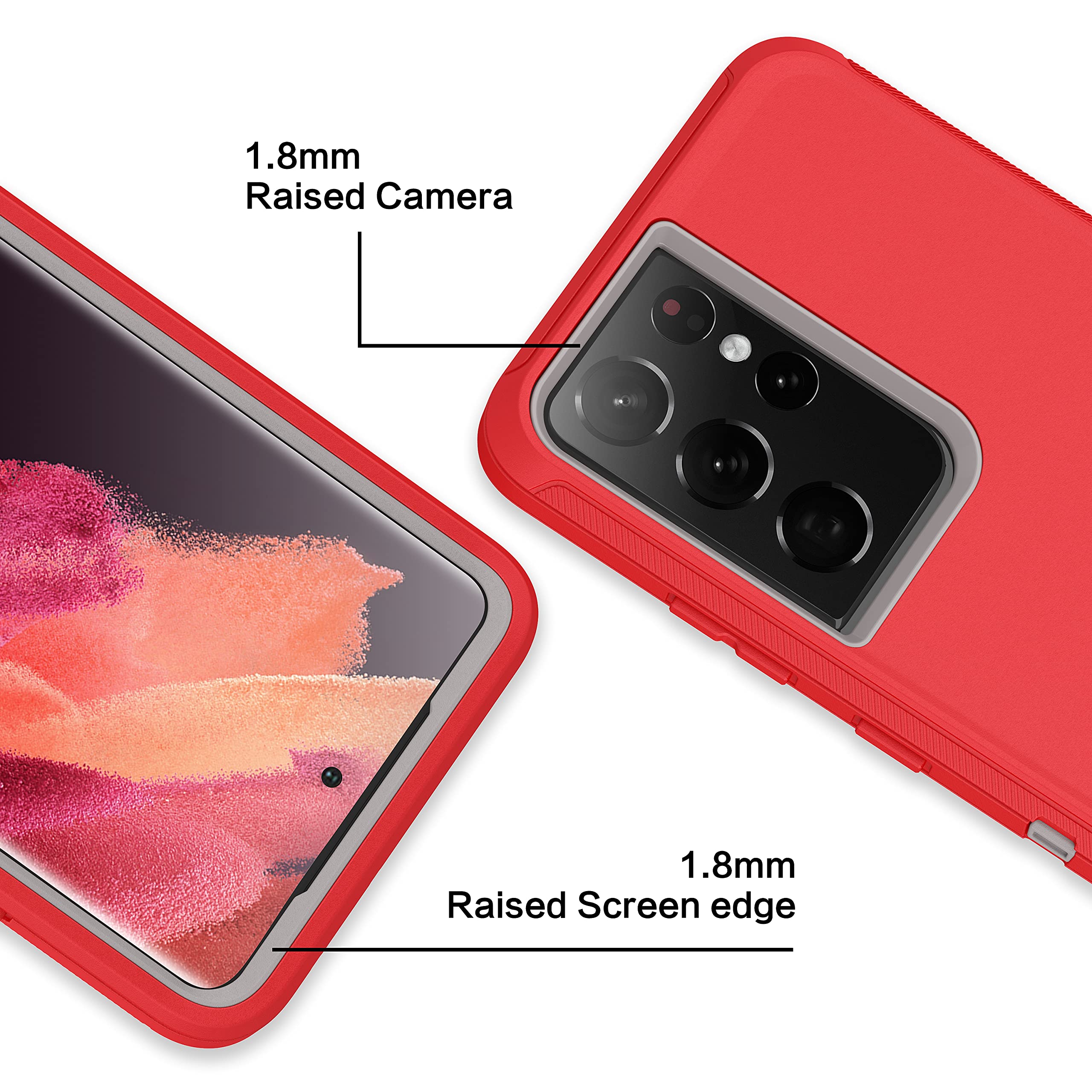 Features of Case S21 Ultra 5G: Raised beveled edges protect your screen and camera. The front edge lips and lens lips provide heavy-duty protection for your phone's screen and camera lens against drops and daily wear