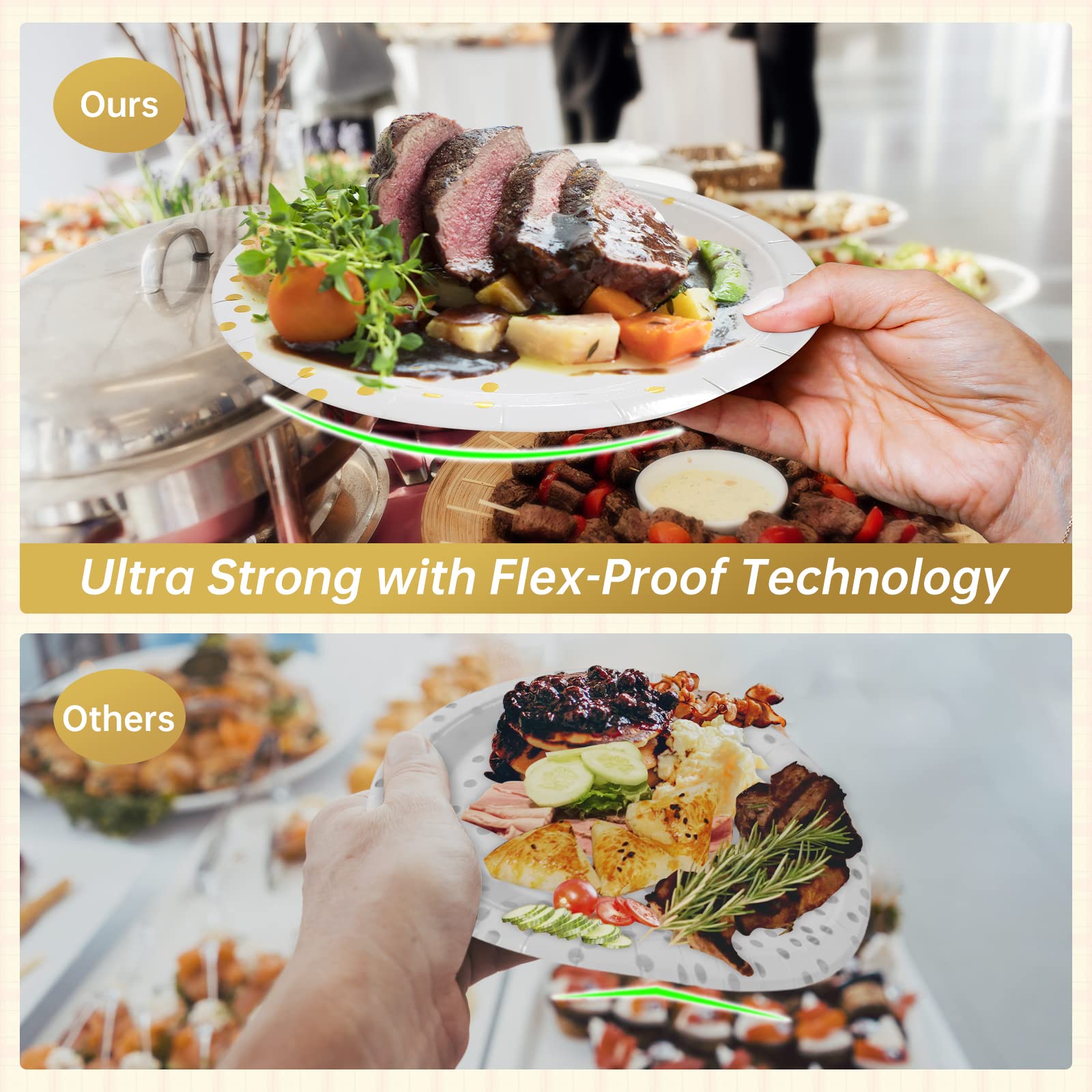 The disposable paper plates is made of thickened environmentally friendly paper,and the soak-proof layer on the surface,Cut resistant and Soak-Proof,white and gold napkins are 2-ply,soft and absorbent.(NOTE: Do not microwave the disposable tableware)