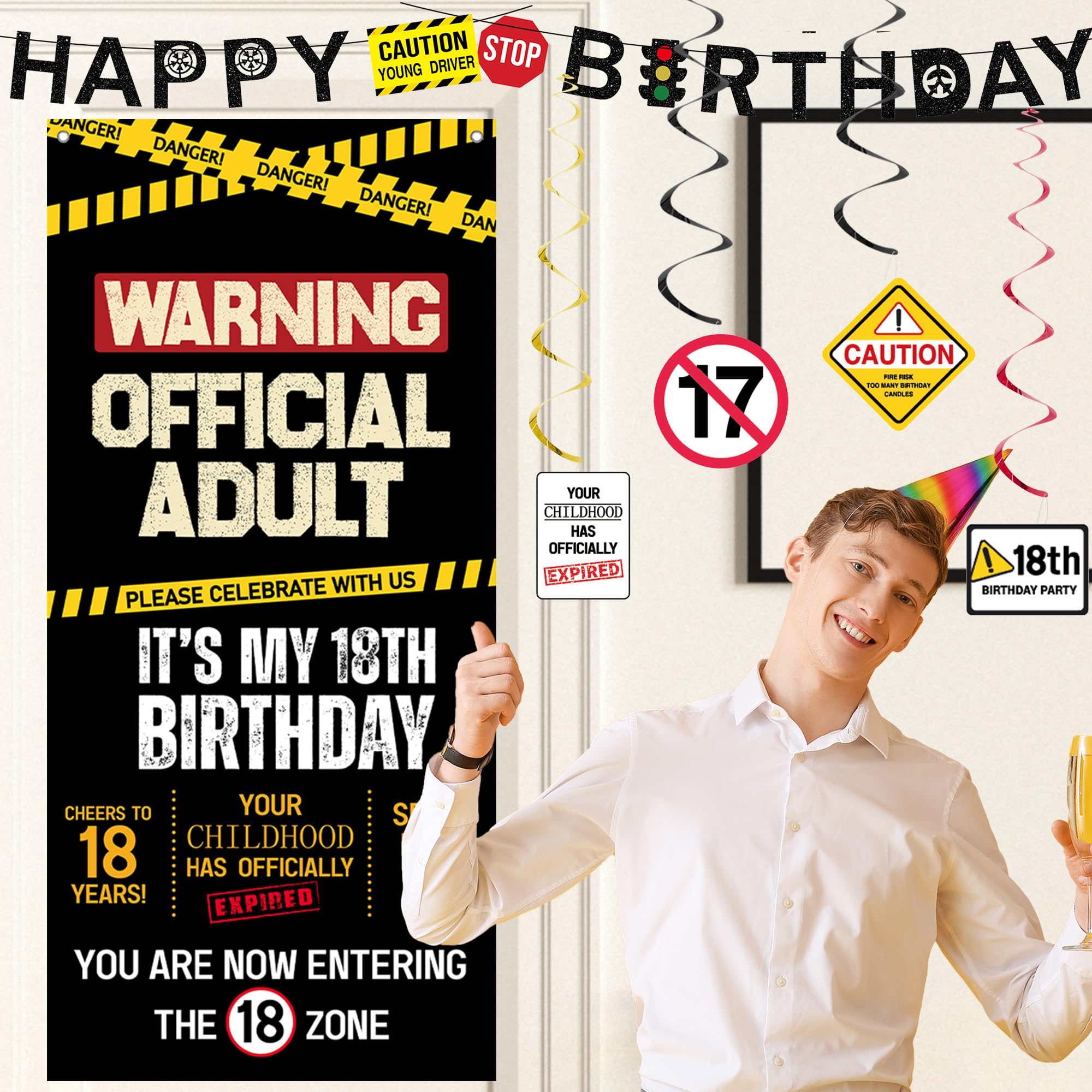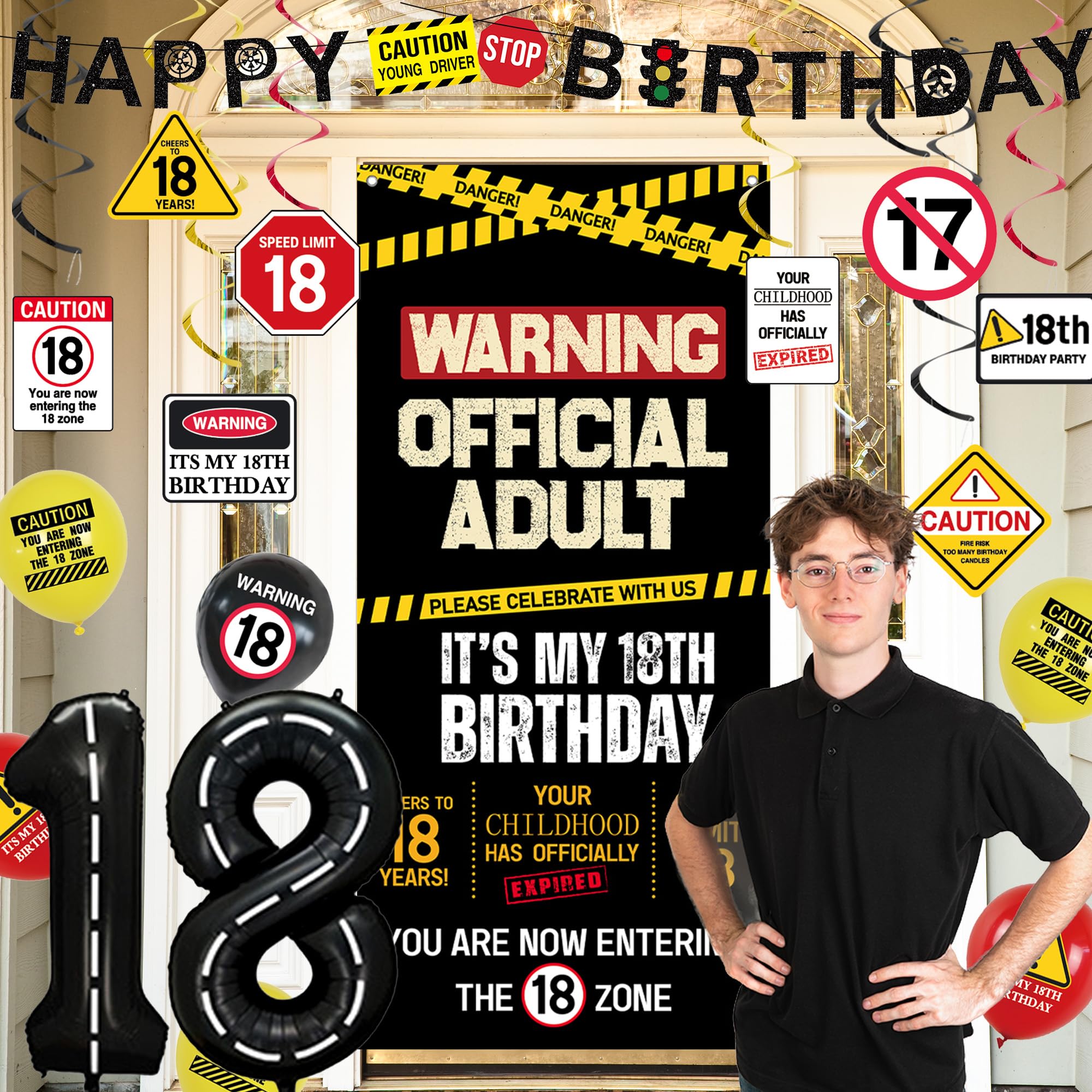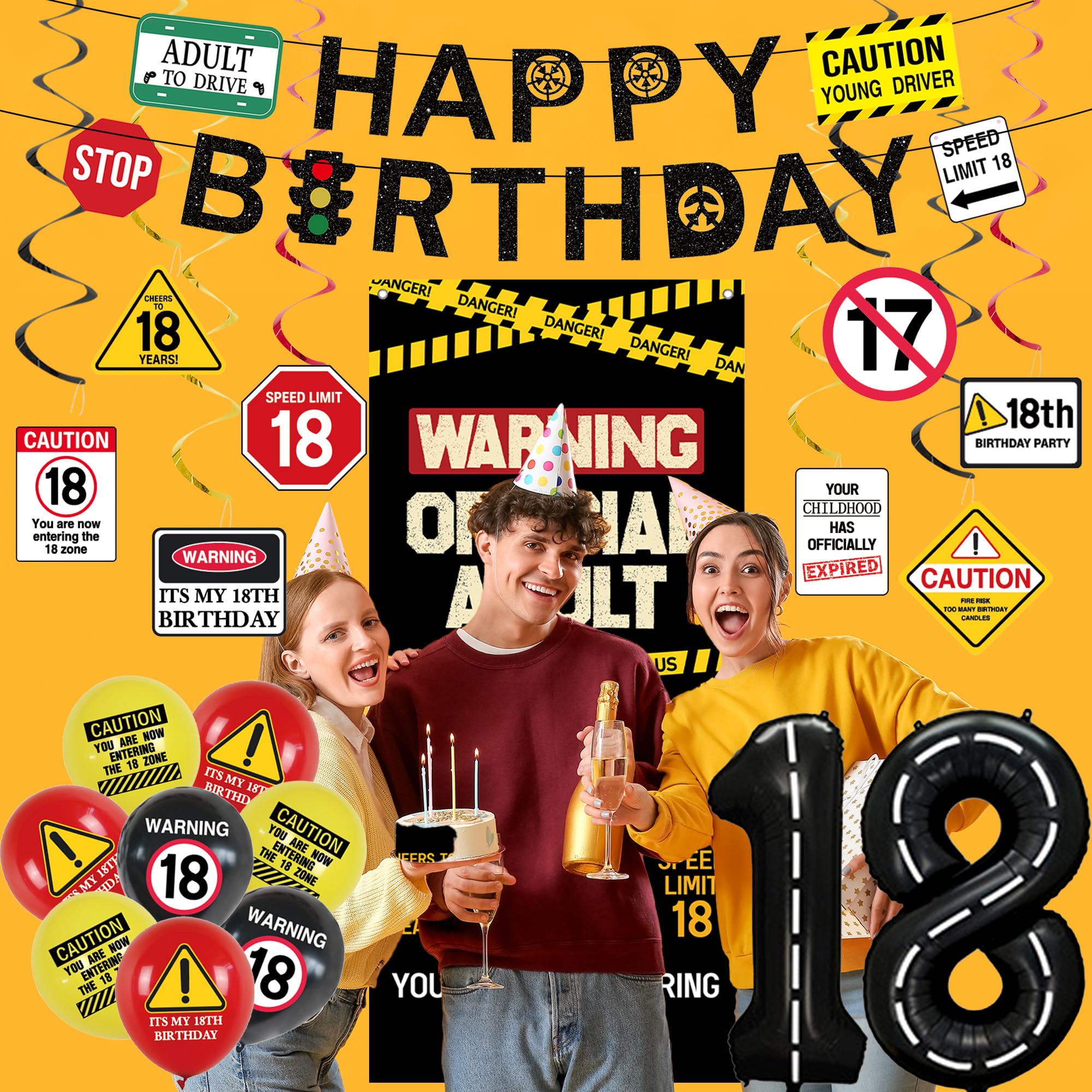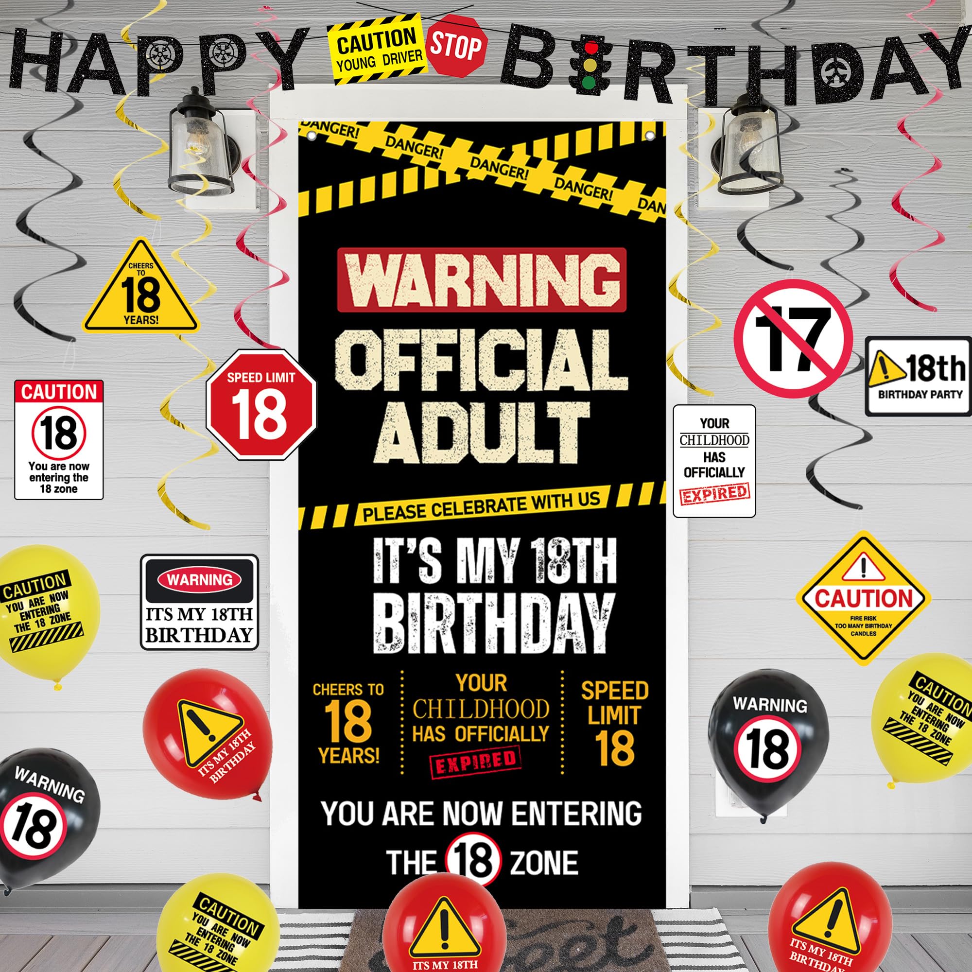 [18th Birthday Decor] - Our 18th birthday party decorations set with caution logos in black, yellow and red includes 1PC "Happy Birthday" banner, 1PC "Happy 18th Birthday" door cover, 8PCS hanging swirls, 12PCS balloons and number "18" balloons. Enough quantity to meet your 18th birthday party decorating needs and perfectly decorate your 18th Bday party