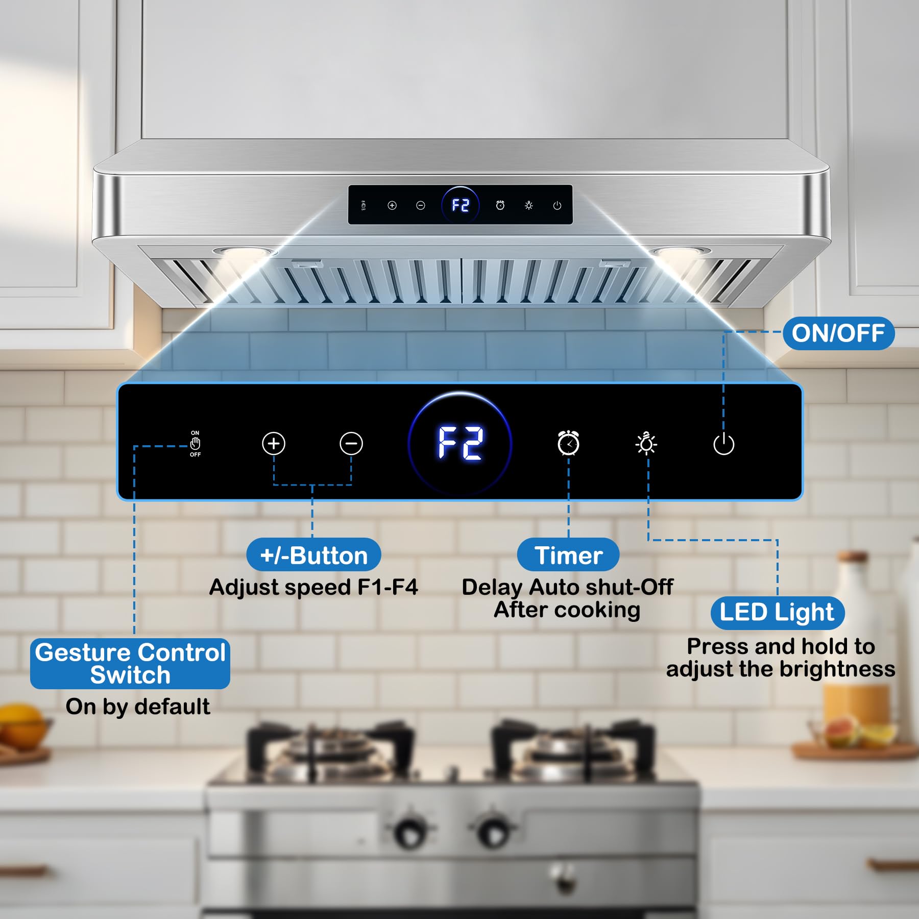 Touch & Gesture Control. This stylish and durable stainless steel under cabinet range hood combines modern elegance with smart features. The intuitive digital touchscreen allows for quick adjustments, and advanced gesture sensing technology allows you to precisely adjust the wind speed with a wave of your hand, with smooth operation and effective avoidance of accidental touches. Easy control creates a cleaner and smarter cooking environment for you.