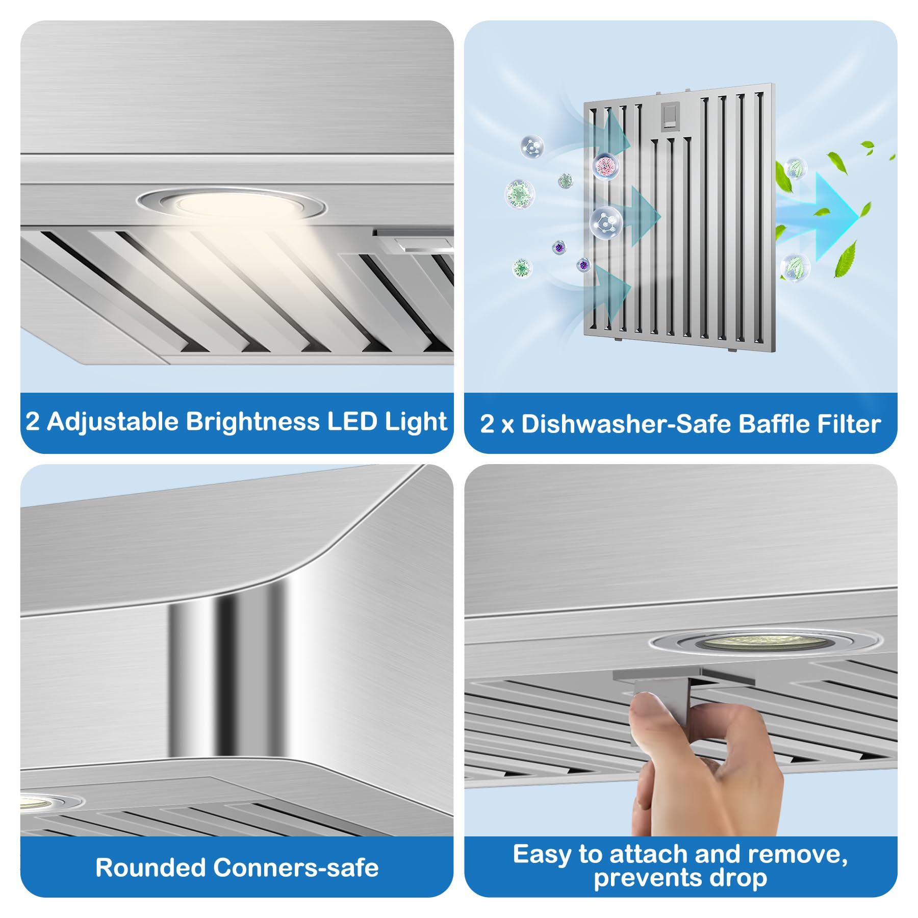 Machine-washable Stainless Steel Baffle Filters. The kitchen vent hoods equipped with two heavy-duty stainless steel baffle filters, they are heat-resistant and rust-resistant, and can effectively capture grease and impurities. The filters are easy to disassemble and reassemble, and can be directly put into the dishwasher for maintenance-free, long service life, and easy to create a clean kitchen.