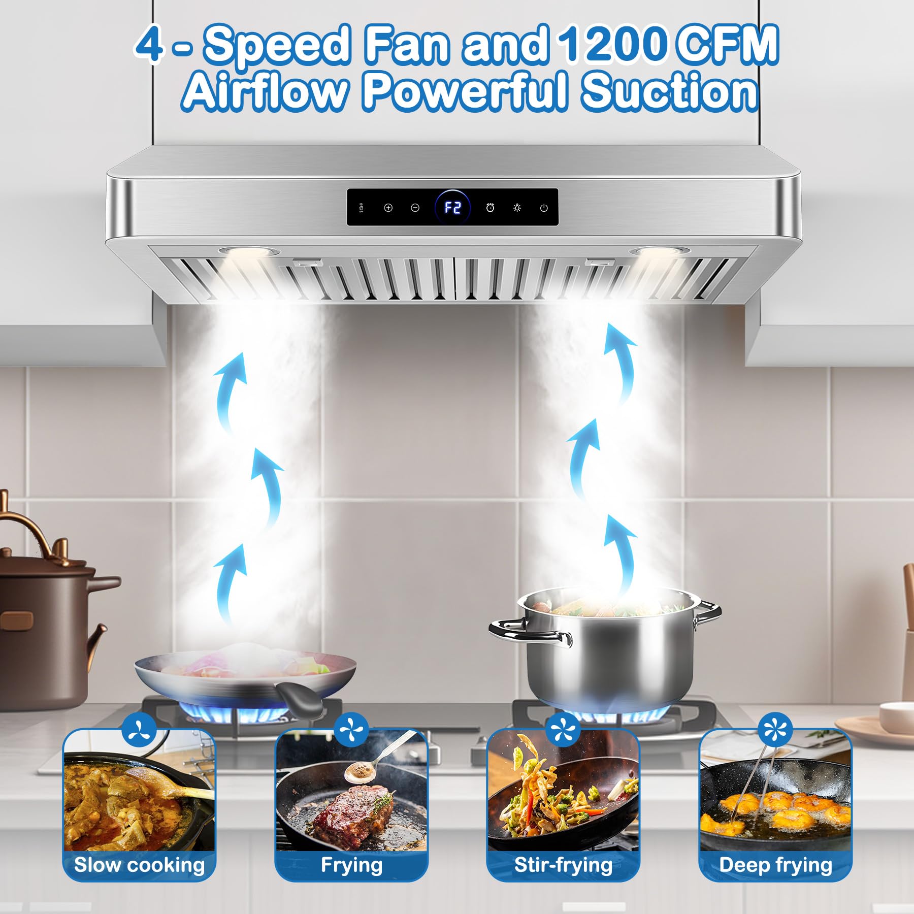 1200 CFM Powerful Suction Quickly Removes Smoke and Odors. RAPSUAR kitchen exhaust hood equipped with dual centrifugal motors, it provides powerful airflow up to 1200 CFM, effectively capturing and exhausting oil smoke and odors from all directions and quickly exhausting them, so that you can always breathe fresh air during the cooking process and keep the kitchen clean and comfortable.