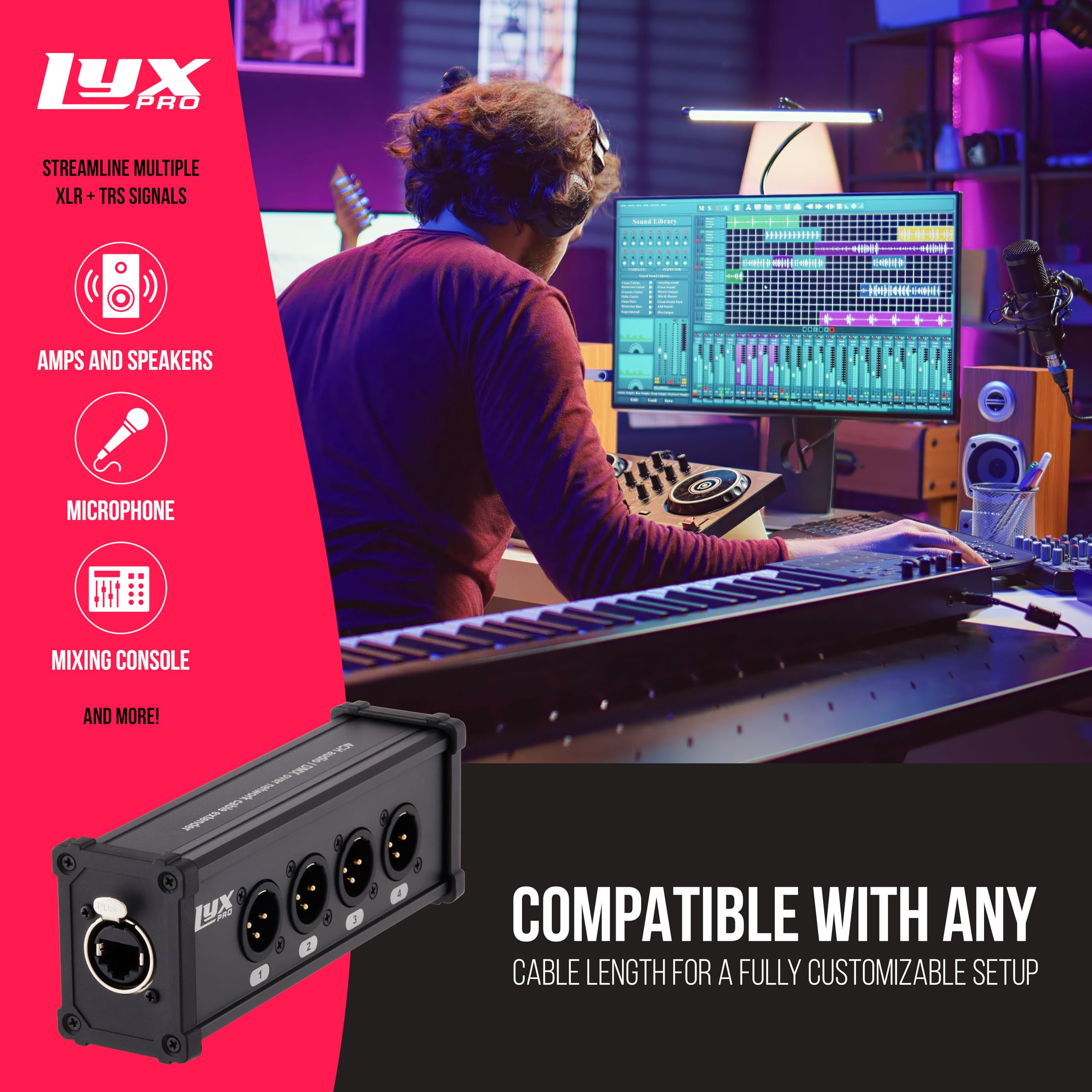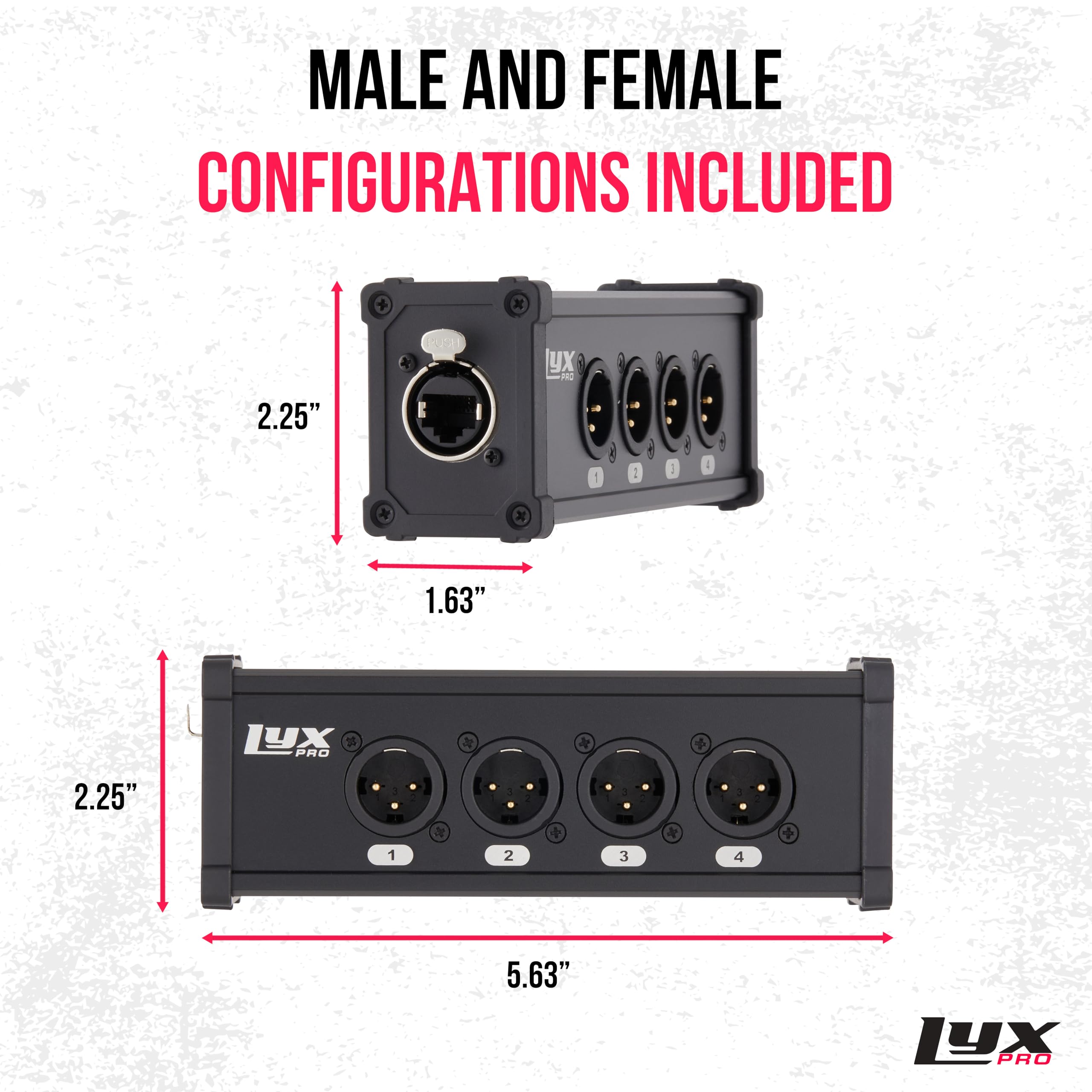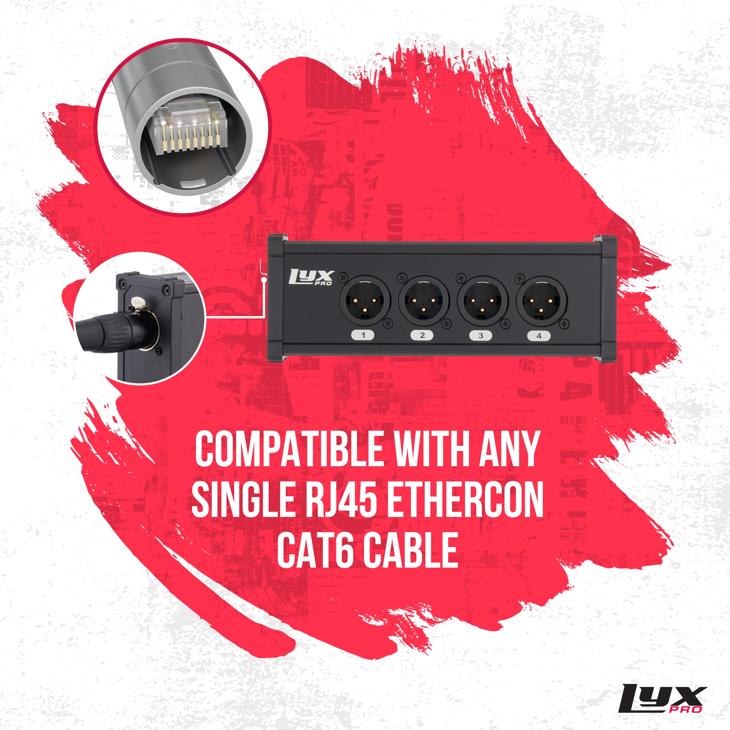 VERSATILE MALE XLR BREAKOUT: 4 CHANNEL 3-PIN XLR FOR STAGE SOUND, LIGHTING, RECORDING STUDIO: This Male XLR breakout cable is an essential tool for stage sound, lighting setups, and recording studio environments. Create 4 inputs into a single Cat 6 network cable that can extend up to 330 ft, offering reliable and flexible connectivity. AEX AND DMX CHANNEL SUPPORT FOR PROFESSIONAL AUDIO EQUIPMENT: Compatible with both AEX and DMX channels, this Male breakout cable is designed to integrate seamlessly with high-end professional audio and lighting equipment. It ensures reliable signal transmission across mixers, amplifiers, and lighting controllers, making it ideal for complex setups where precision and performance are crucial. INTEGRATED GROUND LIFT OPTION FOR STAGE PRODUCTION – CONSISTENT RELIABLE PERFORMANCE: Designed with the demands of live stage production in mind, this XLR cable breakout includes a built-in ground lift option to minimize noise interference. This feature, combined with its durable construction, ensures a clean and clear signal, making it a trusted choice for professionals in live sound and lighting environments. LIVE AUDIO PERFORMANCE – QUICK AND EASY SETUP: This Male XLR breakout cable is designed for ease of use in live audio performances. The RJ45 Ethercon connector allows for quick and straightforward connections, ensuring a fast and efficient setup. This capability makes it a practical and time-saving solution for routing audio signals over long distances in demanding live settings. PROFESSIONAL-GRADE SPEAKER AND INSTRUMENT SETUP: Ideal for configuring speakers and instruments, this Male XLR cable breakout delivers superior sound quality and dependable performance. Designed for professional use, it combines versatility and reliability, making it suitable for both industry professionals and audio enthusiasts.