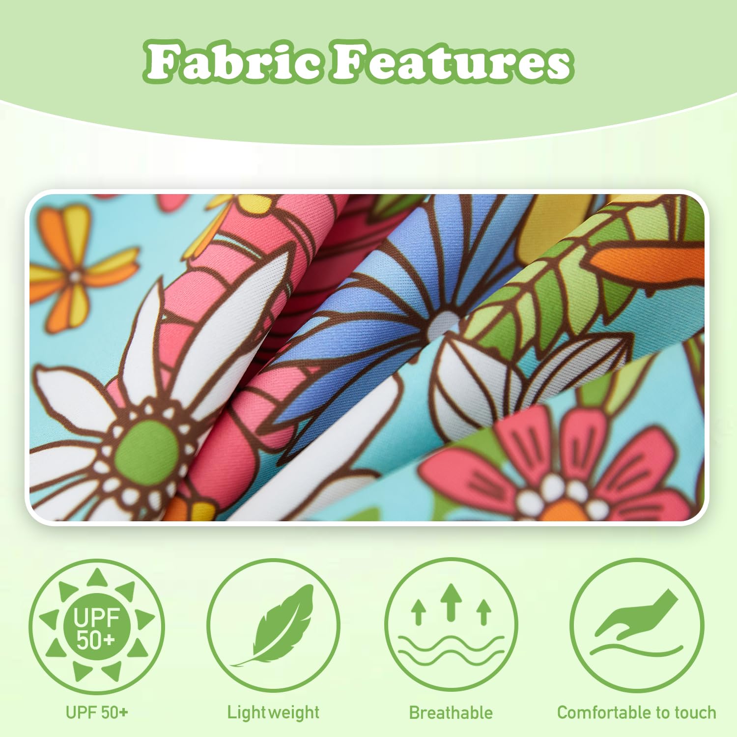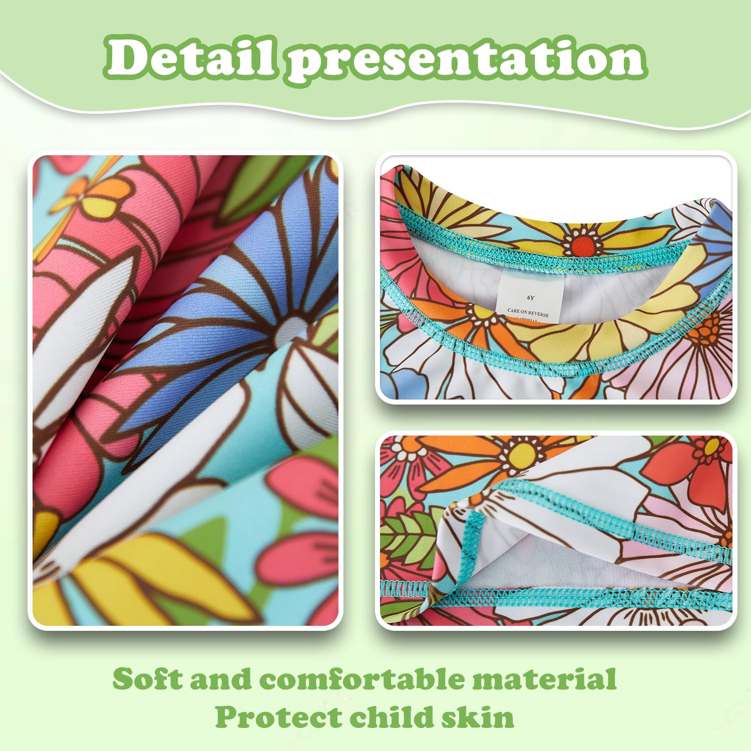 Excellent quality girls rash guard swimwear: Great smooth material, 86% Polyester and 14% spandex, Lining: 100% Polyester. Our girls long sleeve rash guard bathing suits elasticity for perfect fit, skin-friendly, quick dry, breathable, comfortable and soft wearing, easy-to-clean and stain resistant