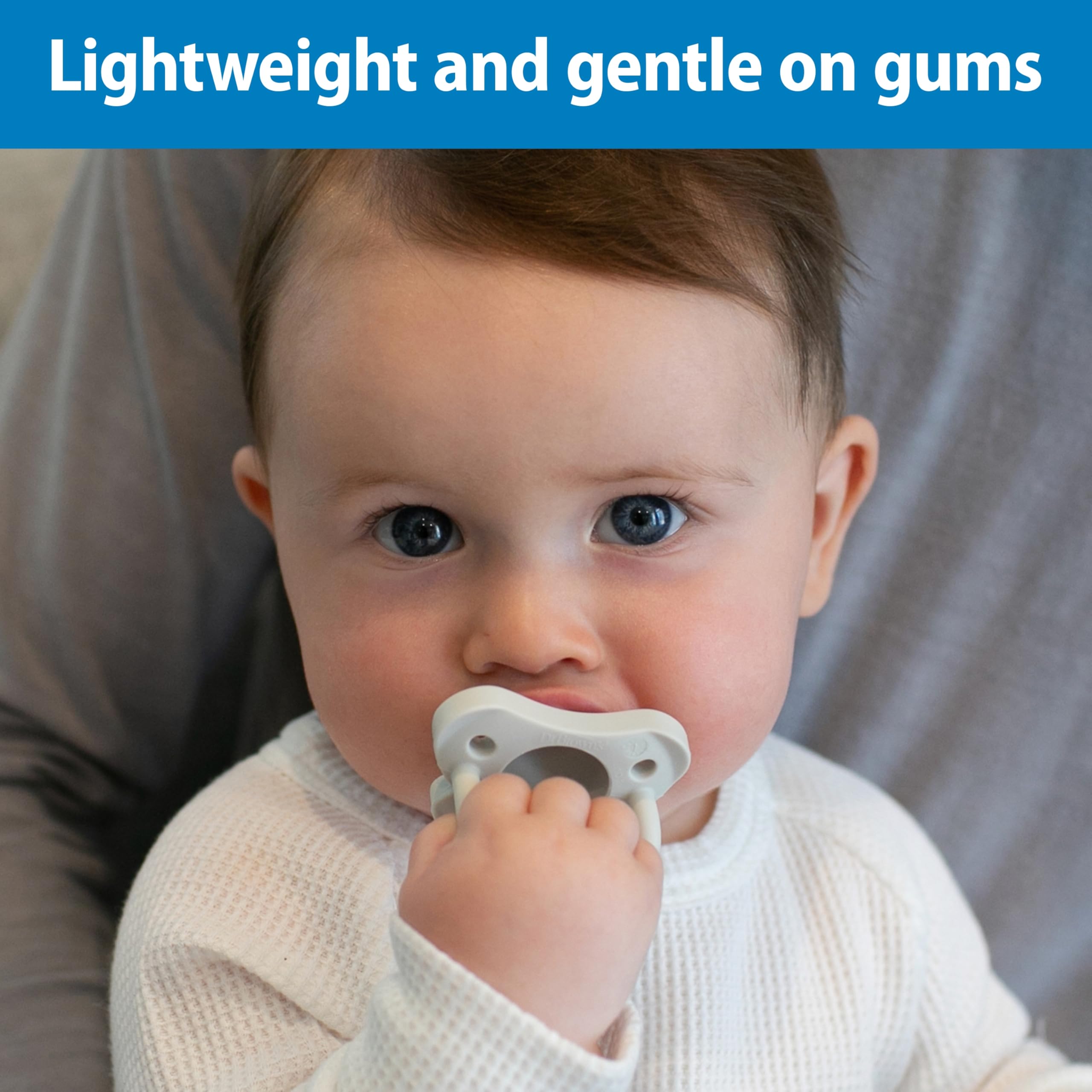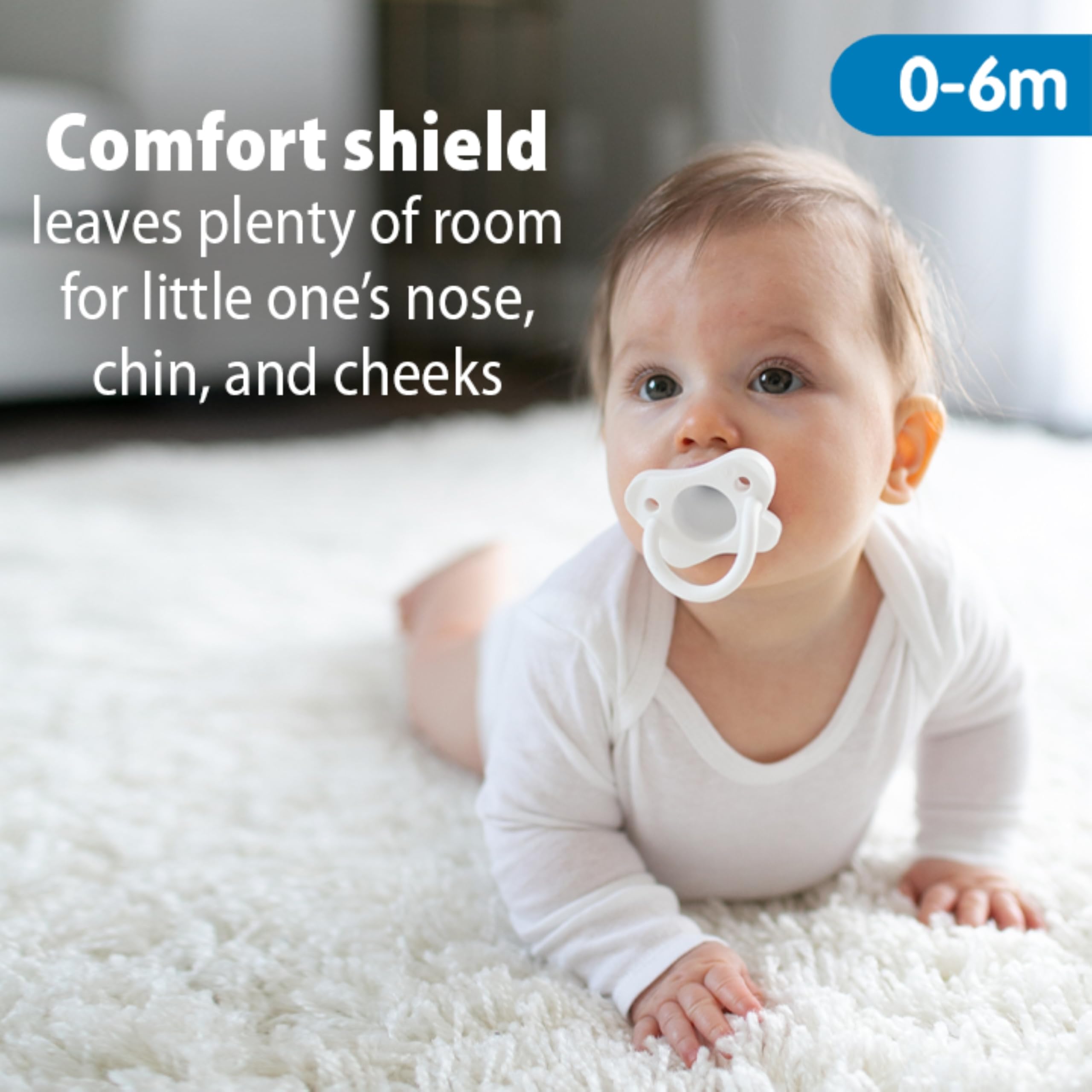SILICONE BABY PACIFIER. Soothe baby with lightweight and soft 100% silicone pacifier. Designed for babies 0-6 months.