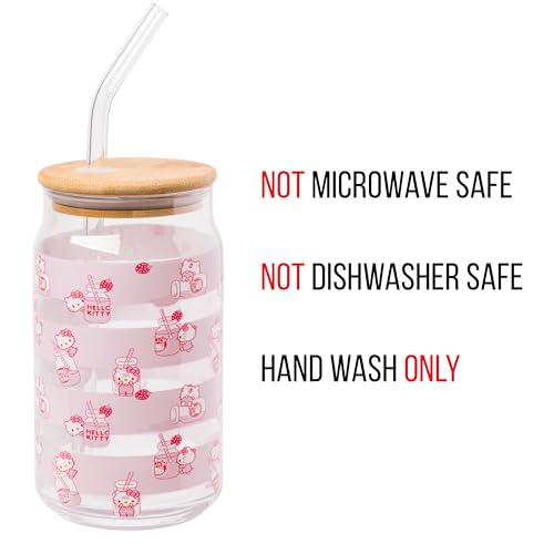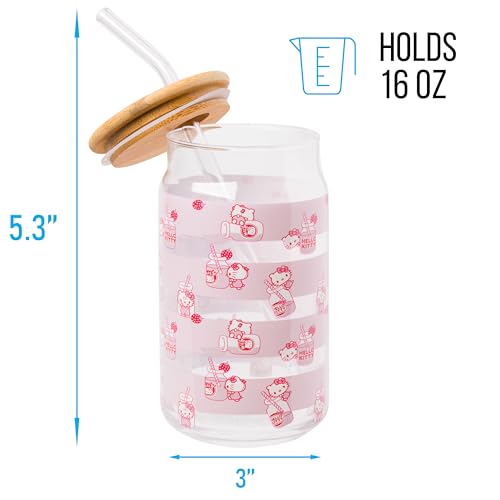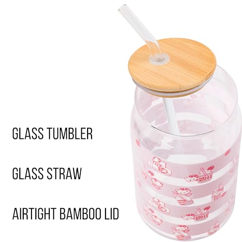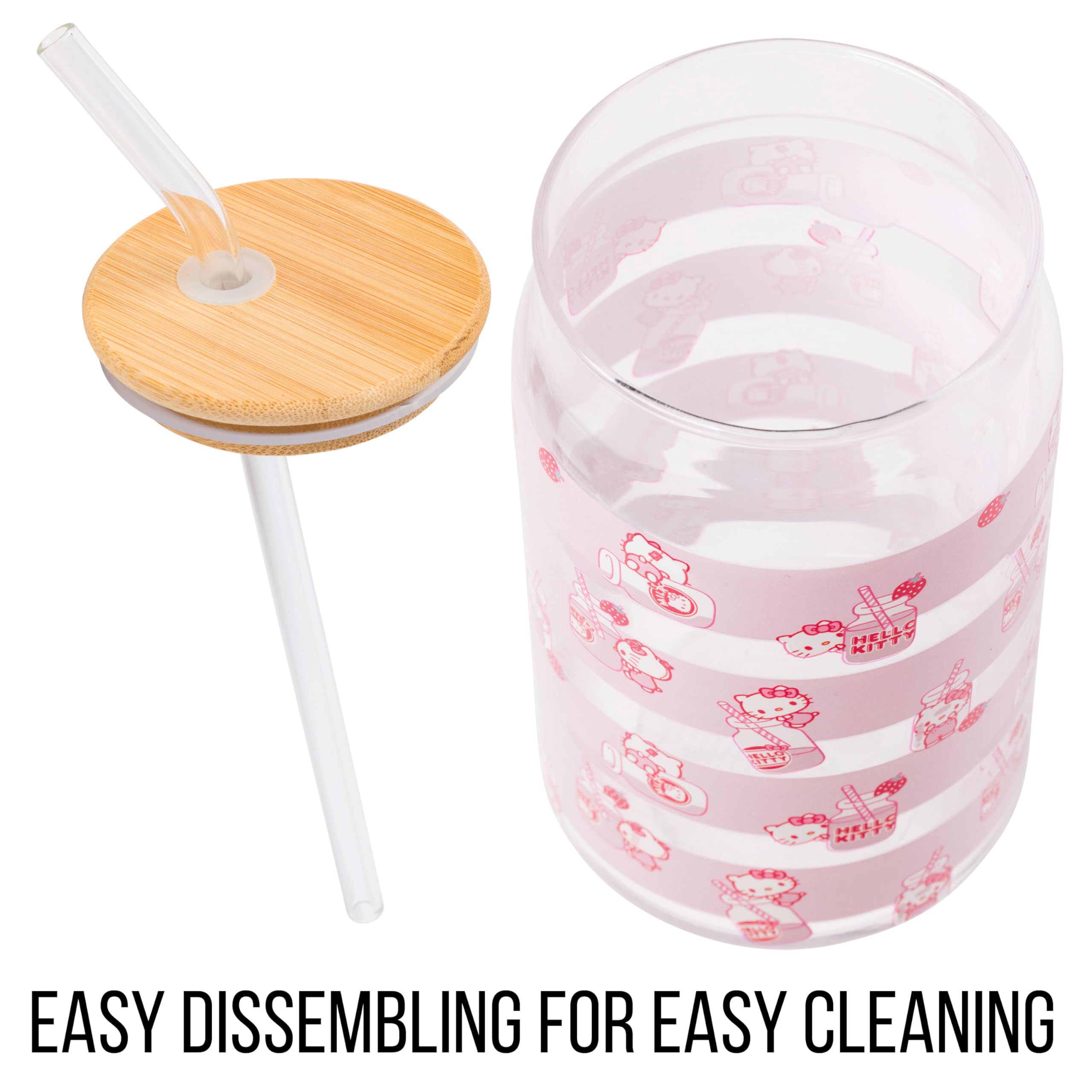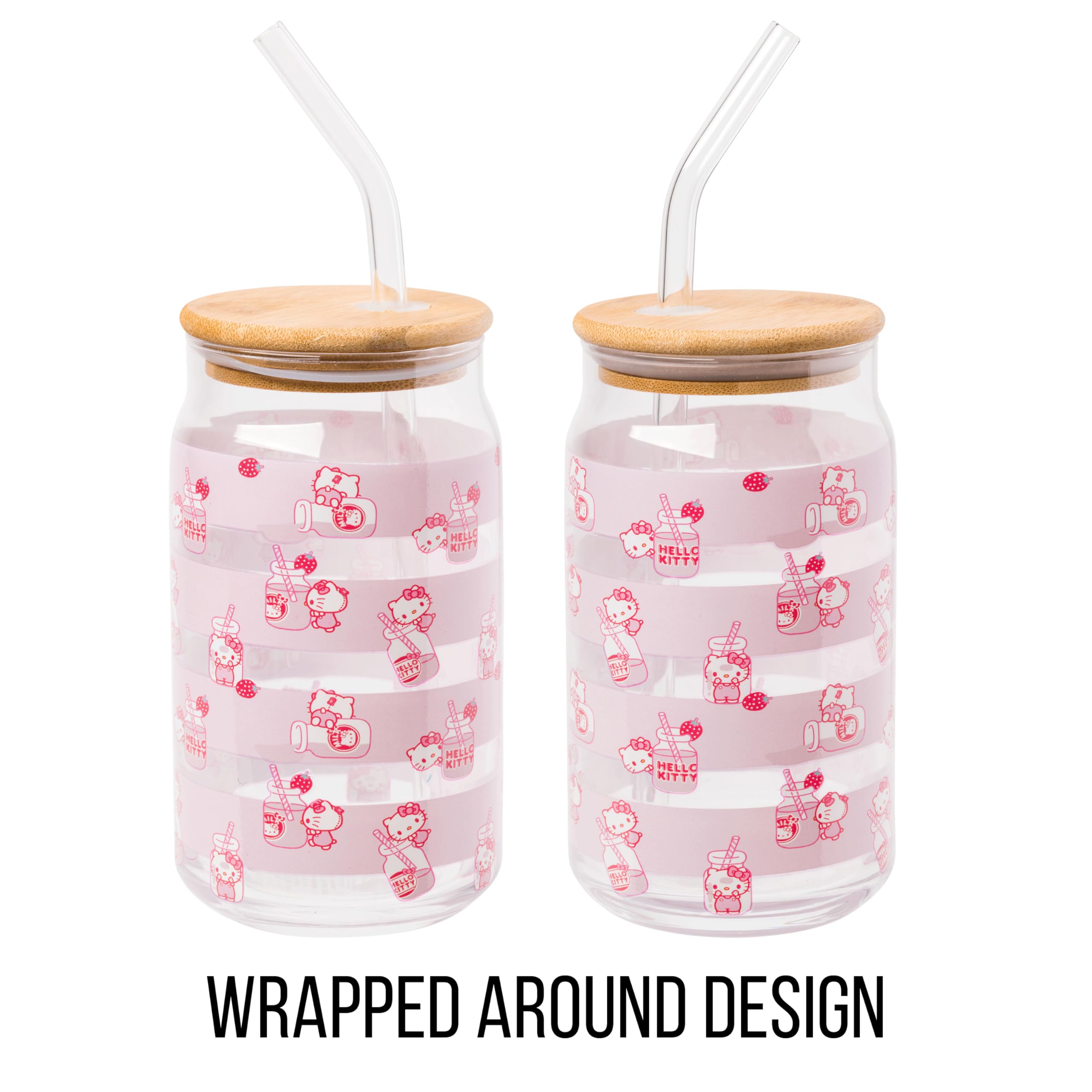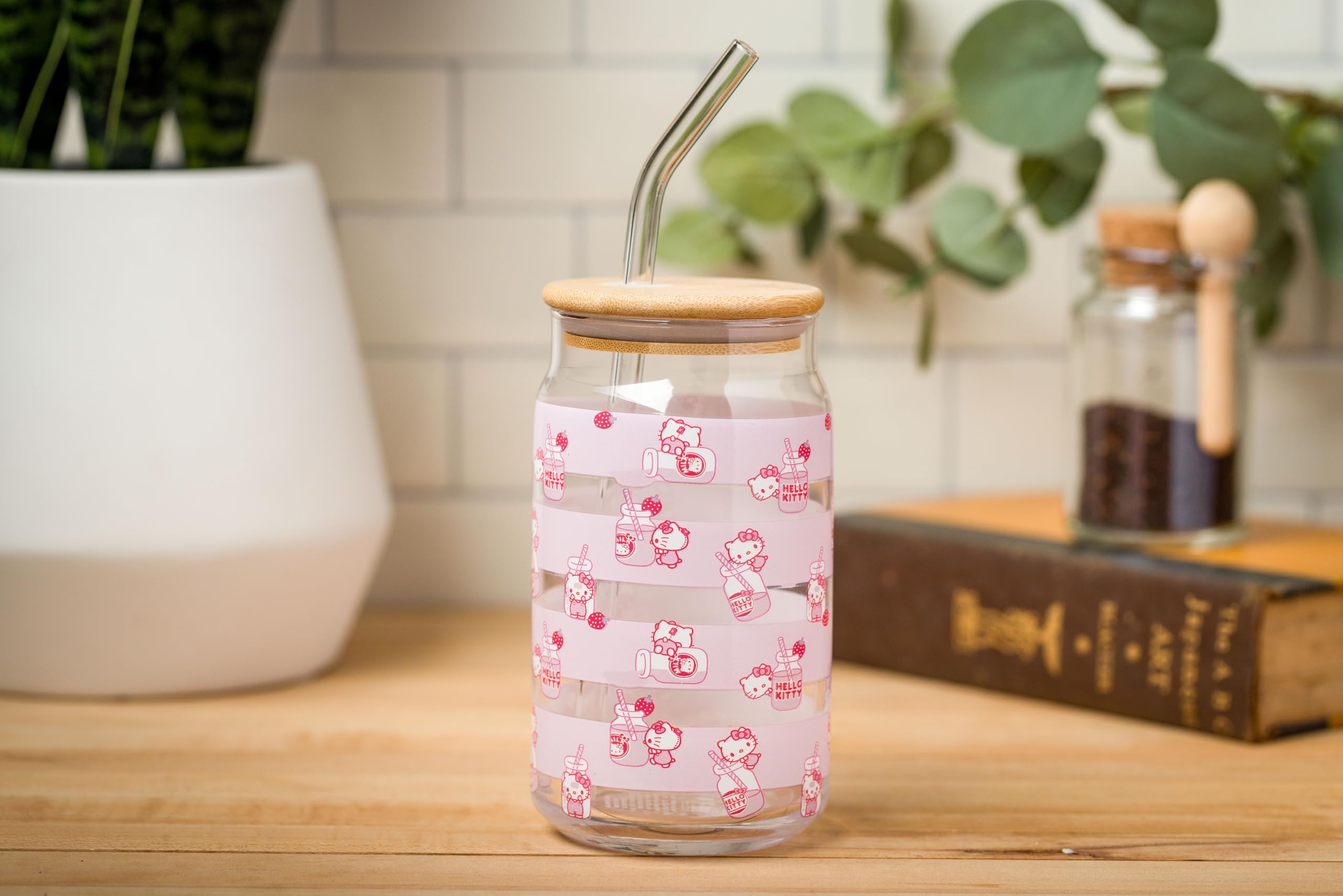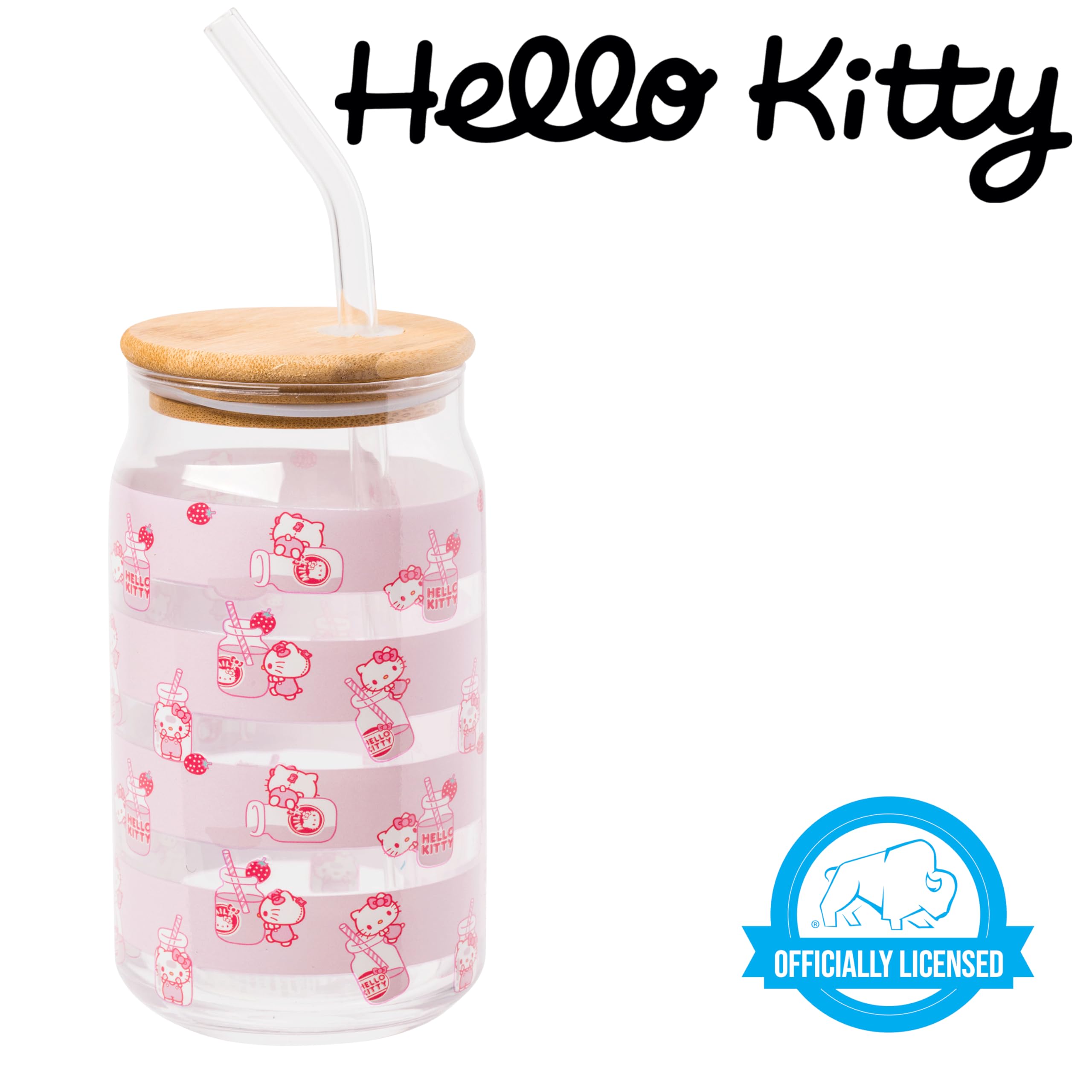 HELLO KITTY TUMBLER: Enjoy your favorite beverages in style with this charming 16 oz glass tumbler featuring an adorable Hello Kitty milk bottle toss design. Comes with a bamboo lid and a reusable glass straw.