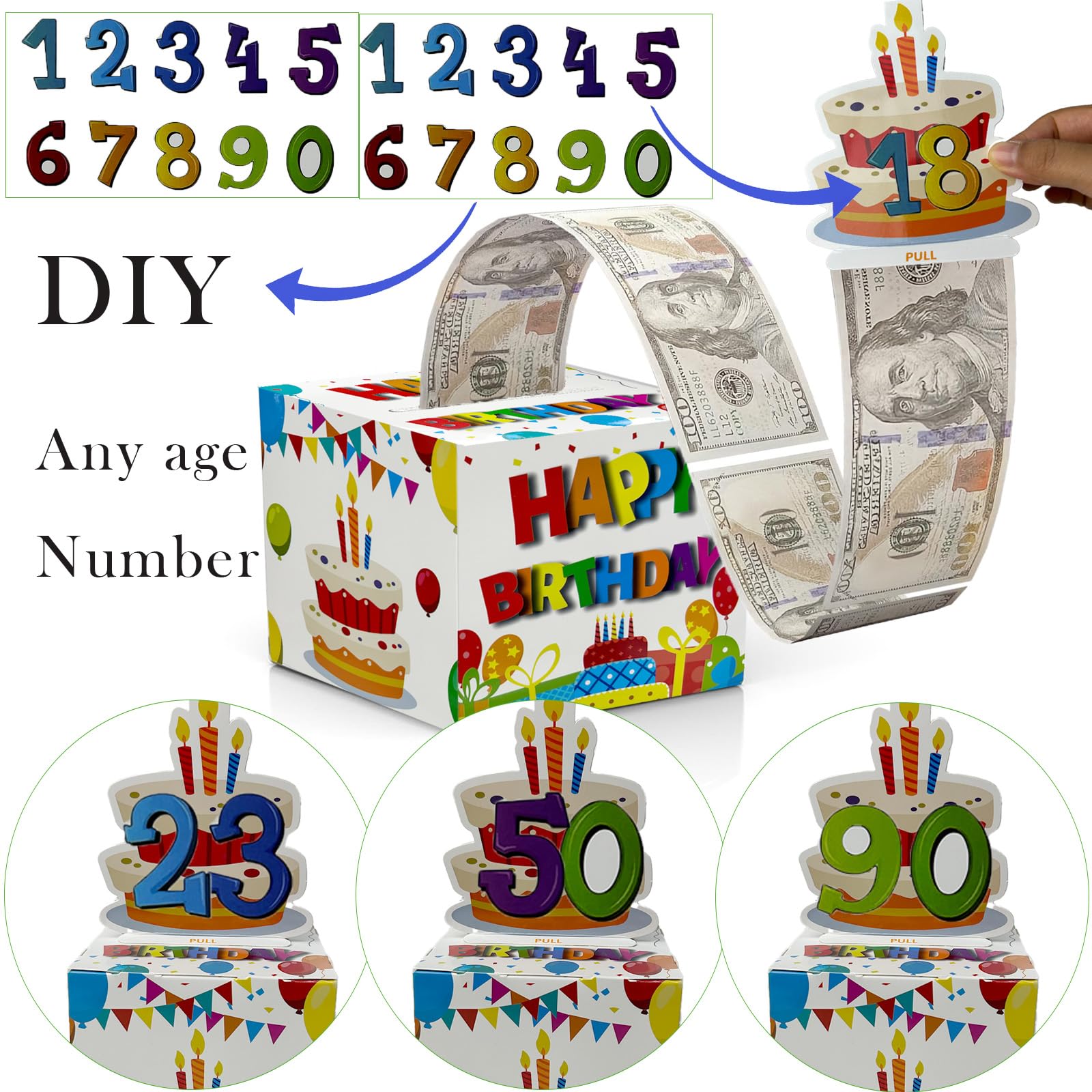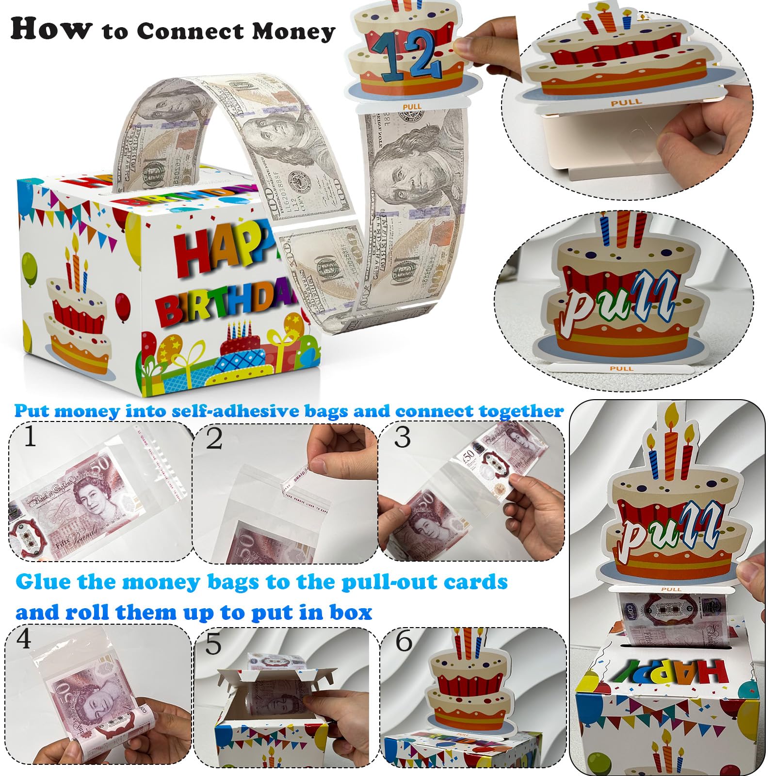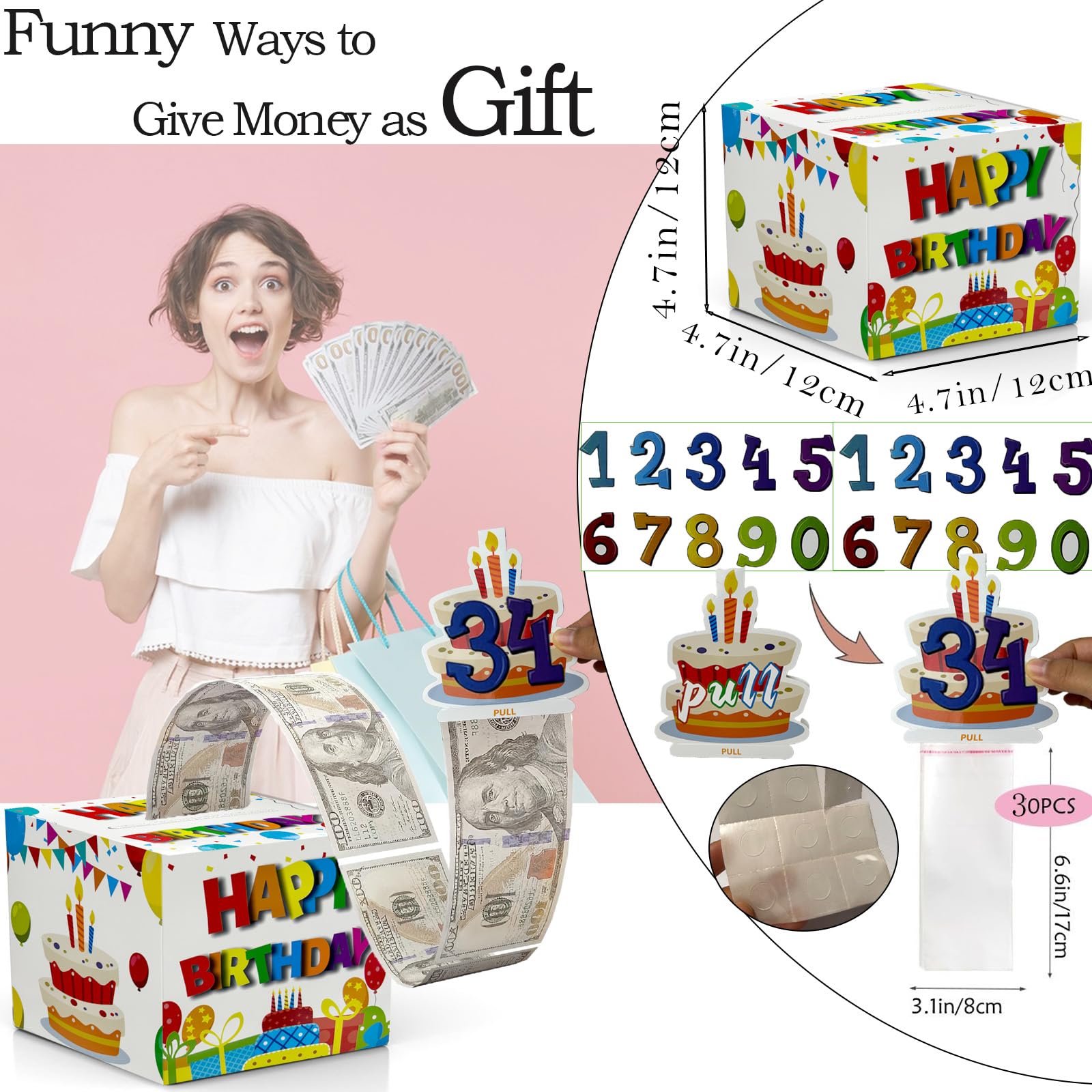 【DIY Surprise Gift】Surprise money gift box includes a beautiful money gift box, a pull out card, 30Pcs self-adhesive bags size is 3.1"*6.6"(dollars size is 2.61" x 6.14 " ). You can DIY money box and put cash (gift certificates/lottery tic kets/blessings) in it as a surprise gift for your family and friends