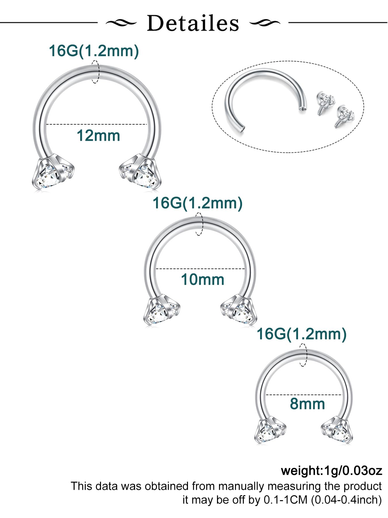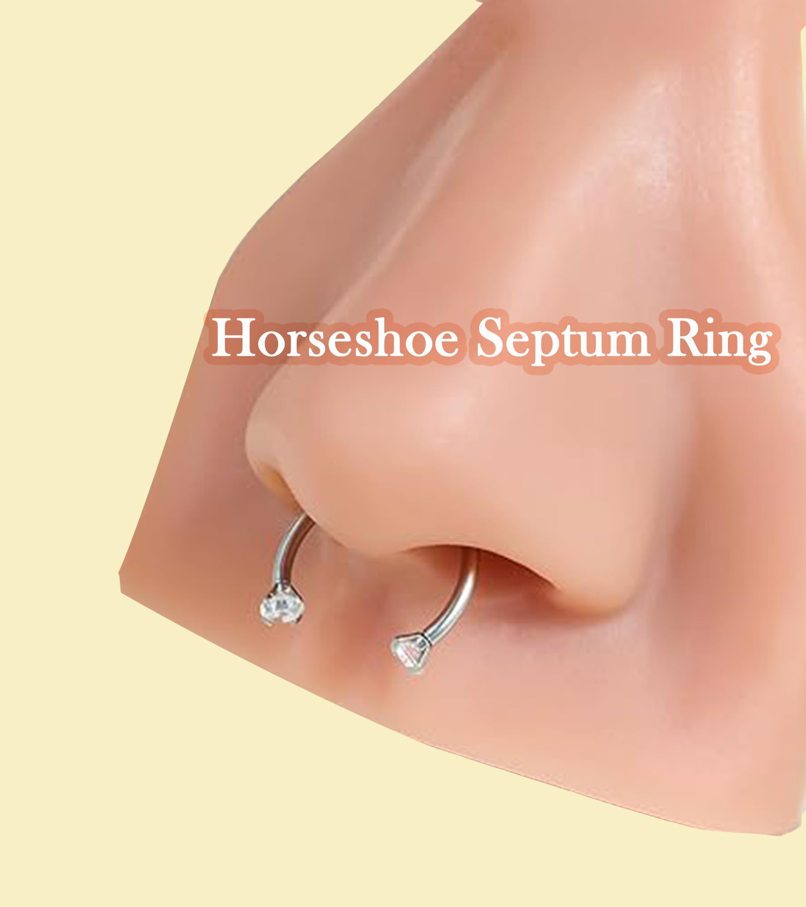 Measurements - silver septum ring 16g (1.2mm), horseshoe septum piercings septum nose ring inner diameter: 5/16"(8mm), 3/8"(10mm), 1/2"(12mm), double gem horseshoe septum ring gem size : 3mm;