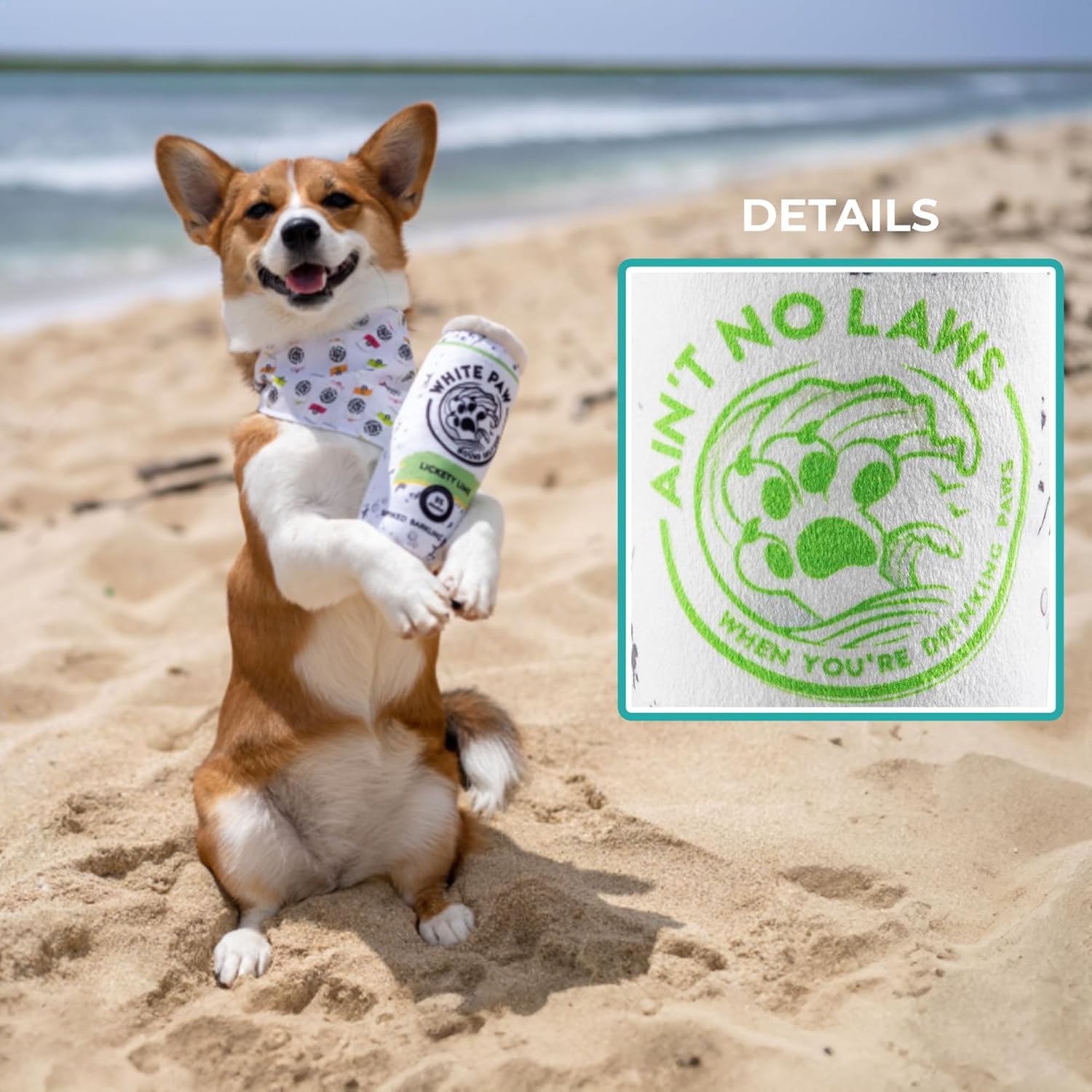 Funny Parody Plush Dog Toy: Give your furry friend a fizzy refreshment by cracking open our White Paw Lickety Lime dog toy. This dog toy features a white and green plush exterior with a built-in squeaker hidden inside. Back details read “Ain’t No Laws When You’re Drinking Paws”. It’s a fun, cute interactive dog toy that turns every playtime into happy hour! One Size 7"x4"x2.5".