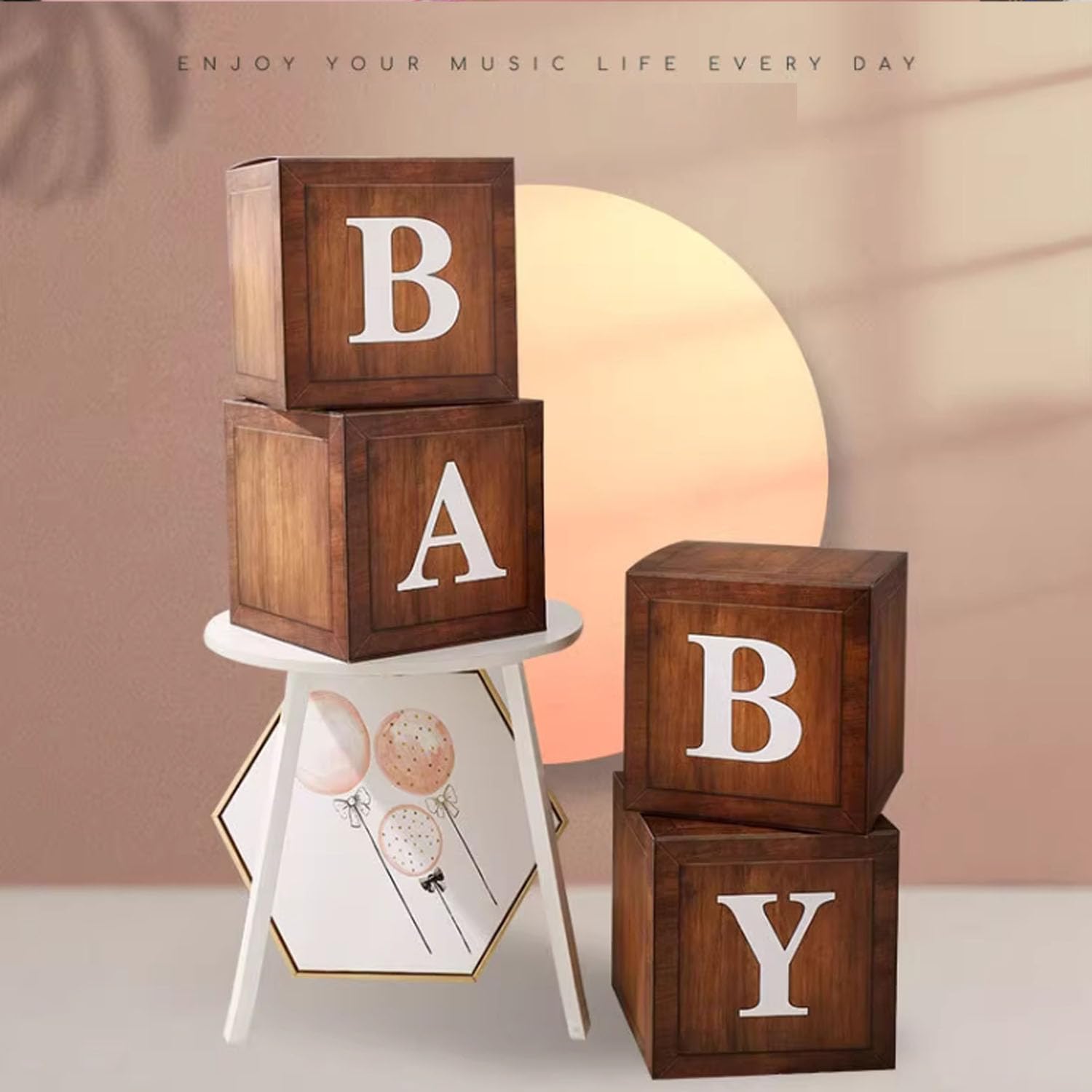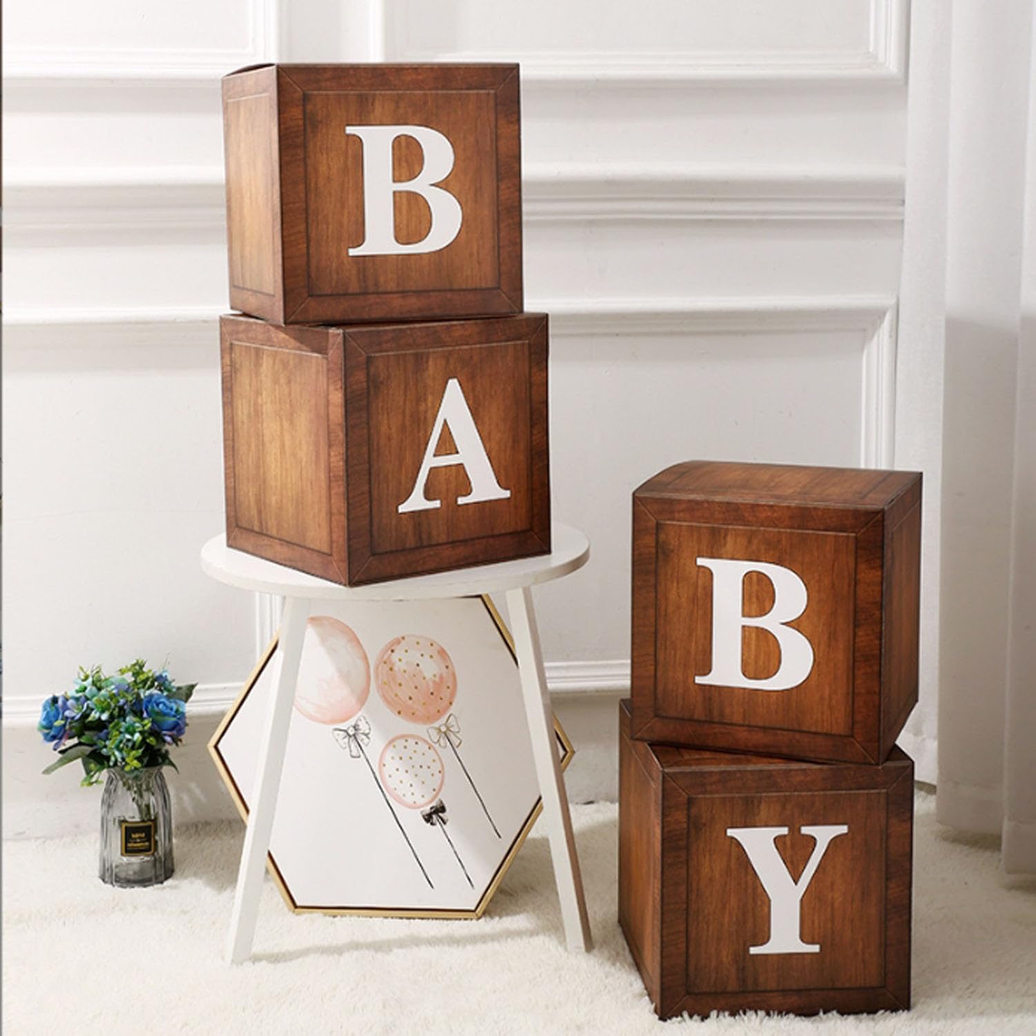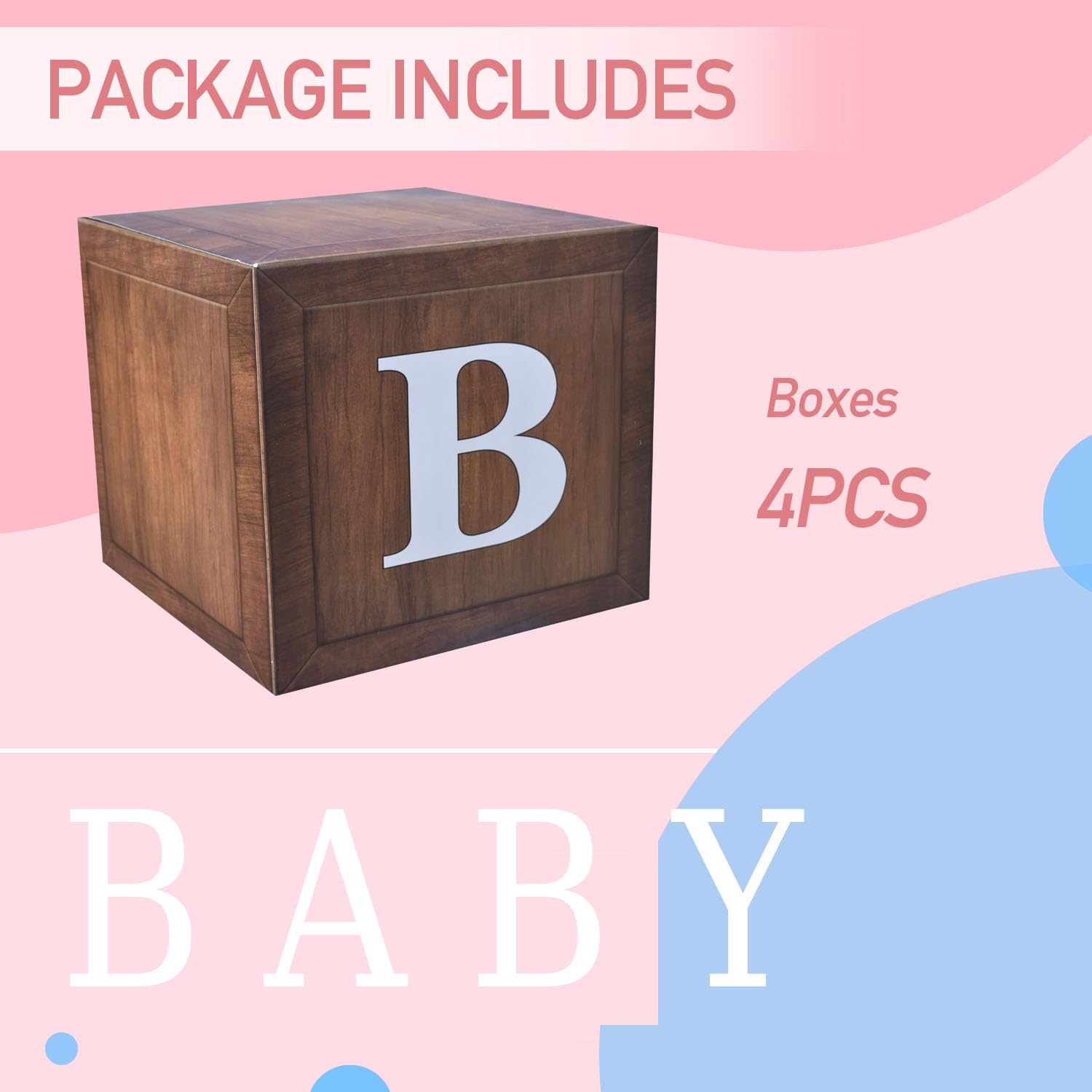 Package Includes: Set of 4 wood grain style balloon boxes with printed letters for baby shower decorations