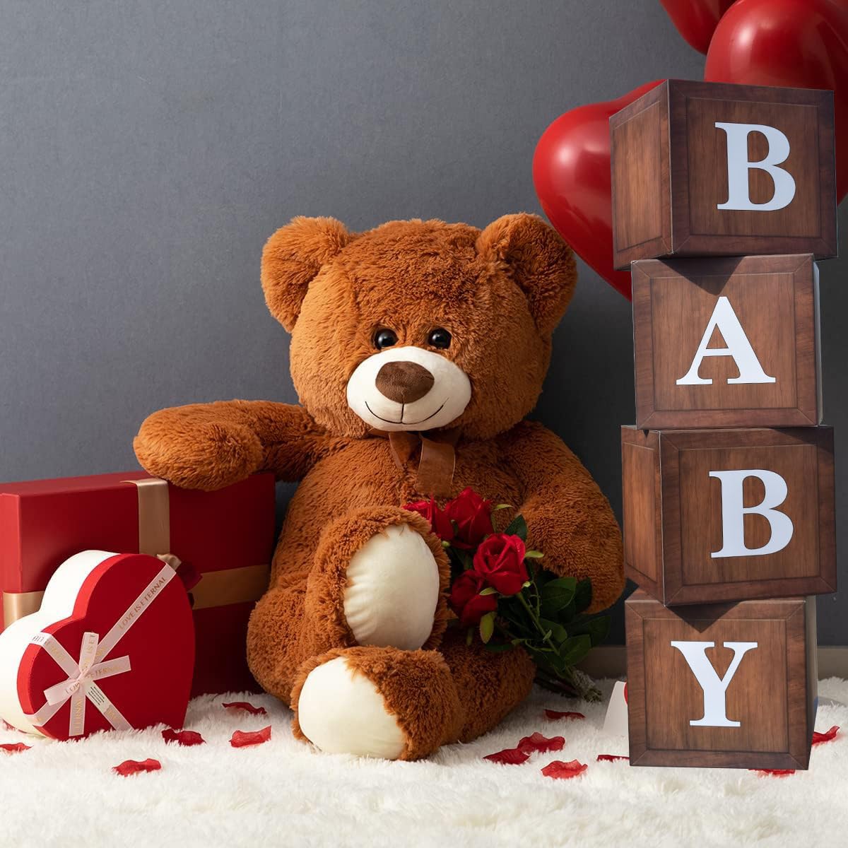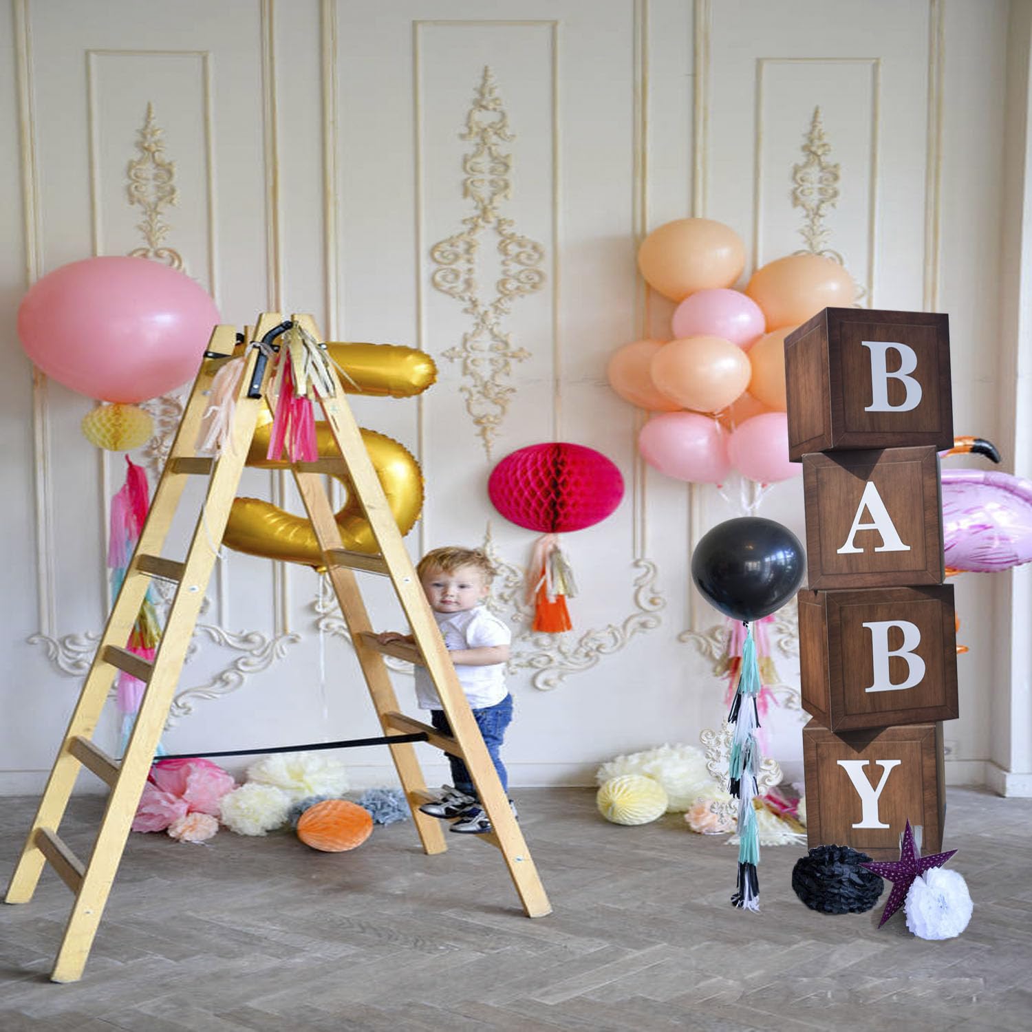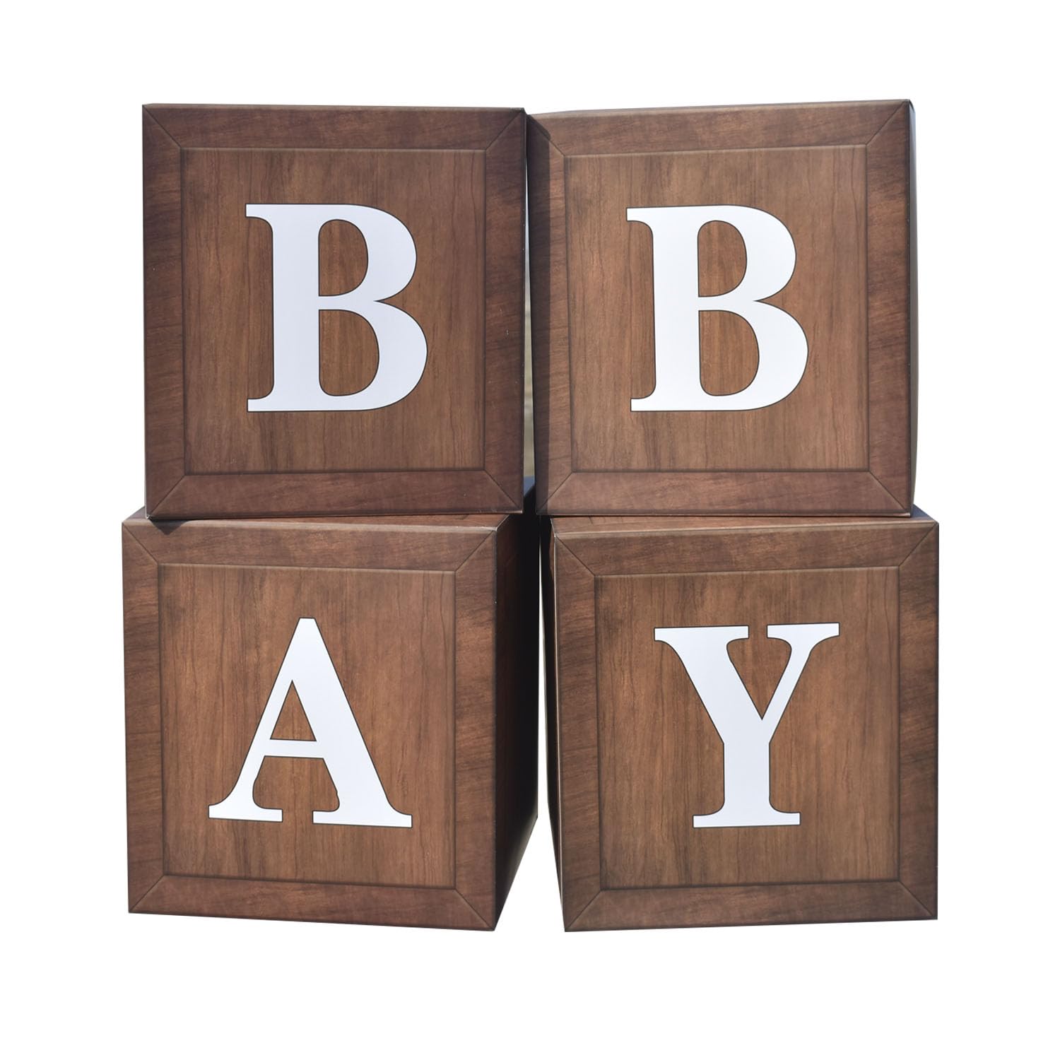 Package Includes: Set of 4 wood grain style balloon boxes with printed letters for baby shower decorations