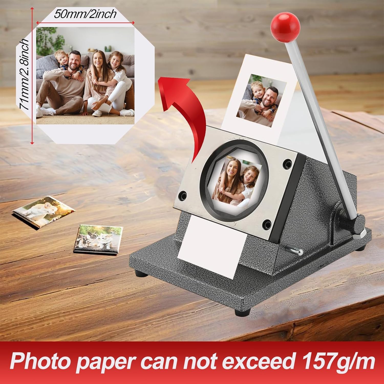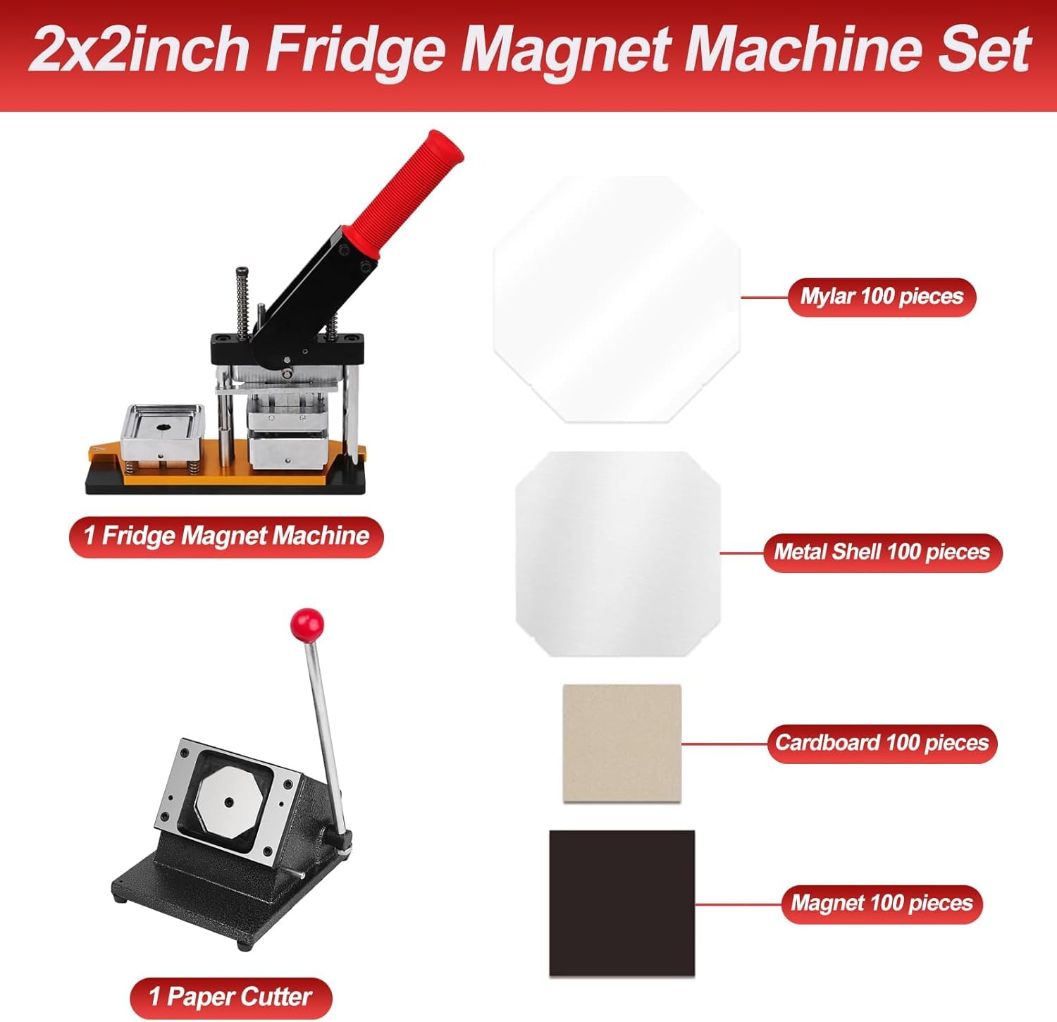 【COMPLETE STARTER KIT - EVERYTHING INCLUDED】Start Creating Right Out of the Box! This complete magnet maker machine kit includes: 1 steel magnet press machine 2" (50mm), 1 cutter, 100 metal plates, 100 plastic films, 100 magnetic sheets and 100 Paper photo. Instantly create custom fridge magnets—no extra purchases needed. Start your DIY project right out of the box