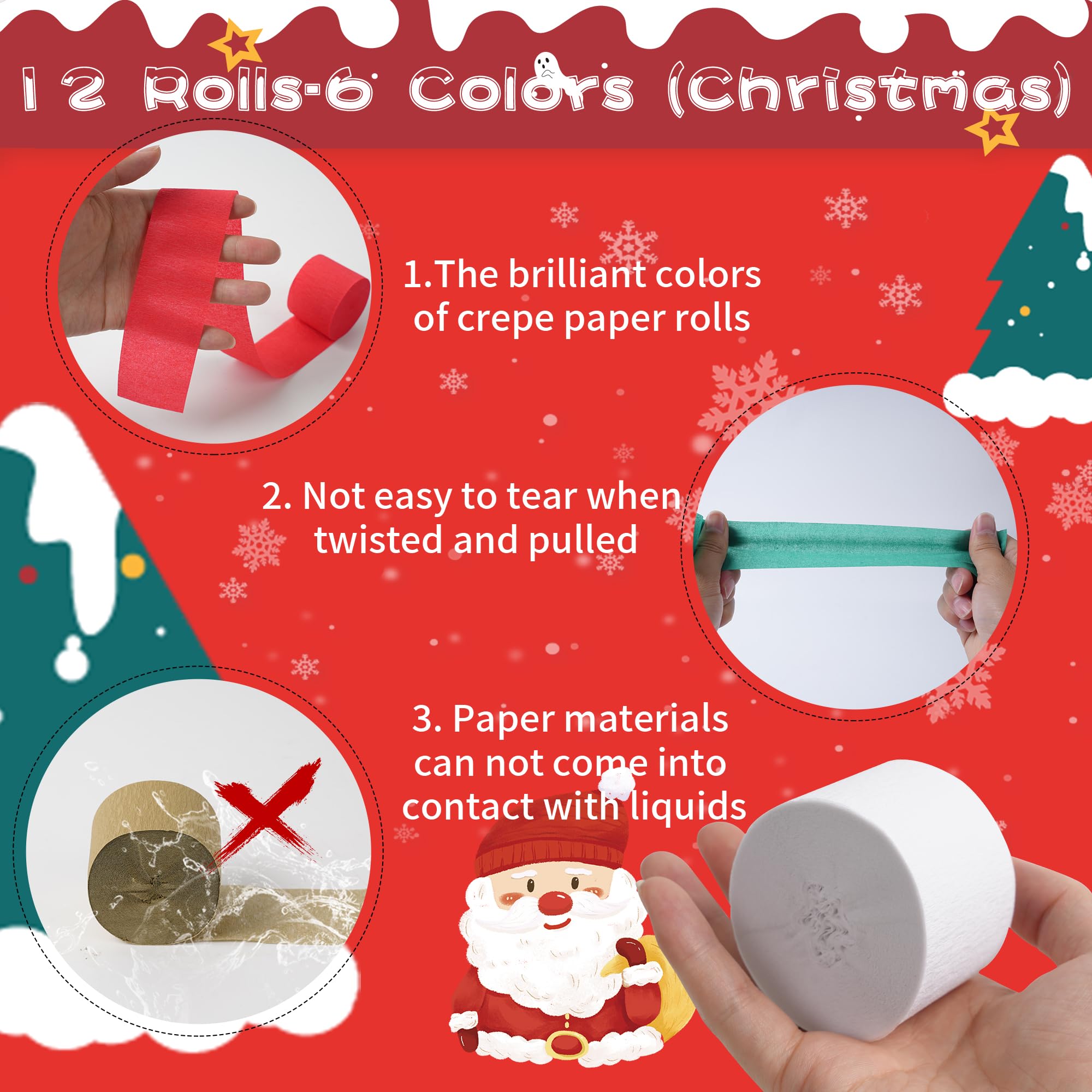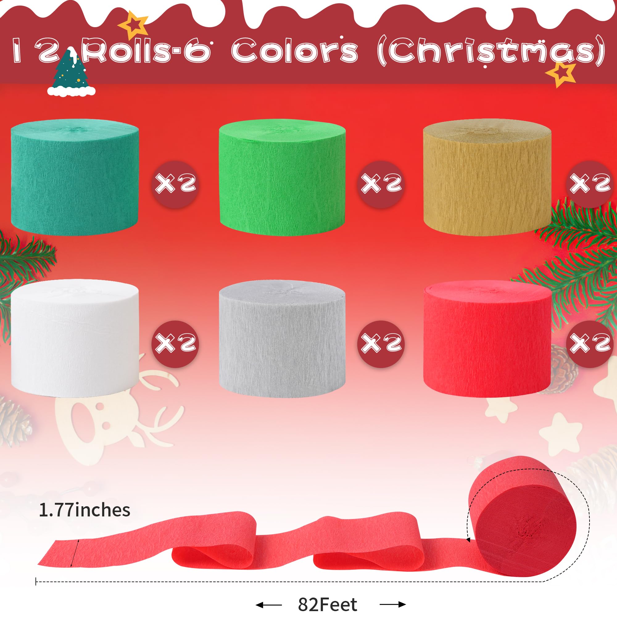 Super Value: 12 rolls of party streamers come in 6 colors, 2 rolls of each color. The 6 colors are Christmas green, red, gold, light green, white, silver. These color combinations are specially designed for Christmas parties.