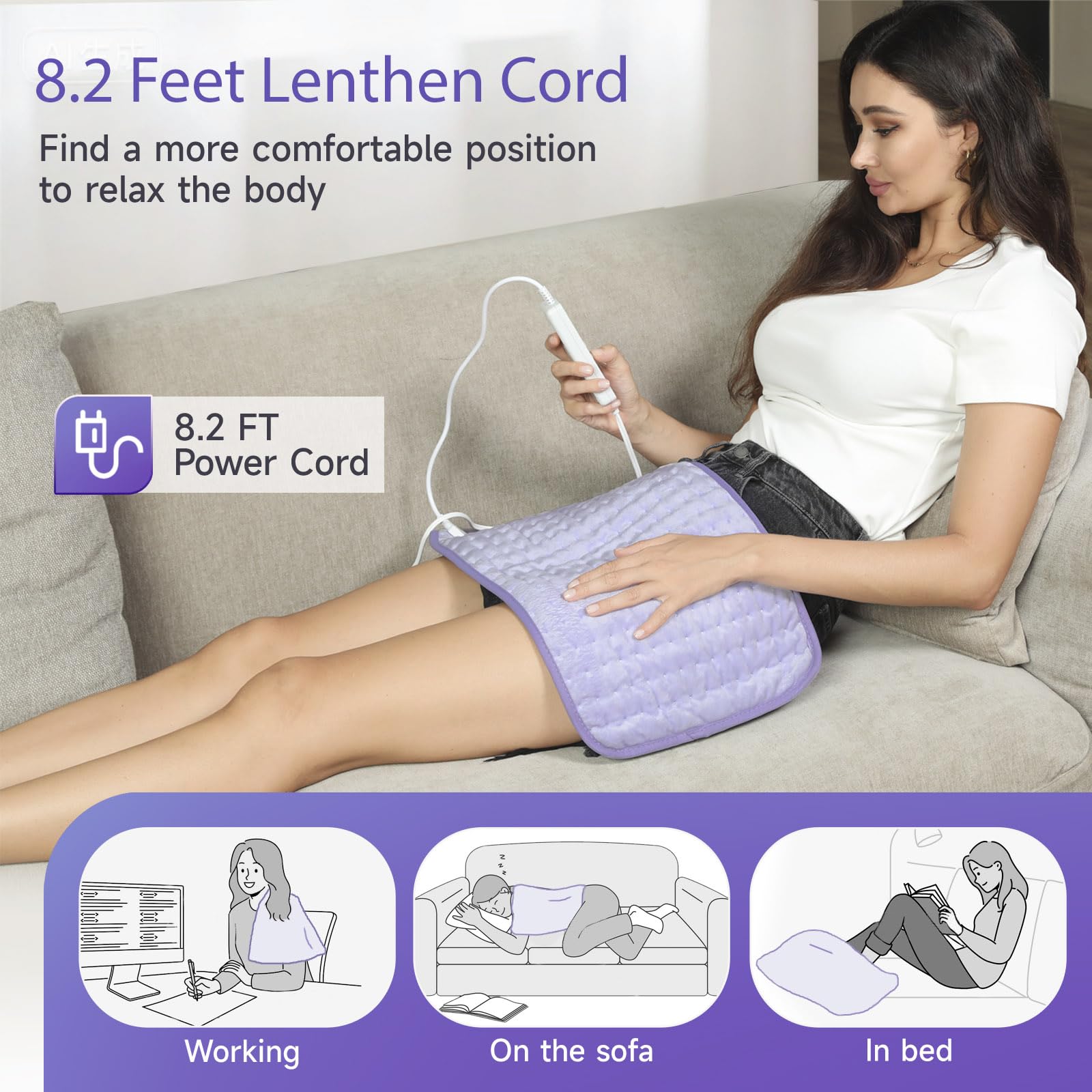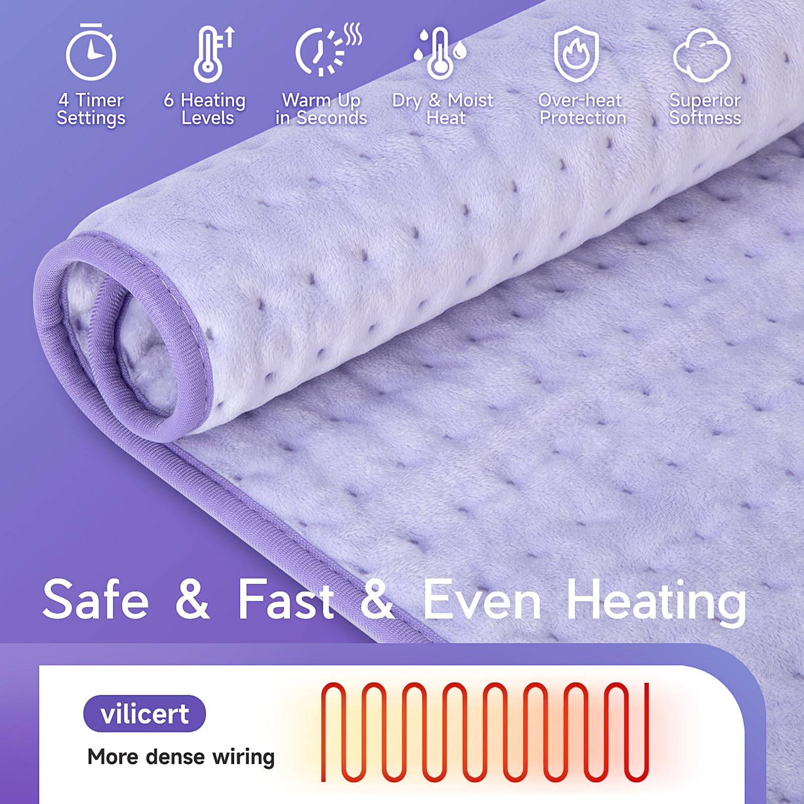 Selectable Size & Extra-Long Cord & Machine Washable: vilicert heating pads offer selectable sizes (12''x24'', 20''x24'', or 17''x33'') and multiple colors for personalized comfort. The 8.2-foot cord provides flexible placement on beds, couches, or chairs to relax yourself. Featuring a removable controller and machine-washable microfiber cover, maintenance is effortless while preserving softness and hygiene