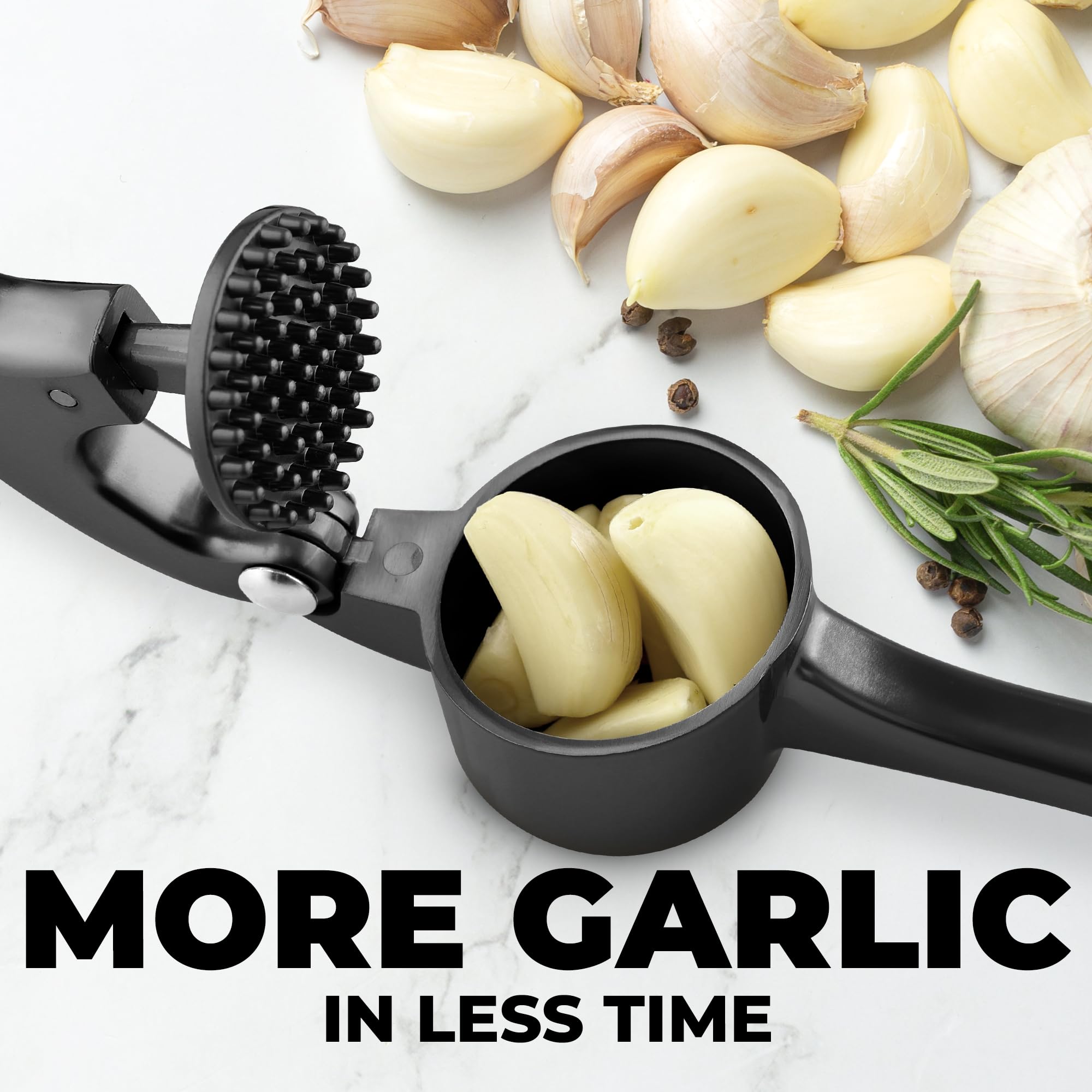 CRUSH AND MINCE UNPEELED CLOVES: No more strong garlic odor or sticky residue lingering on your hands! Our garlic mincer is designed with a comfortable ergonomic handle that requires minimal effort on your wrists and hands to peel, crush, and mince the cloves in one go; yielding delicious garlic paste while the peels stay in the chamber.