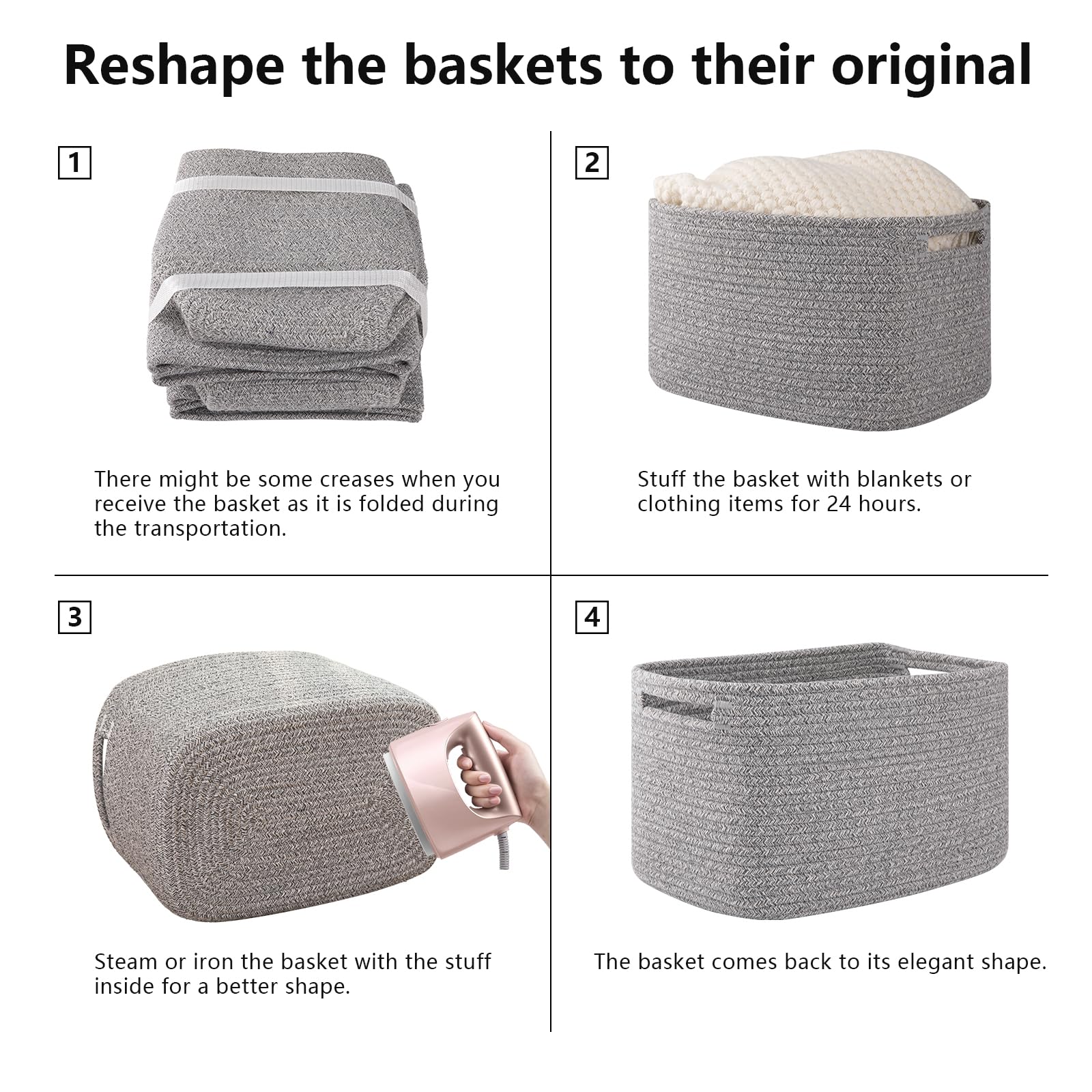Washable: These cube storage bins can be washed by hand or machine with gentle detergent. NOTE: These cotton rope baskets are folded when shipping, but it will turn back to its elegant shape quickly if you fill it with some towels or clothing, and iron is great idea to remove the creases