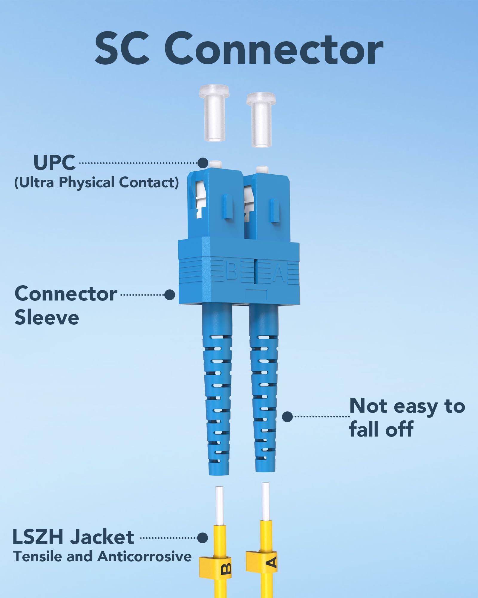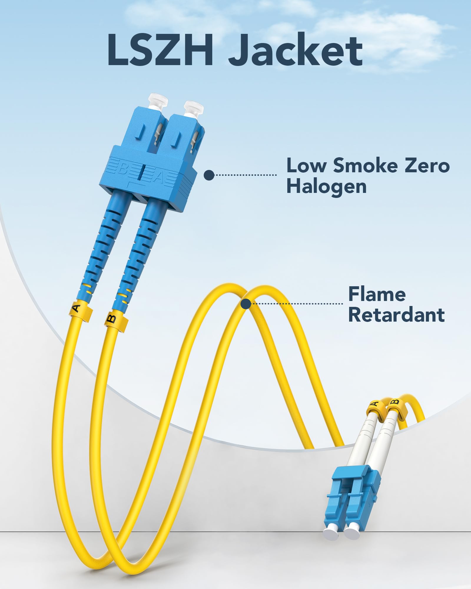 【Premium Cable】Our sc to lc fiber patch cable boasts a 9/125μm fiber core, Ultra Physical Contact (UPC) Ferrule,an LSZH Jacket, and also complies with the TIA/EIA 568-C.3 industry standards, guaranteeing outstanding performance and long-lasting durability.