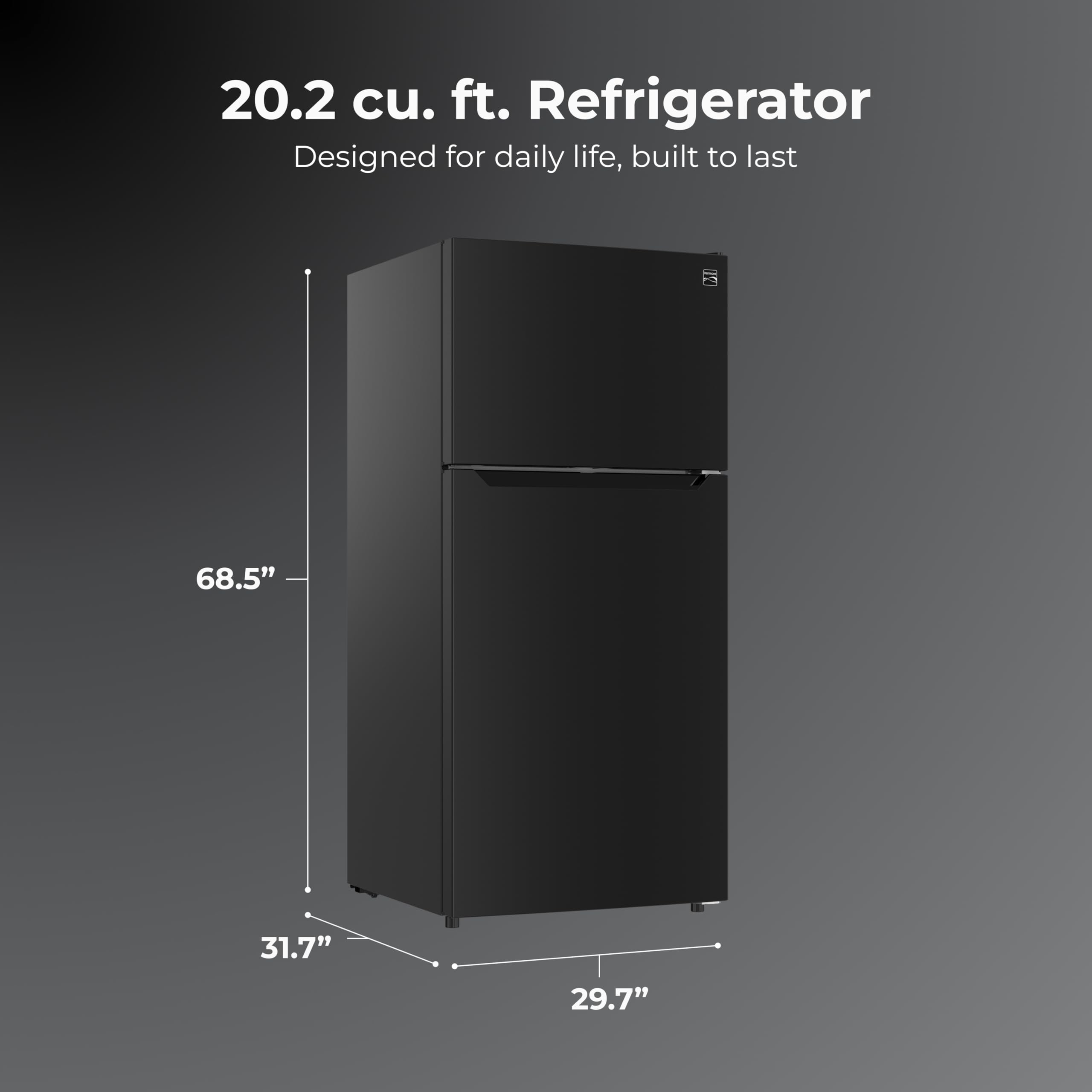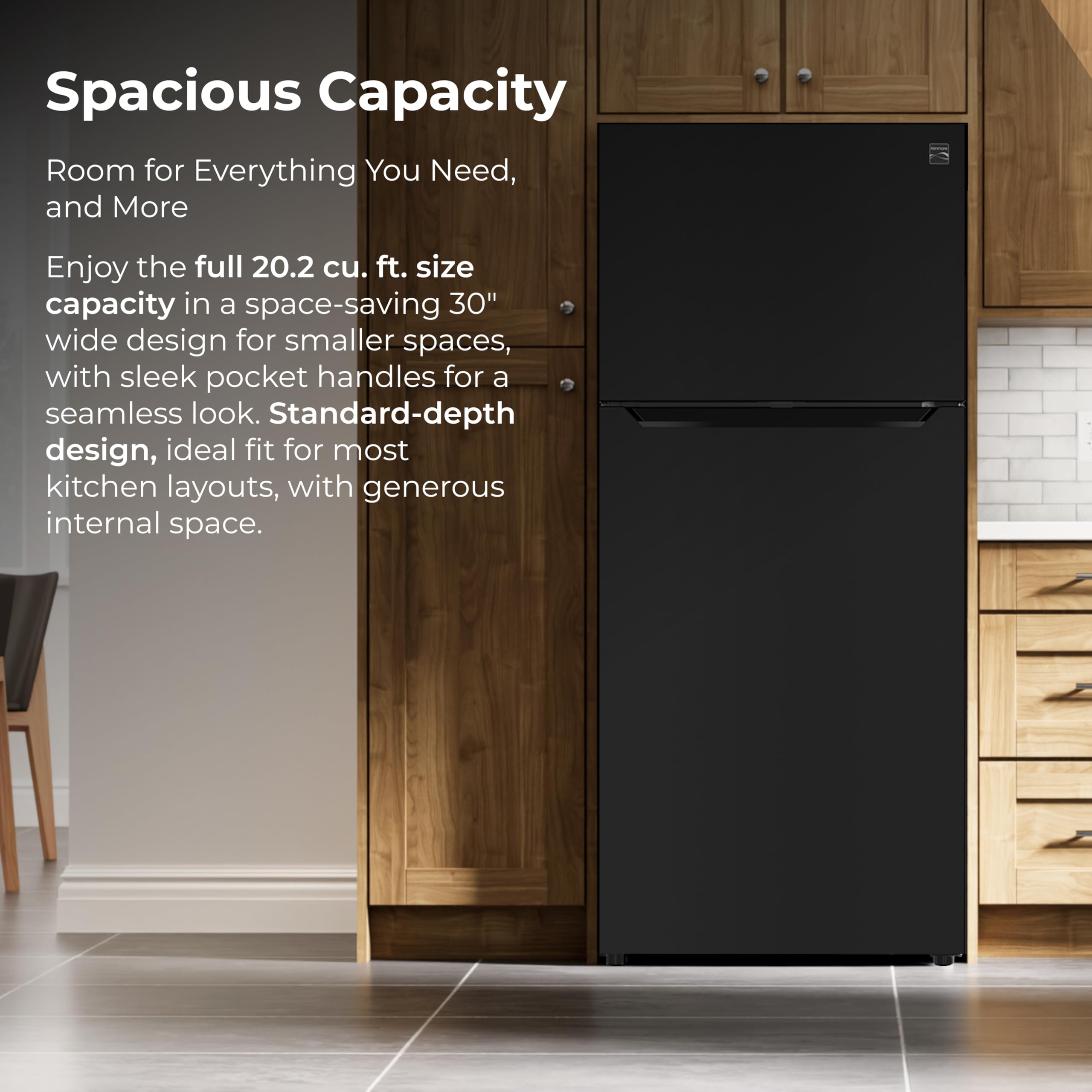 Bring powerful performance and flexible storage to your kitchen or garage with the Kenmore 30" Top-Freezer Refrigerator. With 20.2 cu. ft. of capacity, this ENERGY STAR certified refrigerator offers the space you need without taking over your kitchen. The Inverter Compressor maintains consistent temperatures while using less energy and creating less noise than traditional compressors, helping to keep your food fresher longer. Designed to perform in a range of environments, it’s garage ready with a built-in temperature sensor for reliable cooling from 45°F to 110°F. Inside, full-width spill-proof glass shelves and 6 clear door bins (including a gallon-sized bin) make it easy to organize everything from party trays to condiments. Two humidity-controlled crispers keep produce at peak freshness, while LED lighting ensures you’ll never lose track of what’s inside. Finished with a sleek, flush-front design and reversible doors for flexible installation, this fridge is ready to work wherever you need it most.