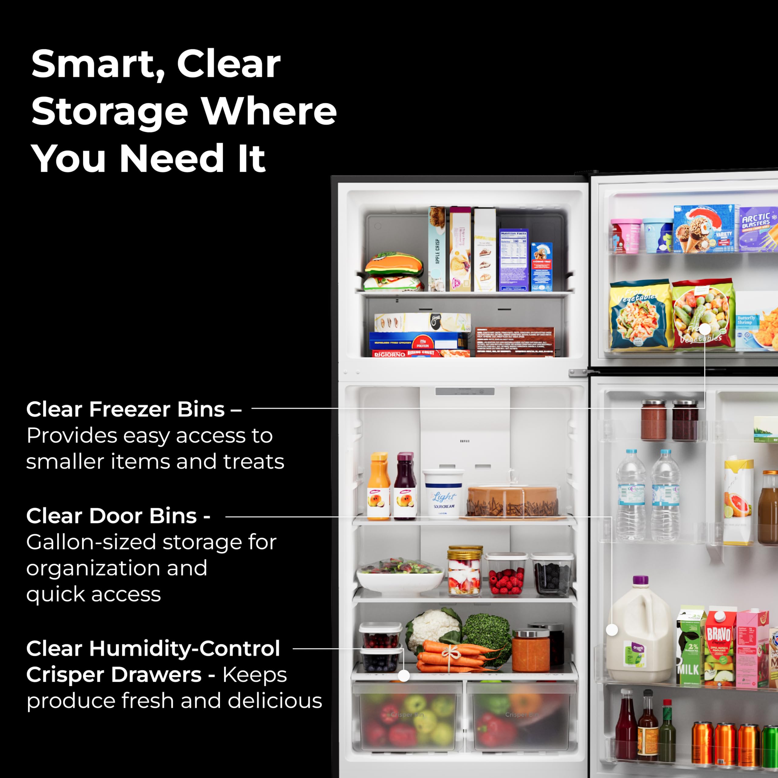 Adjustable Glass Shelves + Gallon Door Storage: Tempered spill-proof shelves adjust to fit sheet cakes, party trays, or tall pitchers. 6 clear bins (including a gallon bin) keep items organized and easy to grab
